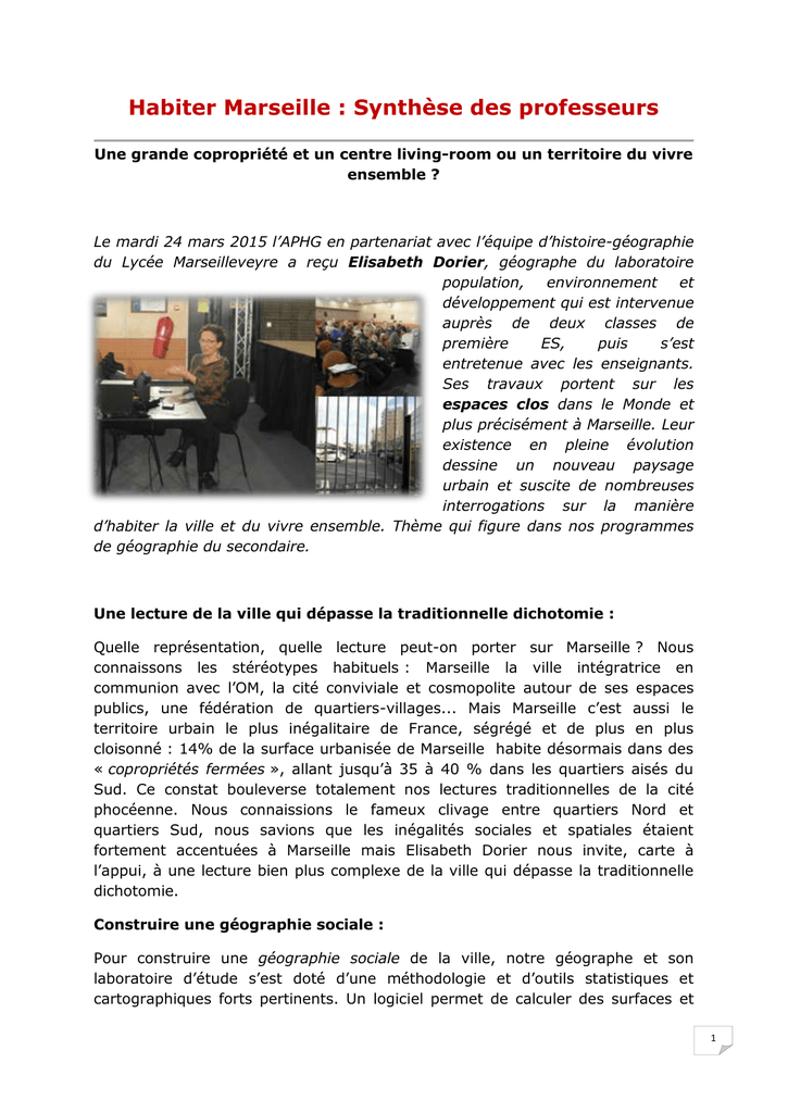Habiter Marseille : Synthèse des professeurs Une grande copropriété et un centre living-room ou un territoire du vivre ensemble ? Le mardi 24 mars 2015 l’APHG en partenariat avec l’équipe d’histoire-géographie du Lycée Marseilleveyre a reçu Elisabeth Dorier, géographe du laboratoire population, environnement et développement qui est intervenue auprès de deux classes de première ES, puis s’est entretenue avec les enseignants. Ses travaux portent sur les espaces clos dans le Monde et plus précisément à Marseille. Leur existence en pleine évolution dessine un nouveau paysage urbain et suscite de nombreuses interrogations sur la manière d’habiter la ville et du vivre ensemble. Thème qui figure dans nos programmes de géographie du secondaire. Une lecture de la ville qui dépasse la traditionnelle dichotomie : Quelle représentation, quelle lecture peut-on porter sur Marseille ? Nous connaissons les stéréotypes habituels : Marseille la ville intégratrice en communion avec l’OM, la cité conviviale et cosmopolite autour de ses espaces publics, une fédération de quartiers-villages... Mais Marseille c’est aussi le territoire urbain le plus inégalitaire de France, ségrégé et de plus en plus cloisonné : 14% de la surface urbanisée de Marseille habite désormais dans des « copropriétés fermées », allant jusqu’à 35 à 40 % dans les quartiers aisés du Sud. Ce constat bouleverse totalement nos lectures traditionnelles de la cité phocéenne. Nous connaissions le fameux clivage entre quartiers Nord et quartiers Sud, nous savions que les inégalités sociales et spatiales étaient fortement accentuées à Marseille mais Elisabeth Dorier nous invite, carte à l’appui, à une lecture bien plus complexe de la ville qui dépasse la traditionnelle dichotomie. Construire une géographie sociale : Pour construire une géographie sociale de la ville, notre géographe et son laboratoire d’étude s’est doté d’une méthodologie et d’outils statistiques et cartographiques forts pertinents. Un logiciel permet de calculer des surfaces et 1 d’identifier des espaces spécifiques et notamment les fameuses « résidences encloses ». Leur identification est d’une grande utilité pour les pouvoirs publics (marins-pompiers, élus, urbanistes ...) qui ont d’ailleurs passé une commande auprès du laboratoire de géographie urbaine. Ces espaces clos engendrent de multiples problèmes : Circulation des usagers (piétons, vélos), contournement des flux des automobilistes créant des goulots d’étranglement dans certains points nodaux de la ville... Vers le modèle d’une ville cloisonnée : On voit se constituer le modèle d’une ville cloisonnée, constituée de noyaux privatifs en copropriété qui ne correspondent plus à la notion traditionnelle de quartier. Notre géographe n’hésite pas à nous faire part d’une typologie qui s’appuie sur une observation de terrain et d’enquêtes réalisées par ses étudiants doctorants dont les recherches ont été médiatisées. On découvre que ces « enclosures » sont diverses et touchent différentes catégories sociales pas seulement les plus aisés de la société. Tous les types d’habitats tendent à se fermer. Certes les plus aisés sont fortement représentés dans des lotissements emblématiques comme les Haut de Périer où certaines formes rappellent le contexte latino-américain ; mais aussi les classes moyennes ainsi que les couches populaires qui se sentent abandonnées n’hésitant pas à se barricader constituant parfois des barrières « sauvages » qui ne respectent pas les normes de bases (accès aux handicapés, passage d’une poussette pour enfant...) comme par exemple le lotissement des Castors. Certaines routes ou chemins d’accès sont bloqués comme au Coin Jolie devenu « coin bani » où les usagés doivent effectuer le contournement d’une copropriété pour se rendre à l’école communale du quartier. Des espaces verts s’avèrent inaccessibles barrés par des copropriétés... On peut ainsi observer un foisonnement de fermetures pour tous les types d’habitats : rues privatisées, copropriétés d’immeubles, lotissements pavillonnaires et « résidentialisation » de HLM. Cette urbanisation en noyaux privatisés ne résulte pas seulement des seules inégalités sociales mais d’une géohistoire spécifique à Marseille. Un empilement d’héritages explique certains découpages d’où la nécessité de porter un regard rétrospectif en étudiant le cadastres, l’évolution des propriétés, repérer les trames anciennes notamment les fameuses bastides qui ont été souvent transformées en bloc ou morcelées en lotissement-copropriété et fermées. L’étude des délibérations des conseils municipaux peut aider à la compréhension, les droits d’usages sont aussi utiles à repérer... On constate que la loi peut aller dans le sens des enclosures, si par exemple une voierie est entretenues pendant trente ans par les résidents, elle peut-être fermée. D’une manière générale on remarque que les fermetures se font souvent sans concertation avec les habitants du quartier, des clôtures spontanées émergeant un peu partout. Cette tendance ne semble pas s’arrêter, les promoteurs immobiliers prennent le relais proposant des produits sécurisés : On construit dans le sécuritaire et le durable comme la Closerai Toscane ou les Hauts de Mazargues. L’idée est de 2 proposer une résidence fermée avec un espace vert à l’intérieur du domaine privé dans un quartier qui est en fait à proximité de la Cayolle quartier à risque. Idem pour les terrains de la Méditerranée à proximité du centre commercial grand littoral dans le XVème arrondissement. L’objectif étant d’attirer des classes moyennes et de favoriser des entrées fiscales dans des zones où les taux de chômage sont parmi les plus élevés de France. Dans quelle ville vivrons-nous de