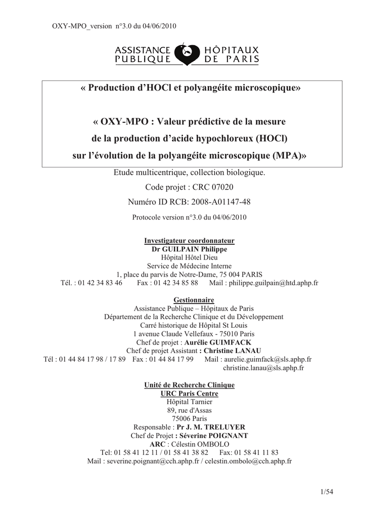 OXY-MPO_version n°3.0 du 04/06/2010 « Production d’HOCl et polyangéite microscopique» « OXY-MPO : Valeur prédictive de la mesure de la production d’acide hypochloreux (HOCl) sur l’évolution de la polyangéite microscopique (MPA)» Etude multicentrique, collection biologique. Code projet : CRC 07020 Numéro ID RCB: 2008-A01147-48 Protocole version n°3.0 du 04/06/2010 Investigateur coordonnateur Dr GUILPAIN Philippe Hôpital Hôtel Dieu Service de Médecine Interne 1, place du parvis de Notre-Dame, 75 004 PARIS Tél. : 01 42 34 83 46 Fax : 01 42 34 85 88 Mail : [email protected] Gestionnaire Assistance Publique – Hôpitaux de Paris Département de la Recherche Clinique et du Développement Carré historique de Hôpital St Louis 1 avenue Claude Vellefaux - 75010 Paris Chef de projet : Aurélie GUIMFACK Chef de projet Assistant : Christine LANAU Tél : 01 44 84 17 98 / 17 89 Fax : 01 44 84 17 99 Mail : [email protected] [email protected] Unité de Recherche Clinique URC Paris Centre Hôpital Tarnier 89, rue d'Assas 75006 Paris Responsable : Pr J. M. TRELUYER Chef de Projet : Séverine POIGNANT ARC : Célestin OMBOLO Tel: 01 58 41 12 11 / 01 58 41 38 82 Fax: 01 58 41 11 83 Mail : [email protected] / [email protected] 1/54 OXY-MPO_version n°3.0 du 04/06/2010 Directeurs scientifiques Directeur scientifique médical : Tel : 01.58.41.20.31 Pr Luc Mouthon Hôpital Cochin Service de Médecine Interne 27 rue du Faubourg St-Jacques, 75014 Paris Fax : 01.58.41.15.79 Mail : [email protected] Directeur scientifique biologique : Tel : 01.58.41.20.07 Dr Frédéric Batteux Hôpital Cochin Service d’Immunologie Biologique 27 rue du Faubourg St-Jacques, 75014 Paris Fax : 01.58.41.20.08 Mail : [email protected] Analyse biologique Tel : 01.58.41.20.07 Dr Batteux Frédéric et Dr Bernard Weill Hôpital Cochin Service d’Immunologie Biologique 27 rue du Faubourg St-Jacques, 75014 Paris Fax : 01.58.41.20.08 Mail : [email protected] Mail : [email protected] Statistiques : Pr Joël Coste Hôpital Cochin Service d’Informatique Médicale 27 rue du Faubourg St-Jacques, 75014 Paris Tel : 01.58.41.31.54 Fax : 01.58.41.19.61 Mail : [email protected] 2/54 OXY-MPO_version n°3.0 du 04/06/2010 Liste des centres : N° Centre centre 1 Médecine Interne Cochin 2 Médecine Interne Lille 3 4 5 6 7 8 9 Rhumatologie CH Le Mans EFS St Vincent de Paul ImmunoBiologie Médecine Interne Hôtel-Dieu Néphrologie HEGP Médecine interne – Néphrologie CH Valenciennes Néphrologie Hôtel Dieu Nantes Médecine Interne Hôtel Dieu Nantes Investigateur principal Collaborateurs Pr Loïc Guillevin Dr Christian Pagnoux Pr Hachulla Eric Pr Hatron Pierre-Yves Dr David Launay Dr Marc Lambert Dr Sandrine Morell-Dubois Dr Hilaire Charlanne Dr Puéchal Xavier Dr Woimant Geneviève Dr Puydupin Daniel Dr Weill Bernard Dr Batteux Frédéric Dr Claire Goulvestre Dr Philippe Guilpain Dr Alexandre Karras Pr Christian Jacquot Dr Xavier Kyndt Dr Philippe Vanhille Dr Fadi Fakhouri Pr Hamidou 3/54 OXY-MPO_version n°3.0 du 04/06/2010 Résumé du protocole Titre de l’étude OXY-MPO Valeur prédictive de la mesure de la production d’acide hypochloreux (HOCl) sur l’évolution de la polyangéite microscopique (MPA) Etat de la question Les vascularites systémiques sont définies histologiquement par la mise en évidence d’une inflammation de la paroi vasculaire. Au sein des vascularites systémiques, les vascularites ANCA-positives constituent un groupe d’affections qui touchent préférentiellement les vaisseaux de petit calibre et qui sont associées à la présence dans le sérum des malades d’autoanticorps anti-cytoplasme de polynucléaire neutrophile (ANCA). Le groupe des vascularites ANCA-positives comprend la granulomatose de Wegener (GW), le syndrome de Churg et Strauss (SCS) et la polyangéite microscopique (MPA). La protéinase 3 (PR3) et la myéloperoxydase (MPO) sont les cibles antigéniques des ANCA. Toutes deux sont présentes dans les granules des polynucléaires neutrophiles (PNN), et sont à l’origine d’une fluorescence cytoplasmique (cANCA) et périnucléaires (pANCA), respectivement. Les ANCA anti-PR3 ont été observés chez 90 % des malades atteints de GW systémique en poussée. Les ANCA antiMPO sont principalement observés au cours de deux maladies : la MPA (chez 75 % des malades atteints de MPA) et le SCS (chez 38 % des patients atteints de SCS). La MPA se manifeste typiquement par une vascularite rénale et pulmonaire. Au cours de cette affection, tous les organes peuvent être touchés. Il existe des formes sévères et l’évolution spontanée peut conduire au décès du malade. Le traitement de la MPA repose sur une corticothérapie systémique à laquelle on adjoint un traitement immunosuppresseur (le plus souvent par cyclophosphamide) dans les formes les plus sévères. Cependant, dans un certain nombre de cas, la maladie est difficilement contrôlée par ces traitements. En particulier, certains malades sont corticodépendants, ce qui impose d’associer un traitement immunosuppresseur ou de renforcer celui-ci. La MPA est une maladie inflammatoire systémique, dont la nature autoimmune a été récemment mise en évidence. On sait en effet que les ANCA anti-MPO sont pathogènes et peuvent déclencher une vascularite. L’effet pathogène des ANCA anti-MPO est lié en partie à une activation du PNN. Cependant, nous avons très récemment mis en évidence in vitro, un effet original des ANCA anti-MPO sur la MPO. Cet effet est une activation de la fonction enzymatique de la MPO par les ANCA antiMPO, ce qui conduit à une augmentation de la production d’acide hypochloreux (HOCl) par l’enzyme (7). Nous avons aussi montré que cette production d’oxydants était toxique pour la cellule endothéliale et qu’elle était corrélée à l’activité de la maladie. Cette corrélation nous semble d’autant plus intéressante qu’il n’existe pas à ce jour de marqueur biologique d’activité de
