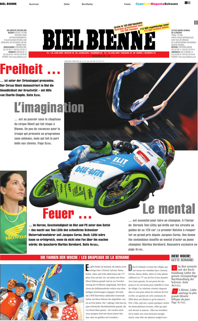 BIEL BIENNE DIE GRÖSSTE ZEITUNG DER REGION AUFLAGE: 103 598 ERSCHEINT JEDEN MITTWOCH/DONNERSTAG IN ALLEN HAUSHALTEN BIELS UND GRENCHENS, DES SEELANDES UND DES BERNER JURAS. HERAUSGEBER: CORTEPRESS BIEL 032 327 09 11 / FAX 032 327 09 12 INSERATE: BURGGASSE 14 032 329 39 39 / FAX 032 329 39 38 INTERNET: http://www.bielbienne.com Nummer: Seite: Buntfarbe: Farbe: CyanGelbMagentaSchwarz nn halte 98 Haust dans eser 5 3 0 1 en ässige idL èles m lm e e it g u e Gratis in t r a f rs s 000 é gr Distribu03 598 ménage 112112 000 lecteu LE PLUS GRAND JOURNAL 1 15. / 16. JUNI 2005 WOCHE 24 28. JAHRGANG / NUMMER 24 15 / 16 JUIN 2005 SEMAINE 24 28e ANNÉE / NUMÉRO 24 KIOSKPREIS FR. 1.50 DE LA RÉGION TIRAGE: 103 598 PARAÎT CHAQUE MERCREDI/JEUDI DANS TOUS LES MÉNAGES DE LA RÉGION BIENNE-JURA BERNOISSEELAND-GRANGES. ÉDITEUR: CORTEPRESS BIENNE 032 327 09 11 / FAX 032 327 09 12 ANNONCES: RUE DU BOURG 14 032 329 39 39 / FAX 032 329 39 38 INTERNET: http://www.bielbienne.com PRODUKTION / PRODUCTION: ajé. / RJ / AZ / Kwe / OM / EMG / JST / PSJ / Z.V.G. Freiheit … … ist unter der Zirkuskuppel grenzenlos. Der Circus Monti demonstriert in Biel die Unendlichkeit der Kreativität – mit Hilfe von Charlie Chaplin. Seite SZENE. L’imagination … est au pouvoir sous le chapiteau du cirque Monti qui fait étape à Bienne. Un peu de vacances pour la troupe qui présente un programme sans animaux, mais qui fait la part belle aux clowns. Page SCÈNE. Feuer … … im Herzen, Geschwindigkeit im Blut und PS unter dem Sattel – das macht aus Tom Lüthi den schnellsten Schweizer Motorradrennfahrer seit Jacques Cornu. Doch: Lüthi wäre kaum so erfolgreich, wenn da nicht eine Fee über ihn wachen würde: die Ipsacherin Marlies Bernhard. Seite AKTUELL. Le mental … est essentiel pour faire un champion. A l’instar du Bernois Tom Lüthy qui brille sur les circuits au guidon de sa 125 cm3. Le premier Helvète à remporter un grand prix depuis Jacques Cornu. Une bonne fée seelandaise insuffle un mental d’acier au jeune champion: Marlies Bernhard. Rencontre exclusive en page ACTUEL. DIESE WOCHE: CETTE SEMAINE: DIE FAHNEN DER WOCHE / LES DRAPEAUX DE LA SEMAINE E s gibt Dörfer im Seeland, die haben noch richtige Fans: Christof, Sylvain, Reina, D ans le Seeland, il existe des villages qui ont encore de véritables fans: Christof, Robin, Aline und Célia (Bild) feiern die 777 Sylvain, Reina, Robin, Aline et Célia (photo) Jahre Port auf ihre Art. Sie haben mit ihren célèbrent les 777 ans de Port à leur manière. Eltern Fahnen gemalt und sie zur Verschö- Avec leurs parents, ils ont peint des dra- nerung des Dorfkerns aufgehängt. Den Besu- peaux et les ont hissés pour embellir le cœur chern des Jubiläumsdorfes wehen nun diese du village. Ces créations colorées claquent farbigen Zeichnungen entgegen. Die Kids dans le vent pour saluer les visiteurs de Port der 2 850 Einwohner zählenden Gemeinde en fête. Les gamins de cette commune de haben auf ihren Fahnen das abgebildet, was 2850 âmes ont illustré ce qu’ils aiment à sie an Port lieben. Die 7-jährige Célia hat ein Port. Célia, sept ans, a peint quelques vaches paar schottische Hochlandrinder gemalt, die des hauts-plateaux écossais, celles qui pais- vor ihrem Haus grasen. «Sie wecken mich sent devant sa maison. «Elles me réveillent zwar morgens früh mit ihrem lauten Mu- tôt le matin avec leurs bruyants meugle- hen, aber sie gefallen mir trotzdem.» ments, mais elles me plaisent malgré tout.» n In Biel entsteht mit der Buchhandlung Lüthy die grösste zweisprachige Buchhandlung der Schweiz. Seite AKTUELL. n A Bienne, Lüthy aménage la plus grande librairie bilingue du pays. Page ACTUEL. BIEL BIENNE 2 Nummer: Seite: Buntfarbe: Farbe: CyanGelbMagentaSchwarz AKTUELL / ACTUEL BIEL BIENNE 15. / 16. JUNI 2005 nn BIEL BIENNE 15 / 16 JUIN 2005 GEWERBE COMMERCE Lüthy läutet Ausbau ein Lüthy voit plus grand VON «Wir haben lange nach SIMONE mehr Raum gesucht, um eiLIPPUNER nen grösseren Auftritt realisieren zu können», sagt Simone Lüthy, Geschäftsführerin der Lüthy Buchhandlung AG. «Die Zweisprachigkeit fand auf zwei Stockwerken keinen Platz mehr.» Nun kann die Buchhändlerin die Suche einstellen und mit der Ausweitung der Buchhandlung am bestehenden Standort an der Dufourstrasse 17 in Biel die optimale Lösung umsetzen. Flexibilität. «Durch den Umzug der Winterthur-Versicherung an die Bahnhofstrasse konnten wir vor einem Jahr mit der Prüfung unseres Bauvorhabens beginnen», so die Geschäftsführerin. Die ehemals von der Versicherung genutzten zwei Stockwerke werden in die Bücherwelt eingebunden und machen Lüthy zum grössten zweisprachigen Buchhaus der Schweiz auf vier Etagen. Nun ist im Stadtzentrum bereits der Baulärm zu hören, im Bücherladen herrscht Aus- Simone Lüthy. Sie freut sich auf ihre neue alte Buchhandlung mit 1500 Quadratmetern Verkaufsfläche. nahmezustand: Das Untergeschoss ist geräumt und gesperrt, im Erdgeschoss reihen sich eng aneinander doppelt so viele Bücher wie vorher. Was keinen Platz fand, ist in Kisten verstaut. «Da der Umbau parallel zum Tagesgeschäft stattfindet, sind die Etagen abwechslungsweise nicht verfügbar», erklärt die Geschäftsführerin. Das verlangt von den Kunden zwar mehr Flexibilität, «doch können sie uns immer fragen. Auch bleibt das Geschäft während der gesamten Umbauzeit geöffnet.» Zukunft. Im Oktober soll der rund drei Millionen Franken teure Umbau fertig sein. Auf einer Verkaufsfläche von 1500 Quadratmetern warten dann Sitzgelegenheiten, Tische, ein «Büchercafé» und über 80 000 Titel auf die Leseratten. Lüthy: «Insbesondere die Warengruppen Belletristik, Kinderbuch, Gesundheit, Wirtschaft sowie Sprachen und Reisen werden ausgebaut.» Auch Hörbüchern, DVDs und dem «Non-BookBereich» soll mehr Platz ein- Simone Lüthy: «Nous agrandirons avant tout les rayons belles-lettres, littérature enfantine, santé, économie, langues et voyages.» PHOTO: ENRIQUE MUÑOZ