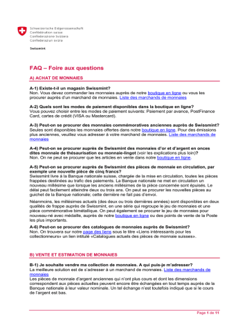 FAQ – Foire aux questions A) ACHAT DE MONNAIES A-1) Existe-t-il un magasin Swissmint? Non. Vous devez commander les monnaies auprès de notre boutique en ligne ou vous les procurer auprès d’un marchand de monnaies. Liste des marchands de monnaies A-2) Quels sont les modes de paiement disponibles dans la boutique en ligne? Vous pouvez choisir entre les modes de paiement suivants: Paiement par avance, PostFinance Card, cartes de crédit (VISA ou Mastercard). A-3) Peut-on se procurer des monnaies commémoratives anciennes auprès de Swissmint? Seules sont disponibles les monnaies offertes dans notre boutique en ligne. Pour des émissions plus anciennes, veuillez vous adresser à votre marchand de monnaies. Liste des marchands de monnaies A-4) Peut-on se procurer auprès de Swissmint des monnaies d’or et d’argent en onces dites monnaie de thésaurisation ou monnaie-lingot (voir les explications plus loin)? Non. On ne peut se procurer que les articles en vente dans notre boutique en ligne. A-5) Peut-on se procurer auprès de Swissmint des pièces de monnaie en circulation, par exemple une nouvelle pièce de cinq francs? Swissmint livre à la Banque nationale suisse, chargée de la mise en circulation, toutes les pièces frappées destinées au trafic des paiements. La Banque nationale ne met en circulation un nouveau millésime que lorsque les anciens millésimes de la pièce concernée sont épuisés. Le délai peut facilement atteindre deux ou trois ans. On peut se procurer les nouvelles pièces au guichet de la Banque nationale; cette dernière ne fait pas d’envoi. Néanmoins, les millésimes actuels (des deux ou trois dernières années) sont disponibles en deux qualités de frappe auprès de Swissmint, en une série qui regroupe le jeu de monnaies et une pièce commémorative bimétallique. On peut également se procurer le jeu de monnaies pour nouveau-né avec médaille, auprès de notre boutique en ligne ou des points de vente de la Poste les plus importants. A-6) Peut-on se procurer des catalogues de monnaies auprès de Swissmint? Non. On trouvera sur notre page des liens sous le titre «Liens intéressants pour les collectionneurs» un lien intitulé «Catalogues actuels des pièces de monnaie suisses». B) VENTE ET ESTIMATION DE MONNAIES B-1) Je souhaite vendre ma collection de monnaies. A qui puis-je m’adresser? La meilleure solution est de s’adresser à un marchand de monnaies. Liste des marchands de monnaies Les pièces de monnaie d’argent anciennes qui n’ont plus cours et dont les dimensions correspondent aux pièces actuelles peuvent encore être échangées en tout temps auprès de la Banque nationale à leur valeur nominale. Un tel échange n’est toutefois indiqué que si le cours de l’argent est bas. Page 1 de 11 Swissmint Foire aux questions B-2) Puis-je faire estimer ma collection par Swissmint? Swissmint ne procède à aucune estimation. Veuillez pour ce faire vous adresser à un marchand de monnaies. Liste des marchands de monnaies B-3) Jusqu’à quand peut-on échanger des pièces de monnaie qui n’ont plus cours? Lorsqu’une pièce n’a plus cours, elle peut être échangée à sa valeur nominale durant deux ans environ auprès de la Poste, des Chemins de fer fédéraux suisses et de la Banque nationale suisse. Puis, dans un délai de 20 ans à compter de sa mise hors cours, elle peut encore être échangée auprès de la Banque nationale suisse. Enfin, aucun délai n’est mis à la reprise des pièces courantes mises hors cours lorsque leurs dimensions et motifs correspondent aux pièces qui ont cours (cf. le tarif du 7 avril 2006 pour les monnaies mises hors cours). C) GÉNÉRALITÉS ET CONSIDÉRATIONS TECHNIQUES SUR LA MONNAIE SUISSE C-1) A partir de quand l’euro sera-t-il la monnaie suisse? Jusqu’à nouvel avis, la Suisse n’introduira pas l’euro. C-2) Quand la pièce de dix francs sera-t-elle introduite? Une pièce courante de dix francs ne verra pas le jour dans un avenir proche. C-3) Qui décide des sujets et des motifs des pièces de monnaie courantes? Le Conseil fédéral approuve les sujets et les motifs des pièces de monnaie courantes. C-4) Qui décide des sujets et des motifs des pièces de monnaie commémoratives? Le chef du Département fédéral des finances approuve les sujets des pièces commémoratives, et le directeur de l’Administration fédérale des finances leurs motifs. C-5) Qui décide des quantités de pièces frappées? La Banque nationale suisse détermine les besoins en pièces de monnaie courantes. La Confédération étant responsable des émissions, Swissmint présente une proposition au chef du Département fédéral des finances par l’intermédiaire de l’Administration fédérale des finances. Le chef du département autorise alors le programme de frappe. Swissmint décide des quantités de pièces de collection. C-6) Combien de pièces de monnaie circulent-elles? Plus de cinq milliards totalisant une valeur nominale de plus de 2,9 milliards de francs, ce qui correspond à plus de ’18 000 tonnes. C-7) Les pièces de monnaie sont-elles soumises aux limitations de la masse monétaire de la Banque nationale suisse? Bien que des pièces de monnaie circulent pour quelque 2,9 milliards de francs, ce montant est trop insignifiant pour que l’on doive en tenir compte dans le calcul de la masse monétaire. Les quantités de pièces frappées sont donc déterminées par les besoins. C-8) Pourquoi la pièce de 50 centimes porte-t-elle la valeur «½ fr.» et non «50 centimes»? La première loi fédérale de 1850 sur la monnaie s’inspirait fortement du système monétaire français. A l’instar du franc français, le franc suisse a été défini comme suit: «Cinq grammes d’argent, au titre de neuf dixièmes de fin constituent l’unité monétaire suisse sous le nom de franc» (= étalon monétaire). Le jeu de monnaies se déclinait en trois séries, qui se distinguaient par leur couleur et leur