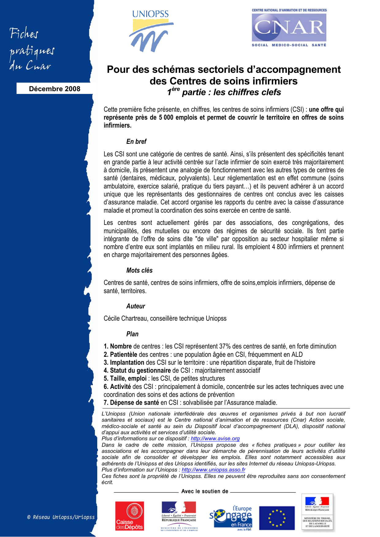 Mois AAAA Décembre 2008 Pour des schémas sectoriels d’accompagnement des Centres de soins infirmiers 1ère partie : les chiffres clefs Cette première fiche présente, en chiffres, les centres de soins infirmiers (CSI) : une offre qui représente près de 5 000 emplois et permet de couvrir le territoire en offres de soins infirmiers. En bref Les CSI sont une catégorie de centres de santé. Ainsi, s’ils présentent des spécificités tenant en grande partie à leur activité centrée sur l’acte infirmier de soin exercé très majoritairement à domicile, ils présentent une analogie de fonctionnement avec les autres types de centres de santé (dentaires, médicaux, polyvalents). Leur réglementation est en effet commune (soins ambulatoire, exercice salarié, pratique du tiers payant…) et ils peuvent adhérer à un accord unique que les représentants des gestionnaires de centres ont conclus avec les caisses d’assurance maladie. Cet accord organise les rapports du centre avec la caisse d’assurance maladie et promeut la coordination des soins exercée en centre de santé. Les centres sont actuellement gérés par des associations, des congrégations, des municipalités, des mutuelles ou encore des régimes de sécurité sociale. Ils font partie intégrante de l’offre de soins dite "de ville" par opposition au secteur hospitalier même si nombre d’entre eux sont implantés en milieu rural. Ils emploient 4 800 infirmiers et prennent en charge majoritairement des personnes âgées. Mots clés Centres de santé, centres de soins infirmiers, offre de soins,emplois infirmiers, dépense de santé, territoires. Auteur Cécile Chartreau, conseillère technique Uniopss Plan 1. Nombre de centres : les CSI représentent 37% des centres de santé, en forte diminution 2. Patientèle des centres : une population âgée en CSI, fréquemment en ALD 3. Implantation des CSI sur le territoire : une répartition disparate, fruit de l’histoire 4. Statut du gestionnaire de CSI : majoritairement associatif 5. Taille, emploi : les CSI, de petites structures 6. Activité des CSI : principalement à domicile, concentrée sur les actes techniques avec une coordination des soins et des actions de prévention 7. Dépense de santé en CSI : solvabilisée par l’Assurance maladie. L’Uniopss (Union nationale interfédérale des œuvres et organismes privés à but non lucratif sanitaires et sociaux) est le Centre national d’animation et de ressources (Cnar) Action sociale, médico-sociale et santé au sein du Dispositif local d’accompagnement (DLA), dispositif national d’appui aux activités et services d’utilité sociale. Plus d’informations sur ce dispositif : http://www.avise.org Dans le cadre de cette mission, l’Uniopss propose des « fiches pratiques » pour outiller les associations et les accompagner dans leur démarche de pérennisation de leurs activités d’utilité sociale afin de consolider et développer les emplois. Elles sont notamment accessibles aux adhérents de l’Uniopss et des Uriopss identifiés, sur les sites Internet du réseau Uniopss-Uriopss. Plus d’information sur l’Uniopss : http://www.uniopss.asso.fr Ces fiches sont la propriété de l’Uniopss. Elles ne peuvent être reproduites sans son consentement écrit. Les Centres de soins infirmiers, chiffres clefs Décembre 2008 1. Nombre de centres : les CSI représentent 37% des centres de santé, en forte diminution Les CSI représentent 37% des centres de santé. Les CSI sont la catégorie de centres la plus importante devant les centres de santé bucco dentaire (35%), les centres de santé polyvalents (20%) et enfin les centres de santé médicaux (8%). Graphique n°1 : Répartition des centres de santé par type d’activité en 2005 CSP 258 20% CSI 465 37% CSM 98 8% CSI CSD CSM CSP : centres de soins infirmiers : centres de santé bucco dentaire : centres de santé médicaux : centre de santé polyvalents CSD 438 35% Source des données : réponses des centres à l’enquête Cnamts 2007 portant sur l’activité 2005 des centres de santé (1259 centres recensés) Répartition des centres de santé par type d'activité en 2005 Le nombre de CSI a fortement diminué depuis 2000 en raison du regroupement de centres Le nombre de CSI a augmenté entre 1994 et 1998 passant de 811 à 1 080 centres pour ensuite diminuer à partir du début des années 2000 avec 561 CSI recensés en 2004 (cf. tableau n°1). Les effectifs infirmiers en CSI ont au contraire augmenté dans la même période avec 2 949 infirmiers employés en 2 000 et 4 778 en 2005. Il est possible de déduire de ce rapprochement que si le nombre de centres a fortement diminué, ce phénomène est largement contrebalancé par la croissance des autres centres qui témoignent du dynamisme et de la pertinence de cette offre. Certains centres se sont par ailleurs regroupés : de plusieurs entités, on est passé à une seule mais le personnel n’a pas diminué pour autant. La diminution du temps de travail (de plus en plus de temps partiels) a également dû contribuer à l’augmentation des effectifs. Tableau n°1 : Evolution du nombre de CSI au cours des dix dernières années 1994 1995 1997 1998 2002 2004 2005 811 964 1053 1080 918 561 566 Source des données: Estimations par l’IGAS à partir de sources diverses (DREES, CNAMTS) Précaution de lecture : Les données présentées dans le tableau n°1 sont issues du rapport de l’IGAS de 2006 sur la situation financière des CSI et présentent une divergence avec les données recueillies en 2007 par l’Assurance maladie : 566 CSI en 2005 contre 465 recensés pour la même période par l’enquête 2007. L’IGAS en fournit les raisons dans son rapport : « toute étude se heurte à des difficultés pour disposer de données à jour et fiables. En effet chaque fichier FINESS comporte des lacunes, les fermetures de centres n’étant pas systématiquement mentionnées, en raison notamment de l’abs