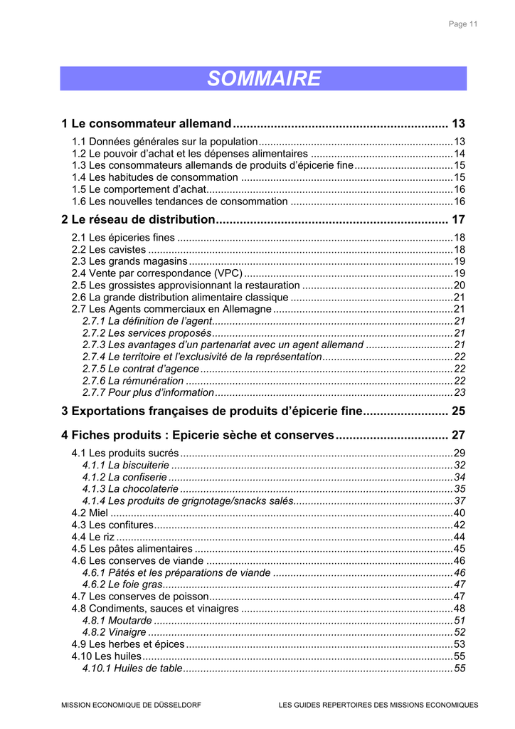 Page 11 SOMMAIRE 1 Le consommateur allemand ............................................................... 13 1.1 Données générales sur la population ................................................................... 13 1.2 Le pouvoir d‟achat et les dépenses alimentaires ................................................. 14 1.3 Les consommateurs allemands de produits d‟épicerie fine .................................. 15 1.4 Les habitudes de consommation ......................................................................... 15 1.5 Le comportement d‟achat..................................................................................... 16 1.6 Les nouvelles tendances de consommation ........................................................ 16 2 Le réseau de distribution .................................................................... 17 2.1 Les épiceries fines ............................................................................................... 18 2.2 Les cavistes ......................................................................................................... 18 2.3 Les grands magasins ........................................................................................... 19 2.4 Vente par correspondance (VPC) ........................................................................ 19 2.5 Les grossistes approvisionnant la restauration .................................................... 20 2.6 La grande distribution alimentaire classique ........................................................ 21 2.7 Les Agents commerciaux en Allemagne .............................................................. 21 2.7.1 La définition de l’agent................................................................................... 21 2.7.2 Les services proposés ................................................................................... 21 2.7.3 Les avantages d’un partenariat avec un agent allemand .............................. 21 2.7.4 Le territoire et l’exclusivité de la représentation ............................................. 22 2.7.5 Le contrat d’agence ....................................................................................... 22 2.7.6 La rémunération ............................................................................................ 22 2.7.7 Pour plus d’information .................................................................................. 23 3 Exportations françaises de produits d’épicerie fine......................... 25 4 Fiches produits : Epicerie sèche et conserves ................................. 27 4.1 Les produits sucrés .............................................................................................. 29 4.1.1 La biscuiterie ................................................................................................. 32 4.1.2 La confiserie .................................................................................................. 34 4.1.3 La chocolaterie .............................................................................................. 35 4.1.4 Les produits de grignotage/snacks salés....................................................... 37 4.2 Miel ...................................................................................................................... 40 4.3 Les confitures ....................................................................................................... 42 4.4 Le riz .................................................................................................................... 44 4.5 Les pâtes alimentaires ......................................................................................... 45 4.6 Les conserves de viande ..................................................................................... 46 4.6.1 Pâtés et les préparations de viande .............................................................. 46 4.6.2 Le foie gras .................................................................................................... 47 4.7 Les conserves de poisson.................................................................................... 47 4.8 Condiments, sauces et vinaigres ......................................................................... 48 4.8.1 Moutarde ....................................................................................................... 51 4.8.2 Vinaigre ......................................................................................................... 52 4.9 Les herbes et épices ............................................................................................ 53 4.10 Les huiles ........................................................................................................... 55 4.10.1 Huiles de table ............................................................................................. 55 MISSION ECONOMIQUE DE DÜSSELDORF LES GUIDES REPERTOIRES DES MISSIONS ECONOMIQUES Page 12 4.10.2 Huile d’olive ................................................................................................. 57 4.10.3 Les olives de table ....................................................................................... 60 5 Fiches opérateurs ............................................................................... 63 5.1 Grossistes fournissant les détaillants ................................................................... 63 5.1.1 Importateurs tous produits ............................................................................. 63 5.1.2 Importateurs spécialisés en produits sucrés ................................................ 108 5.2 Grossistes fournissant la restauration ................................................................ 129 5.3 Détaillants important en direct ............................................................................ 181 5.3.1 Commerce stationnaire .................................