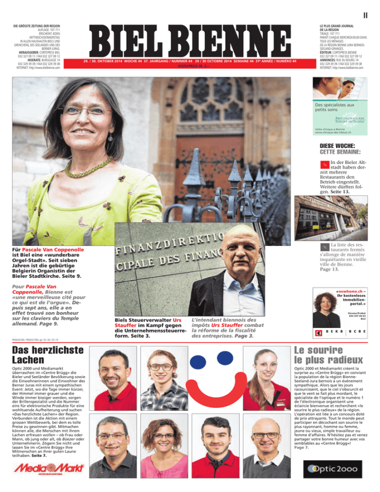 ll DIE GRÖSSTE ZEITUNG DER REGION AUFLAGE: 107 711 ERSCHEINT JEDEN MITTWOCH/DONNERSTAG IN ALLEN HAUSHALTEN BIELS UND GRENCHENS, DES SEELANDES UND DES BERNER JURAS. HERAUSGEBER: CORTEPRESS BIEL 032 327 09 11 / FAX 032 327 09 12 INSERATE: BURGGASSE 14 032 329 39 39 / FAX 032 329 39 38 INTERNET: http://www.bielbienne.com 29. / 30. OKTOBER 2014 WOCHE 44 37. JAHRGANG / NUMMER 44 29 / 30 OCTOBRE 2014 SEMAINE 44 37E ANNÉE / NUMÉRO 44 KIOSKPREIS FR. 2.– LE PLUS GRAND JOURNAL DE LA RÉGION TIRAGE: 107 711 PARAÎT CHAQUE MERCREDI/JEUDI DANS TOUS LES MÉNAGES DE LA RÉGION BIENNE-JURA BERNOISSEELAND-GRANGES. ÉDITEUR: CORTEPRESS BIENNE 032 327 09 11 / FAX 032 327 09 12 ANNONCES: RUE DU BOURG 14 032 329 39 39 / FAX 032 329 39 38 INTERNET: http://www.bielbienne.com Des spécialistes aux petits soins Votre clinique à Bienne www.clinique-des-tilleuls.ch DIESE WOCHE: CETTE SEMAINE: In der Bieler Altstadt haben derzeit mehrere Restaurants den Betrieb eingestellt. Weitere dürften folgen. Seite 13. n La liste des restaurants fermés s’allonge de manière inquiétante en vieille ville de Bienne. Page 13. n Für Pascale Van Coppenolle ist Biel eine «wunderbare Orgel-Stadt». Seit sieben Jahren ist die gebürtige Belgierin Organistin der Bieler Stadtkirche. Seite 9. Pour Pascale Van Coppenolle, Bienne est «une merveilleuse cité pour ce qui est de l’orgue». Depuis sept ans, elle a en effet trouvé son bonheur sur les claviers du Temple allemand. Page 9. «newhome.ch – Ihr kostenloses Immobilienportal.» <wm>10CAsNsjY0MDQx0TU2sTS2MAAAZkP4_A8AAAA=</wm> <wm>10CFWKKw6AMBAFT7TN29duP6wkOIIg-BqC5v6KgkNMMsnMuroFfMzLdiy7KzQlianFCleWYNk15oAcHY3k6JMaFGDBbxdkogL9fQRNyD7EqsA6VcN9Xg_NwvVHcQAAAA==</wm> Biels Steuerverwalter Urs Stauffer im Kampf gegen die Unternehmenssteuerreform. Seite 3. L’intendant biennois des impôts Urs Stauffer combat la réforme de la fiscalité des entreprises. Page 3. Verena Probst 032 327 46 63 Biel PRODUKTION / PRODUCTION: ajé / RJ / HE / JST / FF Das herzlichste Lachen Le sourire le plus radieux Optic 2000 und Mediamarkt überraschen im «Centre Brügg» die Bieler und Seeländer Bevölkerung sowie die Einwohnerinnen und Einwohner des Berner Juras mit einem sympathischen Event: Jetzt, wo die Tage immer kürzer, der Himmel immer grauer und die Winde immer bissiger werden, sorgen der Brillenspezialist und die Nummer eins für elektronische Produkte für eine wohltuende Aufheiterung und suchen «Das herzlichste Lachen» der Region. Verbunden ist die Aktion mit einem grossen Wettbewerb, bei dem es tolle Preise zu gewinnen gibt. Mitmachen können alle, die Menschen mit ihrem Lachen erfreuen wollen – ob Frau oder Mann, ob jung oder alt, ob Büezer oder Unternehmerin. Zögern Sie nicht und lassen Sie im «Centre Brügg» Ihre Mitmenschen an Ihrer guten Laune teilhaben. Seite 7. Optic 2000 et Mediamarkt créent la surprise au «Centre Brügg» en conviant la population de la région BienneSeeland-Jura bernois à un événement sympathique. Alors que les jours racourcissent, que le ciel s’obscurcit et que le vent se fait plus mordant, le spécialiste de l’optique et le numéro 1 de l’électronique organisent une éclaircie bienvenue et recherchent «le sourire le plus radieux» de la région. L’opération est liée à un concours doté de prix attrayants. Tout le monde peut participer en décochant son sourire le plus rayonnant, homme ou femme, jeune ou vieux, simple travailleur ou femme d’affaires. N’hésitez pas et venez partager votre bonne humeur avec vos semblables au «Centre Brügg»! Page 7. 2 AKTUELL / ACTUEL BIEL BIENNE 29. / 30. OKTOBER 2014 BIEL BIENNE 29 / 30 OCTOBRE 2014 BAURECHT PERMIS DE CONSTRUIRE «Elite» wird filetiert L’Elite «saucissonné» Für den Umbau des Bieler Hotels Elite wurden mehrere Baugesuche publiziert. Salamitaktik oder normales Vorgehen? PHOTO: BCA VON HANS-UELI AEBI sen», sagt Christian Pfäffli, zuständiger Sachbearbeiter beim «Umbau der 2. bis 5. Stock- Statthalteramt. Auch vom fiwerke des bestehenden Hotels nanziellen Standpunkt her erElite», stand vorige Woche im scheint dieses Vorgehen sinnBieler Amtsanzeiger zu lesen. voll, schlägt doch ein BaugeDie 74 Hotelzimmer sollen in such dieser Art mit gegen (Miet)-Appartements umge- 3000 Franken zu Buche. Wabaut werden. Gesuchsteller ist rum ist das nicht geschehen? die Poli Immobilien AG in Meggen (LU) des neuen «EliEinheit. Der Bieler Immote»-Eigners Franz Glanzmann. bilien-Treuhänder Ulrich Roth Bereits Mitte September wur- vermutet eine «Salamitaktik» den die Gesuche fürs Restau- seitens der neuen Eigentümerrant Cha Cha im Erdgeschoss schaft. «Man will so verhinund das Fitness-Center Flo- dern, dass mit einer einzigen werpower im 1. Stock einge- Einsprache der gesamte Umreicht. Die Gesuchstellerin ist bau blockiert werden kann.» in beiden Fällen die Genos- Dies sei «Mumpitz» kontert senschaft Migros Aare , welche Franz Glanzmann und nervt diese Stockwerke mietet. sich über die «nimmermüden Nörgler» an seinen Plänen. Es Umstritten. Appartments handle sich um Einzelprojekte und Thaifood-Lokal sind im verschiedener Gesuchsteller Bereich Hotel- und Gastrobe- (Poli und Migros Aare), die reich angesiedelt, Bewilli- nichts miteinander zu tun hätgungs-Instanz ist daher das ten. Dies sieht Roth anders: Bieler Regierungsstatthalter- «Der Bauherr ist immer der amt. Für den Fitnesstempel Eigentümer, also Glanzmann. ist das Stadtplanungsamt zu- Zudem betreffen Umbauten ständig. Das Baugesuch für der Infrastruktur, namentlich ein Restaurant auf dem Dach im Bereich Strom, Wasser und des «Elite» steht noch aus. Abwasser, das gesamte GebäuVor allem der Umbau des Erd- de.» Aus dieser Perspektive hätgeschosses und die Schliessung ten die Behörden ein einziges des «Baramundo» sind heftig Baugesuch fordern können, «und ich bin überzeugt, dass umstritten. Vier Projekte – ein Gebäu- dies bei einer Bieler Bauherrde. Warum wurden die vier schaft auch geschehen 