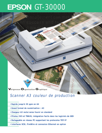 GT-30000 Scanner A3 couleur de production • Rapide jusqu’à 30 ppm en A4 • Grand format de numérisation : A3 • Chargeur A3 recto/verso fourni en standard • Pilotes ISIS et TWAIN, intégration facile dans les logiciels de GED • Partageable en réseau PC supportant les protocoles TCP/IP • Interfaces SCSI, FireWire et connexion Ethernet en option GT-30000 B Caractéristiques générales Caractéristiques techniques C Réf. B106031HA • • • • • • • Scanner couleur A3 à plat avec chargeur Déplacement du chariot en 1 passe Résolution optique : 600 x 1200 dpi Résolution de sortie : de 50 à 9600 dpi Barrette CCD de 21.060 capteurs Résolution interpolée : 9600 dpi Echantillonnage interne sur : 36 bits en couleur, 24 bits en sortie • Surface de numérisation : 297 x 432 mm, A3 • 7020 x 10200 pixels effectifs à 600 dpi • Source lumineuse lampe fluorescente au Xenon • Pour numériser des documents de grand format ou plusieurs A4 : revues de presse, BàT, vues éclatées, plans sur calque, plans du cadastre, listings informatique, cartes routières, etc • Format A3 : 297 x 432 mm • Détection de la surface du document par capteurs et sans pré-numérisation Chargeur intégré • Chargeur feuille A3 recto/verso • Capacité de 100 pages Qualité d’image • Résolution optique de 600 dpi avec un échantillonnage de 36 bits par pixel • Idéal pour les petits groupes de travail • Partageable avec réseaux PC supportant les protocoles TCP/IP avec un PC serveur de scanner • Connexion directe sur réseau en option Souplesse de connexion • En standard : interface SCSI 2 deux connecteurs 1 Wide & 1 Narrow (carte PC non fournie) • En option : interfaces FireWire ou Ethernet 10/100 TX via boîtier réseau optionnel. (1) EPSON ne garantit le bon fonctionnement de ses produits qu’en association avec les logiciels d’exploitation susvisés. Il vous est conseillé de contacter votre revendeur pour toute utilisation de votre matériel EPSON avec des versions autres ou ultérieures. Service Driver Sur Site Internet EPSON ou par fax : 03 86 44 13 15 ou B.P. 20 - 89130 TOUCY Ce document ne présente pas de caractère contractuel. Les spécifications techniques sont données à titre indicatif. Les photographies contenues dans cette documentation ne sont pas contractuelles, les images ne sont pas représentatives de la qualité produite par l’appareil. EPSON est une appellation commerciale de Seiko EPSON Corp. Les autres marques sont des appellations commerciales de leurs sociétés respectives. E ISO IF I 9 ISO 9 Partageable en réseau PC EPSON TWAIN High Speed • Pour une utilisation non partagée :Calibrage couleur, exposition et cadrage automatique ou manuel, visualisation dynamique des corrections, configurations personnalisées. En SCSI sur PC Windows® 95/98/2000 Professionnel/Me/NT 4.0 WorkStation et en FireWire (IEEE 1394) sur PC Windows® 2000 Professionnel/ Me (option scanner FireWire IEEE 1394 requise) EPSON Scan Server • Serveur de scanner pour partager le scanner entre plusieurs postes clients PC Windows® 95/98/ 2000 Professionnel/NT 4 WorkStation. Logiciel à installer dans le cadre d’un partage via un PC serveur EPSON TWAIN High Speed NetWork • Pour une utilisation partagée du scanner PC Windows® 95/98/2000 Professionnel/Me/NT 4.0 WorkStation. Mêmes fonctions qu’EPSON TWAIN HS. Le logiciel à installer sur les postes clients dans la carte via un PC serveur ou par boîtier réseau Ethernet EPSON NetWork Image Express. ISIS • Pour une utilisation non partagée du scanner en connexion SCSI au travers de logiciels utilisant la norme ISIS. Pour PC Windows® 95/98/2000 Professionnel/Me/NT 4.0 Note : avec Windows® 2000 Professionnel et Windows® Me, EPSON ne garantit le bon fonctionnement que sur les machines où ces systèmes d’exploitation sont installés d’usine Support technique Téléphone : 0 821 017 017 (0,79 F/min) du lundi au samedi de 9h00 à 20h00 sans interruption. 2 N °1 9 • Pilote ISIS en connexion SCSI sous Windows® non partagé • Pilote TWAIN High Speed en connexion SCSI, FireWire, Ethernet sous Windows® Pilotes PC uniquement (1) EPSON Information Pour obtenir des renseignements sur les produits et le réseau commercial EPSON : Téléphone : 0 821 017 017 (0,79 F/min) de 9h00 à 12h30 et de 14h00 à 18h00. Fermé le lundi matin. 00 Intégration aisée dans les logiciels GED Protocoles • Partageable avec les réseaux répondants aux protocoles de communication TCP/IP Connexion du scanner • Standard : En SCSI sur le poste serveur, logiciel EPSON Scan Server à installer sur le poste serveur et EPSON TWAIN HS NetWork sur les postes clients. Réseaux conseillés : Ethernet (10Base T/100Base TX, 10Base ou 10Base 2) ou TOKEN 4/16 Mbps • Option : En Ethernet (10Base T/100Base TX), le scanner étant connecté au boîtier EPSON NetWork Image Express en SCSI Sites Internet http://www.epson.fr http://consommables.epson.fr T Partageable en réseau Agences régionales Bordeaux, Lille, Lyon, Marseille, Nantes, Strasbourg, Toulouse. ) °C E R • Automatique par capteurs en électronique et à chaque numérisation • En mode à plat et avec chargeur feuille à feuille • Ne nécessite pas de pré-numérisation Siège social, agence Paris et agence consommables Boîte postale 320 92305 Levallois-Perret CEDEX AQ Détection du format de l’original Grande surface de numérisation A 658 mm B 254 mm C 488 mm Poids 30 kg F • Fourni en standard avec le scanner • 1 bac de 100 feuilles, grammage : 50 à 127 g/m 2 • Format A3, recto/verso • Au trait : 0,39 msec./ligne à 600 dpi et en couleur : 0,79 msec./ligne à 600 dpi • 30 ppm N&B et 15 ppm en couleur avec chargeur feuille à feuille (A4 à 300 dpi Paysage) • 30 ppm en A4 - Noir et Blanc • 15 ppm en A4 - Couleur Encombrement Chargeur feuille à feuille Vitesse de numérisation Rapide d’acquisition A Type 1120 (A Le GT-30000 est un maillon indispens