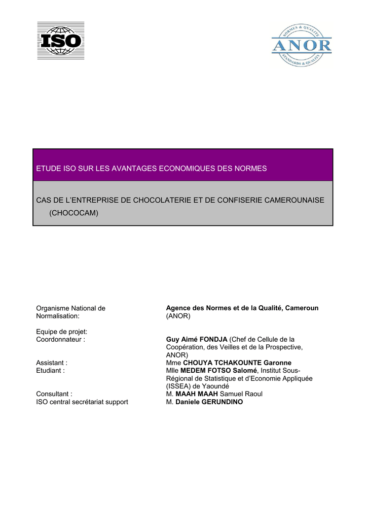 ETUDE ISO SUR LES AVANTAGES ECONOMIQUES DES NORMES CAS DE L’ENTREPRISE DE CHOCOLATERIE ET DE CONFISERIE CAMEROUNAISE (CHOCOCAM) Organisme National de Normalisation: Equipe de projet: Coordonnateur : Assistant : Etudiant : Consultant : ISO central secrétariat support Agence des Normes et de la Qualité, Cameroun (ANOR) Guy Aimé FONDJA (Chef de Cellule de la Coopération, des Veilles et de la Prospective, ANOR) Mme CHOUYA TCHAKOUNTE Garonne Mlle MEDEM FOTSO Salomé, Institut SousRégional de Statistique et d’Economie Appliquée (ISSEA) de Yaoundé M. MAAH MAAH Samuel Raoul M. Daniele GERUNDINO Page 2 SOMMAIRE ETUDE ISO SUR LES AVANTAGES ECONOMIQUES DES NORMES 1 CAS DE L’ENTREPRISE DE CHOCOLATERIE ET DE CONFISERIE CAMEROUNAISE (CHOCOCAM) 1 Présentation du Cadre de l’étude 1 1.1 Présentation du Cameroun 3 3 2 Présentation de l’ANOR et des objectifs de l’étude 4 3 Présentation du secteur industriel et de l’entreprise choisie 5 3.2 Présentation de l’entreprise choisie : Chococam 4 Attitude de l'entreprise envers la normalisation 5 Analyse de la chaîne de valeur 8 9 11 5.1 Chaîne de valeur du secteur industriel 11 5.2 Chaîne de valeur de Chococam 11 5.3 Principaux générateurs de valeur 13 6 Périmètre de l'évaluation dans le projet pilote 13 7 Emploi des normes par l'entreprise : Normes utilisées dans la chaîne de valeur de l'entreprise 14 8 Sélection des indicateurs opérationnels pour mesurer l'impact des normes 16 9 Calcul des avantages économiques des normes 18 9.1 Achats 18 9.2 Opérations 19 9.3 Ventes 20 9.4 Impact financier des normes sur les différentes fonctions 20 10 Considérations qualitatives et partiellement quantitatives 21 11 Evaluation des résultats 21 12 Conclusion 21 Page 3 1 Présentation du Cadre de l’étude 1.1 Présentation du Cameroun Le Cameroun est situé en Afrique Centrale, au fond du golfe de Guinée. Il est limité au Nord par le Tchad, à l’Est par la République Centrafricaine, au Sud par le Congo, le Gabon et la Guinée Equatoriale, à l’Ouest par le Nigéria. Le Cameroun compte 240 ethnies, réparties en trois grands groupes (Bantous, Semi-Bantous, Soudanais) et correspond à 240 langues nationales. Les ethnies les plus représentatives sont : Bantous : Béti, Bassa, Bakundu, Maka, Douala, Pygmées, … Semi-Bantous : Bamiléké, Gbaya, Bamoun, Tikar,… Soudanais : Foulbé, Mafa, Toupouri, Arabes-Choas, Moundang, Massa, Mousgoum,… Le français et l’anglais sont les langues officielles, elles sont parlées respectivement par 70 % et 30 % de la population. L’espagnol et l’allemand sont également connues par de nombreux citadins. Le Cameroun est un état laïc. Deux principales religions y sont pratiquées : le Christianisme et l’Islam. On note aussi la pratique de l’Animisme par de nombreuses populations. Le secteur primaire contribue à près d'un quart du PIB et emploie environ 50 % de la population active. Avant l'avènement du commerce du pétrole, l'agriculture était le pilier économique du pays. Le Cameroun reste l'un des principaux producteurs mondiaux de certaines denrées alimentaires, notamment le cacao, le café, les bananes, les produits dérivés de la palme, le tabac, le caoutchouc et le coton. La pêche et la sylviculture sont les deux autres activités importantes du pays. Les ressources minérales du Cameroun incluent le minerai de bauxite et le fer. Le secteur secondaire compte pour près d'un quart du PIB. Les principales industries du pays sont la préparation industrielle des aliments, la scierie, la fabrication de biens de consommation légers et le textile. Le secteur tertiaire représente la moitié du PIB. Il profite de l'activité économique créée autour de l'oléoduc Doba/Kribi, opérationnel depuis juillet 2004. Le secteur des services est en pleine croissance : télécommunication, trafic aérien, transports. Le Cameroun est ouvert au commerce international. Il est membre du Commonwealth, de la Zone Franc et de la CEMAC (Communauté Economique et Monétaire de l’Afrique Centrale). La part du commerce extérieur du Cameroun par rapport à son PIB est d'environ 50 %. Ses trois principaux clients sont l'Espagne, l'Italie et la France. Les produits principalement exportés sont les carburants minéraux, le pétrole, le bois, le charbon, le cacao, le coton et l'aluminium. Ses trois principaux fournisseurs sont le Nigéria, la France et la Chine. Le Cameroun importe principalement des carburants minéraux et du pétrole, des céréales, des véhicules, des machines et des équipements électriques et électroniques. L’Union Européenne est le premier partenaire commercial du Cameroun, représentant plus de 50 % des échanges hors pétrole. Les deux entités ont signé un accord de partenariat économique le 15 janvier 2009. Le Cameroun s'est ainsi engagé à libéraliser à terme 80 % des importations venant de cette zone sur une période de 15 ans. Depuis quelques années, l’Asie orientale (notamment la Chine, le Japon, l’Inde et la Thaïlande) renforce ses liens commerciaux avec le Cameroun. La zone représente aujourd'hui près de 20 % du total des échanges du pays. Du fait des importations massives de produits alimentaires, la balance de paiement du pays reste déficitaire et le pays doit améliorer son degré d'ouverture dès 2011 pour améliorer ses performances sur le plan du commerce extérieur. Page 4 Superficie Capitale Situation démographique er Population (1 janvier 2010) Densité de la population Taux de croissance naturelle de la population Age médian (total population) - Hommes - Femmes Structure population par âge - 0-14 ans - 15-64 ans - 65 ans et plus Proportion de la population urbaine Taux brut de natalité 475 442 Km2 Yaoundé Indice synthétique de fécondité Taux brut de mortalité Taux de mortalité infantile (total population) - Hommes - Femmes Espérance de vie à la naissance (total population) - Hommes - Femmes Données économiques PIB/