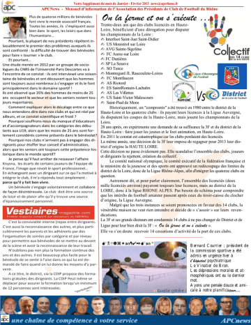 Votre Supplément du mois de Janvier - Février 2013 [email protected] APCNews - Mensuel d’information de l’Association des Présidents de Club de Football du Rhône Plus de quatorze millions de bénévoles font vivre le monde associatif français. Toutes les années, ils s’impliquent aussi bien dans le sport, les loisirs que dans l’humanitaire... Pourtant, la plupart de nos présidents répètent inlassablement le premier des problèmes auxquels ils sont confronté : la difficulté de trouver des bénévoles pour faire « tourner » le club. Et pourtant… Une étude menée en 2012 par un groupe de sociologues du CNRS de l’Université Paris Descartes va à l’encontre de ce constat : ils ont interviewé une soixantaine de bénévoles et ont découvert que les hommes sont toujours aussi nombreux à s’engager et ils le font principalement dans le domaine sportif ! Ils ont observé que 35% des hommes de moins de 25 ans occupent le secteur et que les seniors restent toujours majoritaires. Comment expliquer alors le décalage entre ce que nous entendons dire dans nos clubs et qui est réel par ailleurs, et ce constat scientifique et froid ? Pourquoi souffrons-nous du manque d’éducateurs et d’accompagnateurs dans les catégories des débutants aux U19, alors que les moins de 25 ans sont fortement considérés comme présents dans le bénévolat? Pourquoi nos clubs n’arrivent pas à engager des dirigeants pour étoffer leur conseil d’administration, alors que les seniors ont toujours cette prépotence historique dans le monde sportif? Je pense qu’il faut arrêter de ressasser l’affaire Knysna, les écarts de certains joueurs de l’équipe de France, l’image que revoit le sport professionnel… En échangeant avec un dirigeant sur ce qui l’a motivé à intégrer le club, il m’a répondu tout simplement : parce qu’il y fait bon vivre. Un bénévole s’engage volontairement et collabore de façon désintéressée. Le club doit être une source de loisir et de plaisir afin qu’il y trouve une source d'épanouissement personnel. On la ferme et on s’exécute … Trente-deux ans que des clubs licenciés en HauteLoire, bénéficient d'une dérogation pour disputer les championnats de la Loire : - Interfoot Saint-Just Saint-Didier - US Monistrol sur Loire - AVG Sainte-Sigolène - FC Aurec-sur Loire - FC Dunières - SP La Seauve - SO Tence - Montregard JL Raucoulete-Loires -- FC (SOMontfaucon Tence) - (Montregard JL RaucouleteAS Riotord Loires) - (FC Montfaucon) - (AS Riotord) SaintRomain-Lachalm - (AS Les Vil(ESES SaintRomain-Lachalm) AS Les Villettes lettes) - (US Saint-Victor Malescours) US Saint-Victor Malescours (Saint-Paul de Mons) - Saint-Paul de Mons Historiquement, été trouvé En 2011, une décisionunde"compromis" la FFF leur aimpose de en 1980 entre le district de la Haute-Loire et district les quatorze clubs:: ils payent leurs licences à la Ligue Auvergne, regagner leur d’origine la HAUTE ils disputent les coupes de la Haute-Loire, mais jouent les championnats de la LOIRE. Loire. Cette décision ne passe évidement pas. Elle scan28 ans l’ensemble après, on expérimente demande de sa suffisance la 3F et du district de la dalise des clubs une ; joueurs et dirigeants Haute-Loire : faire jouer les jeunes et le foot animation, en Haute-Loire. qui la rejettent. En 2011 le constat est catastrophique car les clubs perdaient des licenciés. La une olympique, décision de lale3F leur impose Le même comitéannée, national comité exécu-de regagner pour 2013 leur district la HAUTE LOIRE. tif ded’origine la fédération française et le ministère de la Cette décision passe évidement pas.un Elle scandalise l’ensemble des clubs, joueurs jeunesse et desnesports ont approuvé redécouet dirigeants la rejettent, création collectif. page des limites du district de ladu Loire, donc de la comité national le quatorze comité exécutif de la fédération française et LigueLeRhône-Alpes, afinolympique, d'intégrer les le ministère de la jeunesse et des sports ont approuvé un redécoupage des limites du clubs en question. district de la Loire, donc de la Ligue Rhône-Alpes, afin d'intégrer les quatorze clubs en question. Malgré que les trois instances se soient prononAutrement dit, la et vénérable pour parlermaison clairement, l’ensemble des licenciés (deux cés en leur faveur, ne veut mille licenciésetenviron) toujours rien entendre décide payeront de « s’assoir » surleur leslicences, mais au district de la LOIRE, donc à la ligue RHONE ALPES. Pas besoin de schéma pour comprendre revendications des clubs : Fermez là et exécutez que les intérêts du football amateur passent après ceux du tiroir-caisse du clocher vous. d’origine, la Ligue Auvergne. Malgrédit, queetlespour troisparler instances se soient prononcées en faveur des 14 clubs, la Autrement clairement, vénérable ne veut rien entendre et décide de « s’assoir » sur leurs revenl’ensemblemaison des licenciés (deux mille licenciés dications. environ) de payeront toujours leur licences, La 3Fau et ses grandsdeélecteurs ont condamnés clubs à ne pas changer de District et de mais district la LOIRE, donc à la 14 ligue C’est la convivialité interne (repas entre dirigeants. RHONE ALPES. C’est aussi la reconnaissance des autres, et plus parti- Ligue pour leur bien dixit la 3F : « On la ferme et on s’exécute ». Pas schéma14pour comprendre culièrement les parents et les adhérents par des Elle besoin va s’en donc doutederecevoir cessations d’activité de la part de ces clubs. que les intérêts du football amateur passe après l’organisation de soirées par catégorie et par niveau pour permettre aux bénévoles de se mettre au devant ceux des tiroir caisses. Historiquement de la scène et avoir la reconnaissance de leur travail. Bernard Courrier ; président de N’oublions pas non plus la formation continue des Un "compromis" est trouvé en 1980 entre le