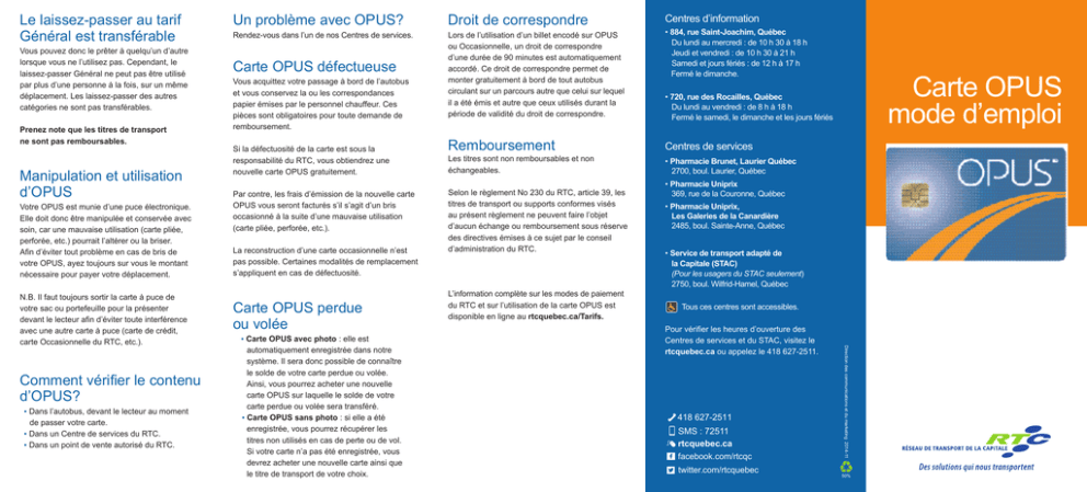 Le laissez-passer au tarif Général est transférable Vous pouvez donc le prêter à quelqu’un d’autre lorsque vous ne l’utilisez pas. Cependant, le laissez-passer Général ne peut pas être utilisé par plus d’une personne à la fois, sur un même déplacement. Les laissez-passer des autres catégories ne sont pas transférables. Prenez note que les titres de transport ne sont pas remboursables. Manipulation et utilisation d’OPUS Votre OPUS est munie d’une puce électronique. Elle doit donc être manipulée et conservée avec soin, car une mauvaise utilisation (carte pliée, perforée, etc.) pourrait l’altérer ou la briser. Afin d’éviter tout problème en cas de bris de votre OPUS, ayez toujours sur vous le montant nécessaire pour payer votre déplacement. Comment vérifier le contenu d’OPUS? ▪ Dans l’autobus, devant le lecteur au moment de passer votre carte. ▪ Dans un Centre de services du RTC. ▪ Dans un point de vente autorisé du RTC. Droit de correspondre Rendez-vous dans l’un de nos Centres de services. Lors de l’utilisation d’un billet encodé sur OPUS ou Occasionnelle, un droit de correspondre d’une durée de 90 minutes est automatiquement accordé. Ce droit de correspondre permet de monter gratuitement à bord de tout autobus circulant sur un parcours autre que celui sur lequel il a été émis et autre que ceux utilisés durant la période de validité du droit de correspondre. • 884, rue Saint-Joachim, Québec Du lundi au mercredi : de 10 h 30 à 18 h Jeudi et vendredi : de 10 h 30 à 21 h Samedi et jours fériés : de 12 h à 17 h Fermé le dimanche. Remboursement Centres de services Carte OPUS défectueuse Vous acquittez votre passage à bord de l’autobus et vous conservez la ou les correspondances papier émises par le personnel chauffeur. Ces pièces sont obligatoires pour toute demande de remboursement. Si la défectuosité de la carte est sous la responsabilité du RTC, vous obtiendrez une nouvelle carte OPUS gratuitement. Par contre, les frais d’émission de la nouvelle carte OPUS vous seront facturés s’il s’agit d’un bris occasionné à la suite d’une mauvaise utilisation (carte pliée, perforée, etc.). La reconstruction d’une carte occasionnelle n’est pas possible. Certaines modalités de remplacement s’appliquent en cas de défectuosité. Carte OPUS perdue ou volée ▪ Carte OPUS avec photo : elle est automatiquement enregistrée dans notre système. Il sera donc possible de connaître le solde de votre carte perdue ou volée. Ainsi, vous pourrez acheter une nouvelle carte OPUS sur laquelle le solde de votre carte perdue ou volée sera transféré. ▪ Carte OPUS sans photo : si elle a été enregistrée, vous pourrez récupérer les titres non utilisés en cas de perte ou de vol. Si votre carte n’a pas été enregistrée, vous devrez acheter une nouvelle carte ainsi que le titre de transport de votre choix. Les titres sont non remboursables et non échangeables. Selon le règlement No 230 du RTC, article 39, les titres de transport ou supports conformes visés au présent règlement ne peuvent faire l’objet d’aucun échange ou remboursement sous réserve des directives émises à ce sujet par le conseil d’administration du RTC. L’information complète sur les modes de paiement du RTC et sur l’utilisation de la carte OPUS est disponible en ligne au rtcquebec.ca/Tarifs. Centres d’information • Pharmacie Brunet, Laurier Québec 2700, boul. Laurier, Québec • Pharmacie Uniprix 369, rue de la Couronne, Québec • Pharmacie Uniprix, Les Galeries de la Canardière 2485, boul. Sainte-Anne, Québec • Service de transport adapté de la Capitale (STAC) (Pour les usagers du STAC seulement) 2750, boul. Wilfrid-Hamel, Québec Tous ces centres sont accessibles. Pour vérifier les heures d’ouverture des Centres de services et du STAC, visitez le rtcquebec.ca ou appelez le 418 627-2511. 418 627-2511 Liste des Centres de services Carte OPUS mode d’emploi • 720, rue des Rocailles, Québec Du lundi au vendredi : de 8 h à 18 h Fermé le samedi, le dimanche et les jours fériés SMS : 72511 rtcquebec.ca facebook.com/rtcqc twitter.com/rtcquebec Direction des communications et du marketing 2014-11 N.B. Il faut toujours sortir la carte à puce de votre sac ou portefeuille pour la présenter devant le lecteur afin d’éviter toute interférence avec une autre carte à puce (carte de crédit, carte Occasionnelle du RTC, etc.). Un problème avec OPUS? 50% La carte OPUS sans photo Catégorie Général Tous les points de vente de titres de transport émettent des cartes OPUS sans photo. Lors de l’achat d’une OPUS sans photo, vous devez également acheter un titre de transport. Des frais de 6,00 $ sont exigés pour l’émission de la carte. Une carte enregistrée est une carte protégée... Avec le solde conservé! ▪ Vous avez perdu votre OPUS et vous voulez récupérer les titres sur votre carte? Votre OPUS sans photo doit avoir été enregistrée. ▪ Faites vite! Ce simple geste pourrait vous éviter d’acheter un nouveau titre de transport, en cas de perte ou de vol de votre OPUS. Comment procéder? Remplissez un des deux formulaires disponibles au rtcquebec.ca sous l’onglet Cartes à puce / enregistrement. Après 4 ans, votre OPUS sans photo expire! Pour vérifier sa date d’expiration et savoir comment l’échanger sans frais, consultez CarteOpus.info. La carte OPUS avec photo Pour utiliser l’autobus Catégorie Aîné Catégorie Étudiant plus Vous pouvez obtenir la carte OPUS avec photo dans un Centre de services du RTC. Le statut Étudiant plus permet de profiter du tarif réduit sur le laissez-passer mensuel et le laissezpasser 7 jours lorsque les conditions suivantes sont remplies : ▪ Avoir 19 ans et plus ▪ Être étudiant à temps plein dans un établissement reconnu par le ministère de l’Éducation, du Loisir et du Sport des niveaux scolaires suivants : ▪ Cégep ▪ Unive