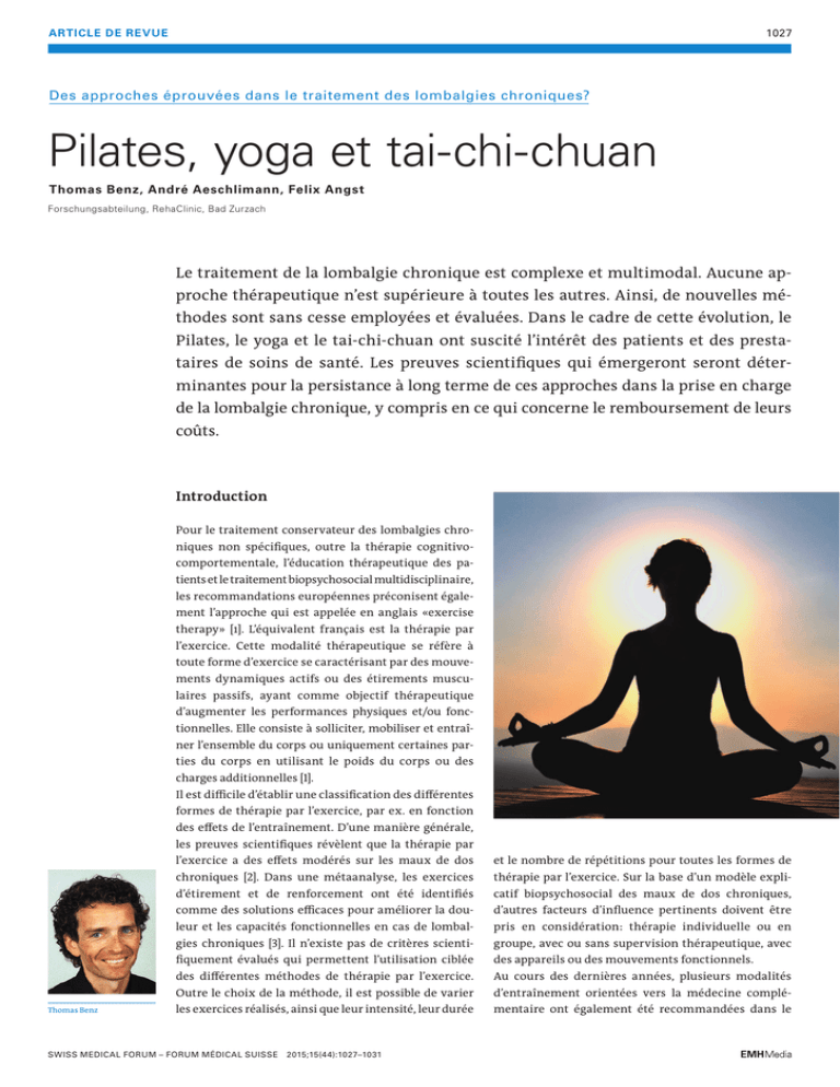 1027 ARTICLE DE REVUE Des approches éprouvées dans le traitement des lombalgies chroniques? Pilates, yoga et tai-chi-chuan Thomas Benz, André Aeschlimann, Felix Angst Forschungsabteilung, RehaClinic, Bad Zurzach Le traitement de la lombalgie chronique est complexe et multimodal. Aucune approche thérapeutique n’est supérieure à toutes les autres. Ainsi, de nouvelles méthodes sont sans cesse employées et évaluées. Dans le cadre de cette évolution, le taires de soins de santé. Les preuves scientifiques qui émergeront seront déter Pilates, le yoga et le tai-chi-chuan ont suscité l’intérêt des patients et des prestaminantes pour la persistance à long terme de ces approches dans la prise en charge de la lombalgie chronique, y compris en ce qui concerne le remboursement de leurs coûts. Introduction Pour le traitement conservateur des lombalgies chroniques non spécifiques, outre la thérapie cognitivocomportementale, l’éducation thérapeutique des pa tients et le traitement biopsychosocial multidisciplinaire, les recommandations européennes préconisent également l’approche qui est appelée en anglais «exercise therapy» [1]. L’équivalent français est la thérapie par l’exercice. Cette modalité thérapeutique se réfère à toute forme d’exercice se caractérisant par des mouvements dynamiques actifs ou des étirements musculaires passifs, ayant comme objectif thérapeutique d’augmenter les performances physiques et/ou fonctionnelles. Elle consiste à solliciter, mobiliser et entraîner l’ensemble du corps ou uniquement certaines parties du corps en utilisant le poids du corps ou des charges additionnelles [1]. Il est difficile d’établir une classification des différentes formes de thérapie par l’exercice, par ex. en fonction des effets de l’entraînement. D’une manière générale, les preuves scientifiques révèlent que la thérapie par catif biopsychosocial des maux de dos chroniques, comme des solutions efficaces pour améliorer la dou- d’autres facteurs d’influence pertinents doivent être leur et les capacités fonctionnelles en cas de lombal- pris en considération: thérapie individuelle ou en gies chroniques [3]. Il n’existe pas de critères scienti groupe, avec ou sans supervision thérapeutique, avec thérapie par l’exercice. Sur la base d’un modèle expli d’étirement et de renforcement ont été identifiés et le nombre de répétitions pour toutes les formes de chroniques [2]. Dans une métaanalyse, les exercices fiquement évalués qui permettent l’utilisation ciblée des appareils ou des mouvements fonctionnels. des différentes méthodes de thérapie par l’exercice. Au cours des dernières années, plusieurs modalités Outre le choix de la méthode, il est possible de varier d’entraînement orientées vers la médecine complé- les exercices réalisés, ainsi que leur intensité, leur durée mentaire ont également été recommandées dans le SWISS MEDICAL FORUM – FORUM MÉDICAL SUISSE Thomas Benz l’exercice a des effets modérés sur les maux de dos 2015;15(44):1027–1031 Pilates a entraîné une réduction de la douleur dans à promouvoir et maintenir la santé. En font partie 2/5 études randomisées et contrôlées et une amélio cadre d’une thérapie par l’exercice régulière destinée 1028 le Pilates, le yoga et le tai-chi-chuan. Outre la perfor- ration des capacités fonctionnelles dans 1/4 études mance physique, ces trois formes d’exercice favorisent randomisées et contrôlées. Dans la mesure où la durée également de manière ciblée la respiration consciente, des effets a été déterminée, ces effets disparaissaient ainsi que la pleine conscience et la perception du corps. après 24 semaines. Ces résultats sont hétérogènes et ne Impliquant une mobilisation et une sollicitation phy- permettent pas de tirer des conclusions définitives sique, ces trois formes peuvent être considérées comme concernant l’efficacité du Pilates, et ce d’autant plus faisant partie de la thérapie par l’exercice. Les mouve- que les plans d’étude, la qualité des études, les para- revue de rticle A férents d’une étude à l’autre. De surcroît, cette hété mètres évalués et les groupes contrôle étaient très dif- Les résultats et conclusions compilés sont également hétérogènes et ne permettent pas de statuer définitivement sur le fondement scientifique du Pilates rogénéité empêche un regroupement des données («pooling») dans le cadre d’une métaanalyse. Le «pooling» consiste à combiner les effets obtenus dans différentes études, à en faire la moyenne et à y appliquer précédentes revues. sonnes qui souffrent de douleurs chroniques peuvent Dans une revue récente de Patti et al., 14 études supplé- doser individuellement les exercices en fonction de mentaires ont été incluses en plus des études de Wells leur résistance physique subjective. [6]. Seules sept d’entre elles étaient des études ran Cet article a pour objectif de fournir un aperçu des domisées et contrôlées, dont cinq dataient de 2014. Ce preuves scientifiques disponibles pour le Pilates, le travail a également inclus sept études cas-témoins ou yoga et le tai-chi-chuan en tant que modalités de théra- études de cohorte longitudinales sans intervention pie par l’exercice dans le traitement des maux de dos contrôle. Les auteurs ont conclu qu’il existait des preuves chroniques et d’en dégager des recommandations pour indiquant que le Pilates était plus efficace à court terme une utilisation dans la pratique. pour l’amélioration de la douleur et en partie aussi des une pondération. Ce constat avait déjà été fait dans de manière contrôlée et avec concentration. Ainsi, les per ments sont généralement exécutés lentement, de capacités fonctionnelles par rapport à l’absence de traitement ou à l’exercice physique minime (groupe hété- Pilates rogène 