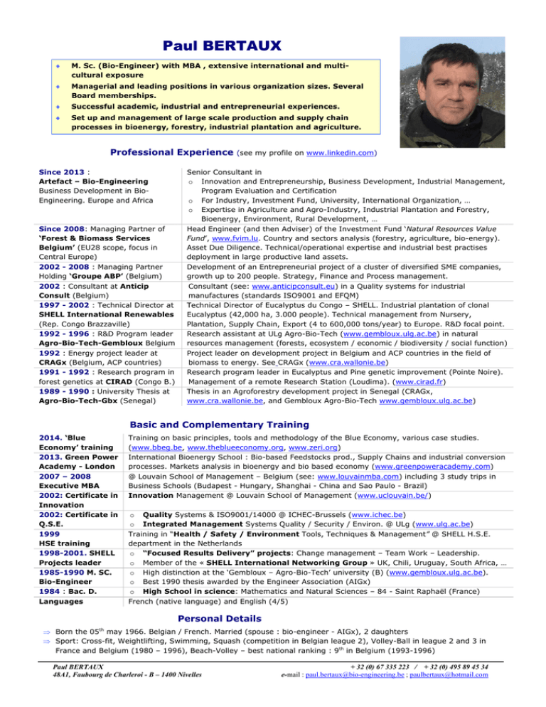 Paul BERTAUX ♦ M. Sc. (Bio-Engineer) with MBA , extensive international and multicultural exposure ♦ Managerial and leading positions in various organization sizes. Several Board memberships. ♦ Successful academic, industrial and entrepreneurial experiences. ♦ Set up and management of large scale production and supply chain processes in bioenergy, forestry, industrial plantation and agriculture. Professional Experience Since 2013 : Artefact – Bio-Engineering Business Development in BioEngineering. Europe and Africa Since 2008: Managing Partner of ‘Forest & Biomass Services Belgium’ (EU28 scope, focus in Central Europe) 2002 - 2008 : Managing Partner Holding ‘Groupe ABP’ (Belgium) 2002 : Consultant at Anticip Consult (Belgium) 1997 - 2002 : Technical Director at SHELL International Renewables (Rep. Congo Brazzaville) 1992 - 1996 : R&D Program leader Agro-Bio-Tech-Gembloux Belgium 1992 : Energy project leader at CRAGx (Belgium, ACP countries) 1991 - 1992 : Research program in forest genetics at CIRAD (Congo B.) 1989 - 1990 : University Thesis at Agro-Bio-Tech-Gbx (Senegal) (see my profile on www.linkedin.com) Senior Consultant in o Innovation and Entrepreneurship, Business Development, Industrial Management, Program Evaluation and Certification o For Industry, Investment Fund, University, International Organization, … o Expertise in Agriculture and Agro-Industry, Industrial Plantation and Forestry, Bioenergy, Environment, Rural Development, … Head Engineer (and then Adviser) of the Investment Fund ‘Natural Resources Value Fund’, www.fvim.lu. Country and sectors analysis (forestry, agriculture, bio-energy). Asset Due Diligence. Technical/operational expertise and industrial best practises deployment in large productive land assets. Development of an Entrepreneurial project of a cluster of diversified SME companies, growth up to 200 people. Strategy, Finance and Process management. Consultant (see: www.anticipconsult.eu) in a Quality systems for industrial manufactures (standards ISO9001 and EFQM) Technical Director of Eucalyptus du Congo – SHELL. Industrial plantation of clonal Eucalyptus (42,000 ha, 3.000 people). Technical management from Nursery, Plantation, Supply Chain, Export (4 to 600,000 tons/year) to Europe. R&D focal point. Research assistant at ULg Agro-Bio-Tech (www.gembloux.ulg.ac.be) in natural resources management (forests, ecosystem / economic / biodiversity / social function) Project leader on development project in Belgium and ACP countries in the field of biomass to energy. See CRAGx (www.cra.wallonie.be) Research program leader in Eucalyptus and Pine genetic improvement (Pointe Noire). Management of a remote Research Station (Loudima). (www.cirad.fr) Thesis in an Agroforestry development project in Senegal (CRAGx, www.cra.wallonie.be, and Gembloux Agro-Bio-Tech www.gembloux.ulg.ac.be) Basic and Complementary Training 2014. ‘Blue Economy’ training 2013. Green Power Academy - London 2007 – 2008 Executive MBA 2002: Certificate in Innovation 2002: Certificate in Q.S.E. 1999 HSE training 1998-2001. SHELL Projects leader 1985-1990 M. SC. Bio-Engineer 1984 : Bac. D. Languages Training on basic principles, tools and methodology of the Blue Economy, various case studies. (www.bbeg.be, www.theblueeconomy.org, www.zeri.org) International Bioenergy School : Bio-based Feedstocks prod., Supply Chains and industrial conversion processes. Markets analysis in bioenergy and bio based economy (www.greenpoweracademy.com) @ Louvain School of Management – Belgium (see: www.louvainmba.com) including 3 study trips in Business Schools (Budapest - Hungary, Shanghai - China and Sao Paulo - Brazil) Innovation Management @ Louvain School of Management (www.uclouvain.be/) o Quality Systems & ISO9001/14000 @ ICHEC-Brussels (www.ichec.be) o Integrated Management Systems Quality / Security / Environ. @ ULg (www.ulg.ac.be) Training in “Health / Safety / Environment Tools, Techniques & Management” @ SHELL H.S.E. department in the Netherlands o “Focused Results Delivery” projects: Change management – Team Work – Leadership. o Member of the « SHELL International Networking Group » UK, Chili, Uruguay, South Africa, … o High distinction at the ‘Gembloux – Agro-Bio-Tech’ university (B) (www.gembloux.ulg.ac.be). o Best 1990 thesis awarded by the Engineer Association (AIGx) o High School in science: Mathematics and Natural Sciences – 84 - Saint Raphaël (France) French (native language) and English (4/5) Personal Details ⇒ Born the 05th may 1966. Belgian / French. Married (spouse : bio-engineer - AIGx), 2 daughters ⇒ Sport: Cross-fit, Weightlifting, Swimming, Squash (competition in Belgian league 2), Volley-Ball in league 2 and 3 in France and Belgium (1980 – 1996), Beach-Volley – best national ranking : 9th in Belgium (1993-1996) Paul BERTAUX 48A1, Faubourg de Charleroi - B – 1400 Nivelles + 32 (0) 67 335 223 / + 32 (0) 495 89 45 34 e-mail : [email protected] ; [email protected] EC CV Paul Bertaux Page 1 of 4 EUROPEAN CURRICULUM VITAE 1. 2. 3. 4. 5. 6. Family name: First name: Date of birth: Nationality: Civil status: Education: Bertaux Paul 05/05/1966 Belgian Married Institution Gembloux – Agro-Bio Tech (Belgium) Date: from (month/year) to (month/year) 9/1984 to 06/1990 Degree(s) or Diploma(s) obtained Master of Science – Forestry – Agronomy (High Honours) Best 1990 thesis awarded by the Gembloux Engineer Association (A.I.Gx) Institution Louvain School of Management (Belgium) Date: from (month/year) to (month/year) 3/2007 to 09/2008 Degree(s) or Diploma(s) obtained Master of Business Administration (M.B.A.) Institution Green Power Academy (London – U.K.) Date: from (month/year) to (month/year) 12/2013 to 12/2013 Degree(s) or Diploma(s) obtained International Bioenergy School : Bio-based Feedstock production, Supply Chains and industrial conversion processes. Markets analysis in bioenergy and bio based economy Institution Brussels Blu