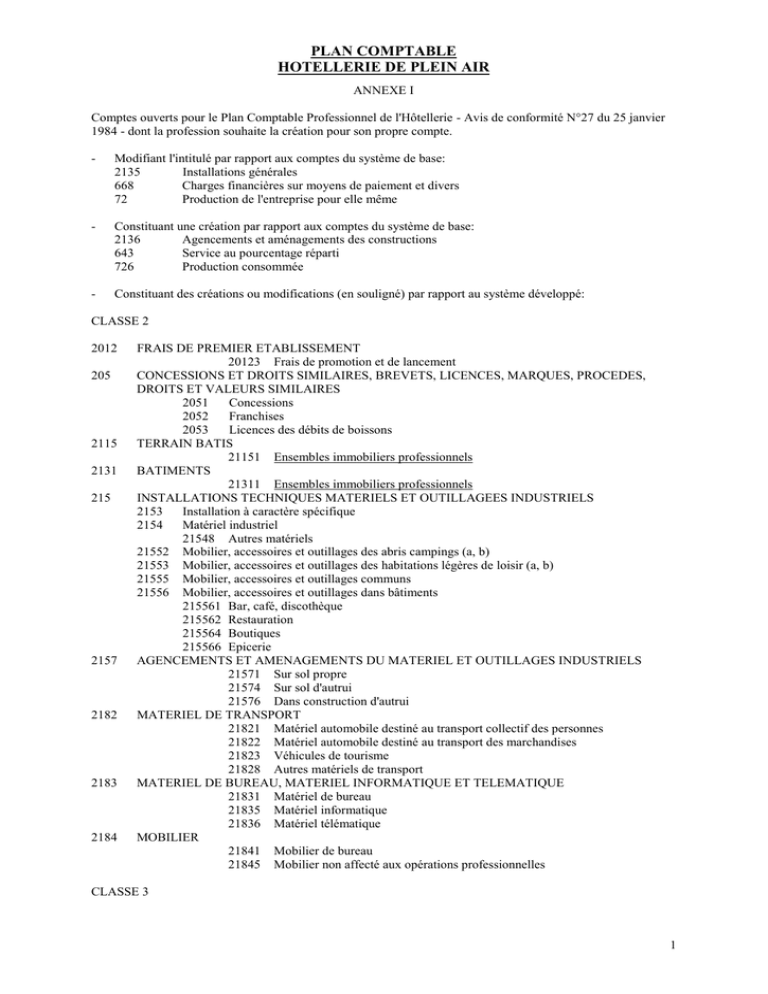 PLAN COMPTABLE HOTELLERIE DE PLEIN AIR ANNEXE I Comptes ouverts pour le Plan Comptable Professionnel de l'Hôtellerie - Avis de conformité N°27 du 25 janvier 1984 - dont la profession souhaite la création pour son propre compte. - Modifiant l'intitulé par rapport aux comptes du système de base: 2135 Installations générales 668 Charges financières sur moyens de paiement et divers 72 Production de l'entreprise pour elle même - Constituant une création par rapport aux comptes du système de base: 2136 Agencements et aménagements des constructions 643 Service au pourcentage réparti 726 Production consommée - Constituant des créations ou modifications (en souligné) par rapport au système développé: CLASSE 2 2012 205 2115 2131 215 2157 2182 2183 2184 FRAIS DE PREMIER ETABLISSEMENT 20123 Frais de promotion et de lancement CONCESSIONS ET DROITS SIMILAIRES, BREVETS, LICENCES, MARQUES, PROCEDES, DROITS ET VALEURS SIMILAIRES 2051 Concessions 2052 Franchises 2053 Licences des débits de boissons TERRAIN BATIS 21151 Ensembles immobiliers professionnels BATIMENTS 21311 Ensembles immobiliers professionnels INSTALLATIONS TECHNIQUES MATERIELS ET OUTILLAGEES INDUSTRIELS 2153 Installation à caractère spécifique 2154 Matériel industriel 21548 Autres matériels 21552 Mobilier, accessoires et outillages des abris campings (a, b) 21553 Mobilier, accessoires et outillages des habitations légères de loisir (a, b) 21555 Mobilier, accessoires et outillages communs 21556 Mobilier, accessoires et outillages dans bâtiments 215561 Bar, café, discothèque 215562 Restauration 215564 Boutiques 215566 Epicerie AGENCEMENTS ET AMENAGEMENTS DU MATERIEL ET OUTILLAGES INDUSTRIELS 21571 Sur sol propre 21574 Sur sol d'autrui 21576 Dans construction d'autrui MATERIEL DE TRANSPORT 21821 Matériel automobile destiné au transport collectif des personnes 21822 Matériel automobile destiné au transport des marchandises 21823 Véhicules de tourisme 21828 Autres matériels de transport MATERIEL DE BUREAU, MATERIEL INFORMATIQUE ET TELEMATIQUE 21831 Matériel de bureau 21835 Matériel informatique 21836 Matériel télématique MOBILIER 21841 Mobilier de bureau 21845 Mobilier non affecté aux opérations professionnelles CLASSE 3 1 PLAN COMPTABLE HOTELLERIE DE PLEIN AIR 322 FOURNITURES CONSOMMABLES 3222 Produits d'entretien et de nettoyage 3223 Fourniture d'atelier et de petit outillage 3227 Produits d'accueil 3228 Autres fournitures consommables CLASSE 4 401 411 426 443 447 467 FOURNISSEURS 4018 Autres fournisseurs CLIENTS 4112 Clients, entreprises et collectivités 4113 Clients, exposants, concessionnaires, locataires et sous-locataires 4114 Clients, agences de voyages 4115 Clients, transporteurs et intermédiaires de tourisme 4116 Clients, cartes de crédit et titres restaurant 4117 Autres clients PERSONNEL-DEPOTS 4261 Service au pourcentage à répartir OPERATIONS PARTICULIERES AVEC L'ETAT 4431 Débits de tabac - Fraction de rémunération nette versée par l'administration des impôts 4432 Débits de tabac - Redevance spéciale AUTRES IMPOTS, TAXES ET VERSEMENTS ASSIMILES 4471 Impôts, taxes et versements assimilés calculés sur rémunérations 4475 Autres impôts, taxes et versements assimilés 4476 Taxes de séjour 4477 Impôts sur les spectacles, jeux et divertissements AUTRES COMPTES DEBITEURS OU CREDITEURS 4671 Opérations avec le P.M.U. 46711 P.M.U. - Compte général 46712 P.M.U. - Tickets gagnants 46713 P.M.U. - Ventes diverses 4672 Opérations avec la Loterie nationale 46721 Loterie nationale - Compte général 46722 Loterie nationale - Billets gagnants 4673 Opérations avec le Loto national 46731 Loto national - Compte général 46732 Loto national - Tickets gagnants CLASSE 6 601 6022 606 607 6132 ACHATS STOCKES - MATIERES PREMIERES 6018 Autres matières premières FOURNITURES CONSOMMABLES 60222 Produits d'entretien et de nettoyage 60223 Fournitures d'atelier et petit outillage 60227 Produits d'accueil 60228 Autres fournitures consommables ACHATS NON STOCKES DE MATIERES ET FOURNITURES ACHATS DE MARCHANDISES 6078 Autres achats de produits divers LOCATIONS IMMOBILIERES 61321 Terrains 61322 Constructions 61351 Des emplacements 61352 Des abris de campings 2 PLAN COMPTABLE HOTELLERIE DE PLEIN AIR 616 6164 628 641 644 651 668 61353 Des habitations légères de loisir 61354 Des biens d’autrui 61355 Des communs 61356 Des commerces 61357 Des équipements de loisirs 61358 Des autres équipements PRIMES D'ASSURANCES 6162 Assurance incendie, immeuble RISQUE D'EXPLOITATION 61642 Assurance incendie et vol 61643 Assurance dégâts des eaux 61644 Assurance bris de glace 61645 Assurance matériel de transport 61646 Assurance responsabilité civile et contractuelle 61648 Autres assurances 6166 Perte d'exploitation DIVERS 6282 Décoration florale et divers assurés par des tiers 6285 Travaux informatiques à façon REMUNERATION DU PERSONNEL 6417 Avantages en nature et indemnités compensatrices 64171 Indemnités compensatrices 64173 Avantages en nature REMUNERATION DU TRAVAIL DE L'EXPLOITANT 6447 Avantages en nature REDEVANCES POUR CONCESSIONS, BREVETS, LICENCES, MARQUES, PROCEDES, DROITS ET VALEURS SIMILAIRES 6512 Redevances de franchise CHARGES FINANCIERES SUR MOYENS DE PAIEMENT 6681 Cartes de crédit 6683 Titres restaurant 6685 Chèques vacances 6688 Charges financières diverses CLASSE 7 7081 7084 709 726 751 PRODUITS DES SERVICES EXPLOITES DANS L'INTERNET DU PERSONNEL 70811 Recettes nourriture 70812 Recettes boissons 70813 Recettes cafétéria 70818 Recettes diverses 70828 Autres commissions reçues 7083 Mises à disposition diverses 70831 Mise à disposition de mobilier et matériel MISE A DISPOSITION DE PERSONNEL FACTUREE 70841 Salaires refacturés 70842 Charges sociales refacturées 70843 Charges connexes refacturées RABAIS, REMISES ET RISTOURNES ACCORDES PAR L'ENTREPRISE 7093 Sur ventes de produits résiduels PRODUCTION CONSOMMEE 7262 Prestations offertes 7264 Avantages en nature REDEVANCES POUR CONCESS