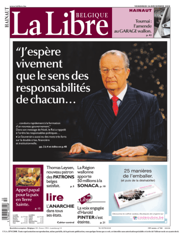 VENDREDI 26 DÉCEMBRE 2008 LaLibre BELGIQUE HAINAUT Tournai: l’amende auGARAGEwallon. p. 42 CARDON HAINAUT www.lalibre.be “J’espère vivement que le sens des responsabilités de chacun… w … conduira rapidement à la formation d’un nouveau gouvernement.” Dans son message de Noël, le Roi a rappelé à l’ordre les responsables politiques… w Le Souverain a aussi eu des mots très forts sur la double crise, financière et institutionnelle. (!4BD64F-badffi!:p;m MUSA AL-SHAER/REUTERS OLIVIER POLET/REUTERS pp. 2 à 4 et édito en p.48 Appel papal pour la paix en Terre Sainte. p. 12 LA LIBRE Antiquités pp. 37 & 38 Bourses p. 33 Cinémas p. 43 Nécrologies p. 40 Sicav pp. 34 & 36 LA LIBRE 2 Débats pp. 27 à 30 Loterie p. 22 Météo p. 22 Monsieur Dico p. 26 Télévision pp. 24 à 26 Thomas Leysen, nouveau patron des PATRONS belges satisfait. p. 5 La Région wallonne apporte 50 millions à la SONACA. p. 18 L’ANARCHIE La voix engagée dans tous d’Harold ses états. PINTER s’est Cahier central éteinte. p. 21 Quotidien européen – Belgique 1 € – France 1,70 € – Luxembourg 1 € Tél.: 02/744.44.44 25 manières de l’emballer. (et puis de la déshabiller) Découvrez le coffret cadeau Boutiques de Lingerie sur 125e année – n° 361 HHHH © S.A. IPM 2008. Toute représentation ou reproduction, même partielle, de la présente publication, sous quelque forme que ce soit, est interdite sans autorisation préalable et écrite de l'éditeur ou de ses ayants droit. LE FAIT DU JOUR Et auparavant ? La question ne se pose pas : le discours de Noël n’est devenu systématique qu’en 1961, plus tard (1983) élargi au 21 juillet. Tout cela L’historien Vincent Dujardin (UCL), cité mercredi donc sous l’ère du roi Baudouin. En décembre 2007, par “Le Soir”, a calculé que le Roi avait déjà prononcé Albert II n’avait eu droit, au moment de son discours, à six reprises son discours de Noël alors que son qu’à un gouvernement de toute justesse, et à titre gouvernement était démissionnaire (soit sous transitoire, piloté par Guy Verhofstadt. Le 21 juillet Gaston Eyskens deux fois, Edmond Leburton et Paul qui suivrait, Yves Leterme lui avait déjà remis sa Vanden Boeynants une fois et… Wilfried Martens, démission, une première fois, alors tenue en présentement explorateur royal, deux fois). suspens. n BELGA Message de crise : loin d’être une première ,, REPÈRES LA PHRASE Crise politique | Le discours royal ,, Je n’ai pas changé depuis 15 ans. Je dis que la politique n’est pas tout dans la vie… HERMAN VAN ROMPUY Le président (CD&V) de la Chambre confirme ainsi qu’il n’est pas candidat Premier ministre. Il l’avait déjà dit clairement en 1994 lorsque, vice-Premier, il aurait pu succéder à Jean-Luc Dehaene si celui-ci avait été nommé président de la Commission européenne. (VRT, 23/12) Un gouvernement, vite w Le Roi n’a pas éludé l’actualité de crise(s). w Il en appelle au sens des responsabilités pour une formation rapide de gouvernement. w Il évoque aussi “l’enjeu essentiel” d’une nouvelle réforme de l’Etat. une autonomie, des compétences et des responsabilités accrues aux entités fédérées, sans remise en cause de la solidarité interpersonnelle”. J’espère vivement que, malgré les difficultés, ces travaux se poursuivront dans un esprit constructif et aussi dans l’indispensable discrétion. L’enjeu est essentiel pour notre pays et le bien-être de tous. Mais il est aussi d’une grande importance pour d’autres dans le monde. Ainsi, j’ai été très frappé par une déclaration de Mme Ingrid Betancourt lors de son passage en Belgique. Elle disait, en s’adressant à des journalistes belges : “Je suis convaincue que votre générosité tient au fait que la Belgique a toujours vécu avec deux cultures qui se sont entendues, malgré des différences. Le monde a besoin de cela. Il y a trop d’intolérance, trop de solutions de facilité. Trop souvent, on se dit qu’on pourrait vivre chacun de son côté. C’est trop facile.” V oici, dans son intégralité, le discours du Roi diffusé mercredi à l’occasion des fêtes de Noël et de Nouvel An 2008/2009. “Mesdames et Messieurs, La Reine et moi et toute notre famille vous souhaitons de bonnes fêtes de Noël et de Nouvel An. Elles sont l’occasion de repenser à l’année écoulée et de former des vœux pour 2009. Une nouvelle crise politique Des produits dits toxiques La Belgique, comme l’ensemble du monde, est secouée par la crise financière la plus sérieuse depuis les années 30. Celle-ci trouve son origine dans le développement de produits financiers incontrôlés, liés à des prêts hypothécaires risqués aux EtatsUnis. Ils étaient tellement compliqués et sophistiqués que la majorité des responsables financiers ne parvenaient plus à en déterminer la valeur réelle. Ces produits, dits toxiques, ont néanmoins été mis sur le marché. Ils furent acquis par des institutions financières dans le monde entier, à la recherche de marges de profits toujours plus grandes. 2 VENDREDI 26 DÉCEMBRE 2008 Soldats d’un monde meilleur OLIVIER POLET/BELGA Notre pays est secoué par une nouvelle crise politique qui trouve son origine dans la crise financière internationale et ses répercussions en Belgique dans le domaine judiciaire. J’espère vivement que le sens des responsabilités de chacun conduira rapidement à la formation d’un nouveau gouvernement, en mesure de continuer à affronter efficacement les défis économiques, sociaux et financiers urgents de notre pays, et d’avancer dans la nécessaire réforme de l’Etat. Je voudrais à présent partager avec vous quelques réflexions sur la crise financière internationale et sur nos problèmes institutionnels. M “Que les crises financières, économiques et institutionnelles soient résolues, chacune le mieux et le plus rapidement possible”. Face à la débâ
