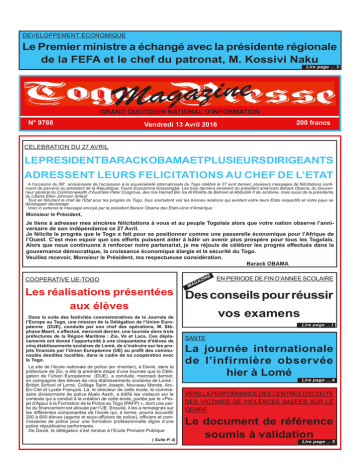 DEVELOPPEMENT ECONOMIQUE Le Premier ministre a échangé avec la présidente régionale de la FEFA et le chef du patronat, M. Kossivi Naku N° 9701 N° 9788 e n i z a Mag GRAND QUOTIDIEN D’INFORMATION VendrediNATIONAL 8 Janvier 2016 Vendredi 13 Avril 2016 Lire page ... 3 200 francs 200 francs CELEBRATION DU 27 AVRIL LEPRESIDENTBARACKOBAMAETPLUSIEURSDIRIGEANTS ADRESSENT LEURS FELICITATIONS AU CHEF DE L’ETAT A l’occasion du 56e anniversaire de l’accession à la souveraineté internationale du Togo célébré le 27 avril dernier, plusieurs messages de félicitations continuent de parvenir au président de la République, Faure Essozimna Gnassingbé. Les tous derniers émanent du président américain Barack Obama, du Gouverneur général du Commonwealth d’Australie Peter Cosgrove, des rois Hamad Bin Isa Al Khalifa de Bahrein et Abdullah II de Jordanie, mais aussi de la présidente du Libéria Ellen Johnson Sirleaf Tout en félicitant le chef de l’Etat pour les progrès du Togo, tous souhaitent voir les bonnes relations qui existent entre leurs Etats respectifs et notre pays se développer davantage. Voici in extenso le message envoyé par le président Barack Obama des Etats-Unis d’Amérique : Monsieur le Président, Je tiens à adresser mes sincères félicitations à vous et au peuple Togolais alors que votre nation observe l’anniversaire de son indépendance ce 27 Avril. Je félicite le progrès que le Togo a fait pour se positionner comme une passerelle économique pour l’Afrique de l’Ouest. C’est mon espoir que ces efforts puissent aider à bâtir un avenir plus prospère pour tous les Togolais. Alors que nous continuons à renforcer notre partenariat, je me réjouis de célébrer les progrès effectués dans la gouvernance démocratique, la croissance économique élargie et la sécurité du Togo. Veuillez recevoir, Monsieur le Président, ma respectueuse considération. Barack OBAMA E IN EN PERIODE DE FIN D’ANNEE SCOLAIRE AZ COOPERATIVE UE-TOGO Les réalisations présentées aux élèves Dans la suite des festivités commémoratives de la Journée de l’Europe au Togo, une mission de la Délégation de l’Union Européenne (DUE), conduite par son chef des opérations, M. Stéphane Meert, a effectué, mercredi dernier, une tournée dans trois préfectures de la Région Maritime : Zio, Vo et Lacs. Ces déplacements ont donné l’opportunité à une cinquantaine d’élèves de cinq établissements scolaires de Lomé, de s’instruire sur les projets financés par l’Union Européenne (UE) au profit des communautés desdites localités, dans le cadre de sa coopération avec le Togo. Le site de l’école nationale de police (en chantier), à Davié, dans la préfecture de Zio, a été la première étape d’une tournée que la Délégation de l’Union Européenne (DUE) a conduite, mercredi dernier, en compagnie des élèves de cinq établissements scolaires de Lomé : British School of Lomé, Collège Saint Joseph, Nouveau Monde, ArcEn-Ciel et Lycée Français. Là, le directeur de cette école, le commissaire divisionnaire de police Abalo Assih, a édifié les visiteurs sur le contexte qui a conduit à la création de cette école, portée par le «Projet d’Appui à la Formation de la Police au Togo (PAFP) », dont une partie du financement est allouée par l’UE. Ensuite, il les a renseignés sur les différentes composantes de l’école qui, à terme, pourra accueillir 200 à 600 élèves (agents et sous-officiers de police), officiers et commissaires de police pour une formation professionnelle digne d’une police républicaine performante. De Davié, la délégation s’est rendue à l’Ecole Primaire Publique ( Suite P. 4) G MA Des conseils pour réussir vos examens Lire page ... I SANTE La journée internationale de l’infirmière observée hier à Lomé Lire page ... 3 Lire page ... 3 page ... 4 Lire VERS LA PERFORMANCE DES CENTRES D’ECOUTE DES VICTIMES DE VIOLENCES BASEES SUR LE GENRE Le document de référence soumis à validation Lire page ... 5 2 INFORMATIONS SERVICE Togo - Presse - N° 9788 du 13 Mai 2016 HOROSCOPE DU SAMEDI 14 Mai 2016 NAISSANCES : Si votre bébé naît entre le 13 mai et le 14 mai. Passionné par tout ce qui l’entoure. Ce sera un bébé tonique, souriant. Très vite, il aura envie d’élargir son périmètre de circulation. Plutôt sociable et concerné par ce qui arrive aux autres, il aime aussi son indépendance. BELIER : 21 mars - 20 avril CANCER : 22 juin-22 juillet Profession : Expliquez bien les choses Profession : Vous serez dynamique et aurez l’occasion de vous dépenser dans aux enfants. Ils ne peuvent pas tout comun tas d’activités. Mais prudence ! prendre par eux-mêmes. Affection : De sérieux conflits pourraient Affection : Bonne ambiance en famille. vous opposer à votre partenaire. Santé : Attention à la fatigue. Santé : Détendez-vous. LION : 23 juil-22 août TAUREAU : 21 avril-21 mai CAPRICORNE : 22 déc-20 janv BALANCE : 23 sept - 22 oct. Profession : Prenez des initiatives. On Profession : Au travail l’ambiance devrait être détendue, productive, ne vous en voudra pas d’avoir essayé. Affection : Ne perdez pas contact avec vos ami (e)s. Profession : Il faudra régler quelques détails administratifs. Affection : Vous serez généreux avec vos sentiments. Santé : Doucement si vous reprenez une activité sportive. Affection : Vous nouerez facilement les amitiés. Santé : De l’énergie à revendre. Santé : Bonne résistance de fond. SCORPION : 23 oct-22 nov. Profession : Les histoires d’argent pren- Profession : Votre soif d’aventure sera Profession : Bonne période pour dront des airs de casse-tête chinois. étanchée par une excursion surprenante. prendre des décisions professionnelles ou matérielles. Affection : Souvenirs, journée nostal- Affection : La séduction viendra pimenAffection : La parole, c’est bien, l’action gique. ter cette journée. c’est mieux surto
