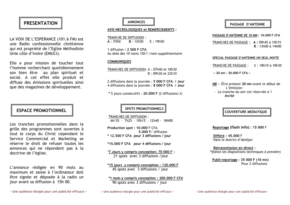 PRESENTATION ANNONCES PASSAGE D’ANTENNE AVIS NECROLOGIQUES et REMERCIEMENTS : LA VOIX DE L’ESPERANCE (101.6 FM) est une Radio confessionnelle chrétienne qui est propriété de l’Eglise Méthodiste Unie côte d’Ivoire (EMUCI). TRANCHE DE DIFFUSION : A : 7H50 B : 12h50 Elle a pour mission de toucher tout l’homme recherchant quotidiennement son bien être au plan spirituel et social. A cet effet elle produit et diffuse des émissions spirituelles ainsi que des magazines de développement. COMMUNIQUES PASSAGE D’ANTENNE DE 10 MN : 10.000 F CFA C : 19h50 1 diffusion : 2 500 F CFA Au delà des 10 noms 150 f /nom supplémentaire TRANCHES DE DIFFUSION: A : 07h40 et 18h30 B : 09h30 et 22h10 2 diffusions dans la journée : 5 000 F CFA / Jour 4 diffusions dans la journée : 8 000 F CFA / Jour * 5 jours consécutifs : 20.000 F (2 diffusions/J) ESPACE PROMOTIONNEL Les tranches promotionnelles dans la grille des programmes sont ouvertes à tout le corps du Christ cependant le Service Commercial et Marketing se réserve le droit de refuser toutes les annonces qui ne répondent pas à la doctrine de l’église. L’annonce rédigée en 90 mots au maximum et saisie à l’ordinateur doit être signée et déposée à la radio un jour avant sa diffusion à 15h 00. « Une audience élargie pour une publicité efficace » SPOTS PROMOTIONNELS TRANCHES DE PASSAGE : A : 09h45 à 10h15 B : 13h00 à 14h00 SPECIAL PASSAGE D’ANTENNE UN SEUL INVITE TRANCHE DE PASSAGE : C : 18h10 à 18h30 « 20 mn : 20.000 F CFA » NB :- Être présent 30 mn avant le début de L’émission - La tranche du soir est réservée à 1 Invité COUVERTURE MEDIATIQUE TRANCHES DE DIFFUSION : 6H 55 – 7h25 – 10h15 – 12h40 - 18H00 Production spot : 10.000 F CFA 5.000 F/ diffusion * 12.500 F CFA pour 3 diffusions / jour *15.000 F CFA pour 4 diffusions / jour *7 Jours y compris conception: 70 000 F : 21 spots avec 3 diffusions /jour *15 jours y compris conception : 120.000 F Reportage (flash info) : 15 000 F Différé : 45.000 F *dans le district d’Abidjan Retransmission en direct : *(Selon les dispositions techniques à prendre) Publi-reportage : 35 000 F (10 mn) Pour 2 diffusions 45 spots avec 3 diffusions / jour *1 mois y compris conception : 200.000 F CFA 90 spots avec 3 diffusions / jour « Une audience élargie pour une publicité efficace » « Une audience élargie pour une publicité efficace» « LA VOIX DE L’ESPERANCE » PROMOTION MUSICALE PROMOTION LITTERAIRE FM 101.6 La radio de l’Eglise Méthodiste Unie Côte d’Ivoire Cocody ambassade TRANCHE DE DIFFUSION : 08h45– 11h05 – 18H50 lundi mardi jeudi vendredi 20h50 samedi 21h10 dimanche ASAPH (1 mois) : 150.000 F CFA - 90 spots Play-List 03 diffusions par jour 4 passages antenne à 13 h (10 mn) 2 passages antenne à 18 h (20 mn) JOSEPH (2 mois) : 250.000 F CFA - 180 spots Play-List 03 diffusions par jour 6 passages antennes à 13 h (10 mn) 4 passages antennes à 18h10 (20 mn) DAVID (3 mois) : 300.000 F CFA - 270 spots Play-List 03 diffusions par jour s 8 passages antennes à 13 h (10 mn) 6 passages à 18 h (20 mn) Emission ‘’Voix et Voie de Chantre’’ PLAY-LIST : 70.000 F CFA 3 diffusions/jour 1 mois « Une audience élargie pour une publicité efficace » 5 jours : 30.000 F CFA 15 spots 2 passages antennes (10mn) Tél: (225) 22 44 61 79 01 BP1282 Abidjan 01 Site Web: lavoixdelesperance.org Email: [email protected] 1 mois : 75.000 F CFA 90 spots - 4 directs : 2 (10mn) et 2 (20mn) - 1 Passage à l’émission littéraire « Parole et lecture » [email protected] TARIFS PACKAGE TABITHA : 70 000 F CFA - « 1 semaine » - 12 communiqués - 9 spots de 45’’ - 2 Passages antennes (10mn) DIFFUSIONS : Du Lundi au Dimanche 24H/24H SARA : 100.000 F CFA « 2 semaines » - 18 spots de 45’’ - 24 communiqués - 4 Passages antennes (10mn) « Une audience élargie pour une publicité efficace » « QUE DIEU VOUS BENISSE ! » « Une audience élargie pour une publicité efficace»