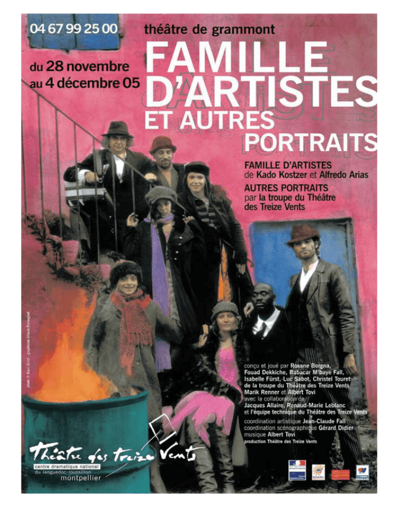 Famille d'artistes et autres portraits 28 et 29 novembre et 1er, 2, 3, 4 décembre 05 Théâtre de Grammont, Domaine de Grammont - Montpellier Attention, horaires particuliers lundi 28 novembre à 20h00 mardi 29 novembre à 20h00 mercredi 30 novembre relâche jeudi 1er décembre à 19h00 vendredi 2 décembre à 20h00 samedi 3 décembre à 20h00 dimanche 4 décembre 16h00 Durée : 3h30 Tarifs hors abonnement Général : 20 € Réduit (collégiens, lycéens, étudiants, groupes) : 12,50 € Billetterie bureau de location Hall de l'Opéra Comédie, Montpellier Tel. 04 67 99 25 00 Famille d'artistes et autres portraits coordination artistique Jean-Claude Fall coordination scénographique Gérard Didier musique Albert Tovi maquillages, coiffures Sandrine Finck créations techniques Martine André, Jacky Baume, Claude Champel, Marie Delphin, Gérard Espinosa, François Guille des Buttes, Bernard Lhomme, Serge Monségu, Frédéric Razoux, Jean Louis Wisson Famille d’artistes de Kado Kostzer et Alfredo Arias (Actes Sud Papier) avec la troupe du Théâtre des Treize Vents Roxane Borgna Fouad Dekkiche Isabelle Fürst Marietta Finochietto chanteuse lyrique Emma Finochietto mère des Finochietto, pianiste Raimonda Finochietto voyante et astrologue et Carola Finochietto artiste peintre, sœur jumelle de Raimonda Babacar M’baye Fall Luc Sabot Christel Touret Maître Boris Sitbon fonctionnaire municipal Pocho Finochietto écrivain et poète Fryda Finochietto danseuse éclectique d'Europe, d'Amérique et d'Orient et Marik Renner Albert Tovi Carmen la petite bonne de la maison musicien …et autres portraits - carte blanche à la troupe, occupation du théâtre dans la salle de bain dans la cuisine extrait de Belle extrait de du Seigneur La pluie d’été d’Albert Cohen de Marguerite Duras proposé et joué par Roxane Borgna, en collaboration avec Renaud-Marie Leblanc et JeanClaude Fall proposé et joué par Fouad Dekkiche, avec Babacar M’baye Fall et Marik Renner dans la cour dans la cave dans le jardin chansons françaises Marx matériau épisode 1/ celui qui parle installation plastique et sonore proposées, jouées et chantées par Isabelle Fürst avec Albert Tovi proposé et joué par Luc Sabot, conçu et réalisé avec Jacques Allaire Production Théâtre des Treize Vents, Centre Dramatique National de Montpellier Languedoc-Roussillon proposée par Christel Touret, avec la collaboration de Serge Monségu Famille d'artistes et autres portraits Les spectateurs entrent dans « la grande maison » en ruine où vit cette « grande famille » : Doña Emma Finochietto, ses filles Fryda la danseuse éclectique, Marietta la chanteuse fantasmée, Carola la peintre en panne d’orangé, Raimonda la chiromancienne sans avenir, son fils Pocho le poète sans papiers et « la bonne » Carmen. Ils vivent sous le regard du père défunt Don Pietro Finochietto et sous la menace d’une expulsion imminente pour cause d’autoroute. L’huissier philatéliste Sitbon est chargé de la besogne. Ils espèrent être sauvés par le grand Max Merrick, l’agent de toutes les stars du show biz, qui ne saurait manquer de les découvrir et de révéler leurs talents (bien cachés) au monde éberlué. Au premier et deuxième acte, nous les voyons désespérer du monde puis espérer follement ce grand miracle. Nous les voyons vivre entre fiction et réalité, se disputer, se réconcilier, se solidariser contre Sitbon, tenter de séduire Merrick dans un tourbillon de passions. A la fin du deuxième acte, les spectateurs sont invités à pénétrer à l’intérieur de leur maison. Qui dans la cuisine, qui dans la cave, qui dans la salle de bain, qui dans le terrain vague attenant, qui dans le jardin d’hiver. Là, les Finochietto leur feront découvrir leur jardin secret (qui doit ici le rester). Au troisième acte, tous (spectateurs et acteurs) se retrouvent sur le plateau pour la scène finale, la Cène finale, le repas d’adieu des Finochietto en partance pour l’Eldorado des artistes, le pays des étoiles. Ils vont rejoindre les « stars ». Famille d’Artistes est un spectacle parcours, un spectacle partage, un show où l’on se montre sous le meilleur et le pire des jours. Un spectacle sur les artistes, plein de leurs rires, de leurs pleurs, de leurs amours, de leurs chagrins, de leurs espérances. Un spectacle messager d’un monde ludique et déraisonnable. Un spectacle sur l’Art, donc inutile, irrécupérable, profondément humain, et strictement nécessaire. Jean Claude Fall croquis Gérard Didier L'espace visité (ou maintenant ?) Après l'expérience de Blancs* où les spectateurs traversaient l'exposition de mes peintures pour cheminer dans un labyrinthe, guidés par des plumes blanches suspendues au-dessus de leur tête et assister à la représentation de Ma Solange…, Clandestins, et Dors mon petit enfant dans des scénographies différentes pour chaque pièce - frontale, en vis-à-vis et en ovale -, il nous a paru évident à JeanClaude Fall et moi-même ainsi qu'à toute l'équipe du théâtre, de poursuivre cette expérience de mobilité du spectateur. De continuer de se poser la question de la place du public. L'offre d'une place de théâtre se réduisant presque toujours à l'offre d'un siège (plus ou moins confortable) où chacun luttant pour avoir la meilleure proximité avec la scène, se trouve immobilisé le temps de la représentation dans le rôle du spectateur, du témoin oculaire et sensible mais isolé à sa place, la seule mobilité qu'il s'autorise étant celle de quitter le théâtre… Dans Famille d'artistes et autres portraits, nous tenterons de bousculer les règles du jeu de la mise en place du public dans l'espace-temps de la représentation, en déplaçant celui-ci de manière ludique. Un déplacement du public qui sera aléatoire et peu explicite puisqu'en dehors de la pièce centrale Famille d'artistes personne ne verra la même chose, les cinq "bulles" proposées par