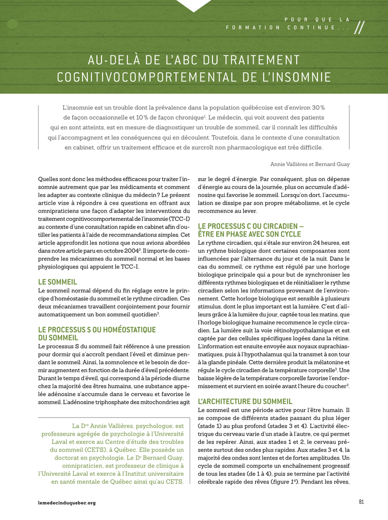 p o u r q u e l a p o u r q u e l a f o r m a t i o n c o n t i n u e . . . F OR M A T I O N C O N T I N UE // Au-delà de l’ABC du traitement cognitivocomportemental de l’insomnie L’insomnie est un trouble dont la prévalence dans la population québécoise est d’environ 30 % de façon occasionnelle et 10 % de façon chronique1. Le médecin, qui voit souvent des patients qui en sont atteints, est en mesure de diagnostiquer un trouble de sommeil, car il connaît les difficultés qui l’accompagnent et les conséquences qui en découlent. Toutefois, dans le contexte d’une consultation en cabinet, offrir un traitement efficace et de surcroît non pharmacologique est très difficile. Annie Vallières et Bernard Guay Quelles sont donc les méthodes efficaces pour traiter l’insomnie autrement que par les médicaments et comment les adapter au contexte clinique du médecin ? Le présent article vise à répondre à ces questions en offrant aux omnipraticiens une façon d’adapter les interventions du traitement cognitivocomportemental de l’insomnie (TCC-I) au contexte d’une consultation rapide en cabinet afin d’outiller les patients à l’aide de recommandations simples. Cet article approfondit les notions que nous avions abordées dans notre article paru en octobre 20042. Il importe de com prendre les mécanismes du sommeil normal et les bases physiologiques qui appuient le TCC-I. Le sommeil Le sommeil normal dépend du fin réglage entre le principe d’homéostasie du sommeil et le rythme circadien. Ces deux mécanismes travaillent conjointement pour fournir automatiquement un bon sommeil quotidien3. Le processus S ou homéostatique du sommeil Le processus S du sommeil fait référence à une pression pour dormir qui s’accroît pendant l’éveil et diminue pendant le sommeil. Ainsi, la somnolence et le besoin de dormir augmentent en fonction de la durée d’éveil précédente. Durant le temps d’éveil, qui correspond à la période diurne chez la majorité des êtres humains, une substance appelée adénosine s’accumule dans le cerveau et favorise le sommeil. L’adénosine triphosphate des mitochondries agit La Dre Annie Vallières, psychologue, est professeure agrégée de psychologie à l’Université Laval et exerce au Centre d’étude des troubles du sommeil (CETS), à Québec. Elle possède un doctorat en psychologie. Le Dr Bernard Guay, omnipraticien, est professeur de clinique à l’Université Laval et exerce à l’Institut universitaire en santé mentale de Québec ainsi qu’au CETS. lemedecinduquebec.org sur le degré d’énergie. Par conséquent, plus on dépense d’énergie au cours de la journée, plus on accumule d’adénosine qui favorise le sommeil. Lorsqu’on dort, l’accumulation se dissipe par son propre métabolisme, et le cycle recommence au lever. Le processus C ou circadien – être en phase avec son cycle Le rythme circadien, qui s’étale sur environ 24 heures, est un rythme biologique dont certaines composantes sont influencées par l’alternance du jour et de la nuit. Dans le cas du sommeil, ce rythme est régulé par une horloge biologique principale qui a pour but de synchroniser les différents rythmes biologiques et de réinitialiser le rythme circadien selon les informations provenant de l’environnement. Cette horloge biologique est sensible à plusieurs stimulus, dont le plus important est la lumière. C’est d’ailleurs grâce à la lumière du jour, captée tous les matins, que l’horloge biologique humaine recommence le cycle circadien. La lumière suit la voie rétinohypothalamique et est captée par des cellules spécifiques logées dans la rétine. L’information est ensuite envoyée aux noyaux suprachiasmatiques, puis à l’hypothalamus qui la transmet à son tour à la glande pinéale. Cette dernière produit la mélatonine et régule le cycle circadien de la température corporelle3. Une baisse légère de la température corporelle favorise l’endor missement et survient en soirée avant l’heure du coucher3. L’architecture du sommeil Le sommeil est une période active pour l’être humain. Il se compose de différents stades passant du plus léger (stade 1) au plus profond (stades 3 et 4). L’activité électrique du cerveau varie d’un stade à l’autre, ce qui permet de les repérer. Ainsi, aux stades 1 et 2, le cerveau présente surtout des ondes plus rapides. Aux stades 3 et 4, la majorité des ondes sont lentes et de fortes amplitudes. Un cycle de sommeil comporte un enchaînement progressif de tous les stades (de 1 à 4), puis se termine par l’activité cérébrale rapide des rêves (figure 1 4). Pendant les rêves, 81 figure 1 Hypnogramme typique Cycle 1 Éveil Sommeil paradoxal Sommeil 1 lent léger 2 Cycle 2 Cycle 3 Cycle 4 Sommeil 3 lent profond 4 23 h 0h 1h 2h 3h 4h 5h 6h Source : Dubuc B. Nos différents sommeils. Centre de recherche de l'Institut Douglas et Institut des neurosciences, de la santé mentale et des toxicomanies. Site Internet : http://lecerveau.mcgill.ca/flash/d/ d_11/d_11_p/d_11_p_cyc/d_11_p_cyc.html (Date de consultation : janvier 2014). Reproduction autorisée. tableau I Caractéristiques du rêve3* Activité cérébrale rapide Atonie musculaire complète, sauf pour le diaphragme et les yeux h Mouvements oculaires rapides hÉrection h h * On a appelé le rêve « sommeil paradoxal », car l’activité cérébrale rapide est accompagnée d’une absence de tonus musculaire. Dans la littérature anglophone, cette phase a été nommée d’après les mouvements rapides des yeux (REM-Sleep pour Rapid Eye Movement Sleep). le cerveau présente des ondes rapides semblables à ceux de la phase d’éveil, tandis que les yeux ont des mouvements oculaires rapides observables lorsque les paupières sont fermées (tableau I). Il est tout à fait normal d’avoir des éveils pendant un rêve ou d’être tout près de ce stade de sommeil. Un être humain expérimente en