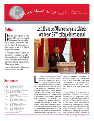 Journal international n°-29 - septembre/octobre 2013 Édito B ienvenue à nos collègues en cette rentrée 2013 : cette année ce seront 50 directeurs et directeurs adjoints, dont 12 délégués généraux de la Fondation et 7 chargés de mission qui prendront leur poste au sein de 65 Alliances françaises dans le monde. Ils ont pu participer pour la plupart aux trois journées d’intégration que la Fondation organise chaque année, boulevard Raspail, à l’attention des nouveaux partants. Ils ont également fêté avec nous les 130 ans de notre réseau. A chacun, l’équipe de la Fondation souhaite une excellente installation. Sommaire p. 2/3 p. 4/6 7/8/9 p. 10 p. 11/12 p. 13 p. 14/15 p. 16 Colloque internatioanl Partenaires du colloque Fête de la Musique AF de Nairobi (Kenya) AF de Buenos Aires (Argentine) AF de Lima (Pérou) AF de Mexico (Mexique) AF de St Domingue (République dominicaine) p. 17 AF Nice/Macao (France/Chine) AF de Panjim (Inde) p. 18 AF de Sapporo (Japon) AF de Dubai (Emirats arabes unis) P. 19 AF de Lahore (Pakistan) p. 20 AF de Melbourne (Australie) AF de Tianjin (Chine) p. 21 AF de Dublin (Irlande) p. 22 AF de La Haye (Pays bas) p. 23 AF de Nice (France) AF de Pecs (Hongrie) p. 24/25 Communication Les 130 ans de lème’Al iance française célébrés lors de son 35 colloque international L M. François Hollande, président de la République française a Fondation Alliance française a célébré le 130ème anniversaire de l’Alliance française lors de son 35ème colloque international qui s’est tenu les 16 et 17 juillet derniers. Le thème « La culture est une fête » a été choisi pour l’occasion et c’est la ministre de la Culture, Mme Aurélie Filippetti, qui a inauguré cet événement international. 547 responsables d’Alliances françaises étaient présents (172 présidents, 243 directeurs et 132 membres des conseils d’administration) représentant 99 pays. Tous étaient réunis dans le théâtre de l’Alliance française et dans l’auditorium où étaient retransmis les discours sur grand écran. Après les allocutions de la ministre et du président de la Fon- dation, M. Jean-Pierre de Launoit, le secrétaire général, M. Jean-Claude Jacq, a surpris l’auditoire avec une interprétation très applaudie de la chanson Vous de Guy Béart, confirmant ainsi que la culture était une fête ! Pour le déjeuner, le président de la République française, M. François Hollande, a convié les présidents et directeurs des Alliances françaises à une réception à l’Elysée, afin de les remercier du travail qu’ils accomplissent, au quotidien, partout dans le monde. Dans son discours, le président a fait l’éloge de la langue française, et a fait un aparté en parlant de son grandpère, instituteur, qui lui « apprenait le Le Fil d’Alliances 29 - p. 1 suite... dictionnaire » en lui lisant une page par jour. « Le français, c’est une langue pleine de découverte, il y a des mots que l’on apprend à connaître même au soir de la vie… langue qui a la vertu de conférer ses pièges et ses difficultés, plus de beauté à tout ce qu’elle désigne » a-t-il précisé. Il a ajouté que «la langue française, c’est une langue de l’émancipation. Apprendre le français, c’est pouvoir lire dans le texte la Déclaration des droits de l’Homme et du citoyen de 1789, celle de 1948… Apprendre le français, c’est déchiffrer les langages de la liberté ». Promouvant la francophonie, il a précisé que, «si l’on se bat pour une langue, on ne se bat pas en défensif, on ne se bat pas contre, on se bat toujours pour partager». Mme Yamina Benguigui (ministre de la Francophonie) et Mme Hélène Conway-Mouret (ministre des Français de l’étranger) étaient également présentes à la réception. Durant le cocktail qui a suivi, le président a échangé quelques mots avec nombre d’invités. Les débats ont repris l’après-midi au siège de la Fondation, avec une séance de dialogue sur le thème « Familles de paysages, paysages de familles » où sont intervenus avec brio : Aldo Naouri, pédiatre, et JeanRobert Pitte, géographe. Une table ronde « Sous les livres, la langue » a ensuite donné lieu à des échanges entre les linguistes Henriette Walter et Bernard Cerquiglini, et de quatre autres écrivains : Fatou Diome, Yann Kerlau, Shan Sa et Zoé Valdès. Le soir même, les participants au colloque, les partenaires et des invités extérieurs de la Fondation ont été conviés à une grande soirée au Centre Pompidou où ils ont pu visiter en privé l’exposition permanente d’art contemporain, danser avec l’orchestre du Bal de l’Elysée Montmartre qui a repris les grands standards français Colloque et savourer les mets du buffet dinatoire offert par le Cordon Bleu, partenaire de l’événement. Le 17 juillet au matin, deux tables rondes se sont succédé. La première, sur le thème « Voix du monde », a permis aux présidents d’Alliances françaises de présenter à l’auditoire un texte littéraire cher à leur cœur dans le cadre d’une réflexion sur l’importance de la culture dans leur vie : M. Pat Cox (Dublin), Goéry Delacôte (Paris Ile-de-France), M. Kuda Dhoro (Harare), M. David Kent (Sydney), Mme Angelica Uribe Gaviria (Bogota), Princesse Zatashah Idris (Kuala Lumpur). La seconde table ronde, sur le thème « Création, politique et culture», a fait intervenir M. Dominique Wolton, sociologue, M. Malo Girod de l’Ain, dirigeant, Digital Art International, Mme Sylvie Goulard, députée européenne. Un déjeuner « Goût des terroirs », avec de nombreux partenaires gastronomiques, a clôturé cette manifestation dans un esprit estival avec des stands installés dans la cour et à l’intérieur des locaux. Une performance artistique éphémère, pour célébrer les 130 ans de l’Alliance française, a été réalisée par trois graffeurs de talent, sur une bâche plastique de 20 m de lon