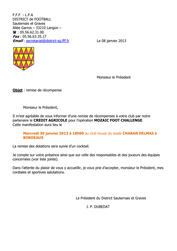 F.F.F - L.F.A DISTRICT de FOOTBALL Sauternais et Graves Allée Garros – 33210 Langon – : 05.56.62.31.00 Fax : 05.56.63.35.17 Email : [email protected] Le 08 janvier 2013 Monsieur le Président Objet : remise de récompense Monsieur le Président, Il m’est agréable de vous informer d’une remise de récompenses à votre club par notre partenaire le CREDIT AGRICOLE pour l’opération MOZAIC FOOT CHALLENGE. Cette manifestation aura lieu le Mercredi 30 janvier 2013 à 18h00 au club house du stade CHABAN DELMAS à BORDEAUX La remise des dotations sera suivie d’un cocktail. Je compte sur votre présence ainsi que sur celle des responsables et des joueurs des équipes concernées (voir liste jointe). Dans l’attente du plaisir de vous y accueillir, je vous prie d’accepter, monsieur le Président, mes cordiales et sportives salutations. Le Président du District Sauternais et Graves J. P. DUBEDAT Dotations de fin de saison 2011-2012 CR Aquitaine : 3 premiers de chacune des 6 catégories Equipes primées par catégorie : • ère 1 catégorie : SENIORS Classement ème 3 prix : ème 2 prix : er 1 prix : • ème 2 Nom de l’équipe Savignac Joyeuse Beguey Cadillac Fc Cadaujac Sc catégorie : U 19 (moins de 19ans) Classement ème 3 prix : ème 2 prix : er 1 prix : • ème 3 Nom de l’équipe Gironde Reole Fc St Médard d’Eyrans U.S. Bazas Patronage ème 4 Nom de l’équipe La Brede Fc Langon Fc ème 5 Nom de l’équipe Langon Fc La Brede Fc Langon Fc ème 6 Numéro de l’équipe 2 2 1 catégorie : U 13 (benjamins) Classement ème 3 prix : ème 2 prix : er 1 prix : • Numéro de l’équipe 2 1 catégorie : U 15 (moins de 15 ans) Classement ème 3 prix : ème 2 prix : er 1 prix : • Numéro de l’équipe 1 1 1 catégorie : U 17 (moins de 17 ans) Classement ème 2 prix : er 1 prix : • Numéro de l’équipe 2 1 1 Nom de l’équipe La Brède Fc Targon-Soulignac Gironde Reole Fc Numéro de l’équipe 3 2 1 catégorie : FEMININES Classement er 1 prix : Nom de l’équipe Montesquieu Fc Numéro de l’équipe 1 Dotations de fin de saison 2011-2012 CASA : 3 clubs par District Clubs primés : ème 3 prix : ème 2 prix : er 1 prix : Classement Nom du club GIRONDE REOLE FC LA BREDE F.C. LANGON F.C.