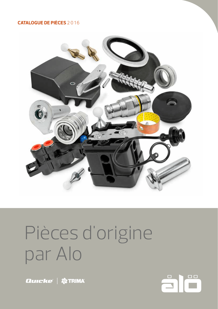 CATALOGUE DE PIÈCES 2 0 1 6 Pièces d'origine par Alo SUGGESTIONS ET CONSEILS Suggestions et conseils pratiques Comment trouver des pièces de rechange pour les produits Quicke ou Trima QUATRE GROUPES DE PRODUITS DEUX EMPLACEMENTS DIFFÉRENTS 1. Visualiseur de pièces de rechange Assert www.quicke.nu ou www.trima.nu 1. Vous trouverez des pièces de rechange pour les chargeurs dans le visualiseur de pièces de rechange « Assert ». Parcourez les dossiers des produits à gauche puis effectuez une recherche par modèle. Les cinq premiers chiffres du numéro de référence figurant sur la plaque constructeur sont requis (voir FAQ). 2. Instructions de montage 2. Vous trouverez des pièces de rechange pour les outils dans le visualiseur de pièces de rechange « Assert ». Parcourez les dossiers des produits à gauche puis effectuez une recherche par modèle. Vous pouvez également effectuer une recherche par numéro de référence, tel qu'il apparaît sur la plaque du chargeur. 3. Vous trouverez des pièces de rechange pour le système de commande dans les instructions de montage incluses dans le kit fourni aux concessionnaires ou dans les archives exploitées par Ålö et nos importateurs. Vous trouverez des pièces de joystick et de distributeur dans le visualiseur de pièces de rechange « Assert ». Parcourez les dossiers des produits à gauche puis effectuez une recherche par type de système de commande (voir FAQ). La plupart des joysticks et des distributeurs sont associés à un numéro de pièce figurant sur une étiquette. Saisissez le numéro de pièce dans le champ de recherche du visualiseur « Assert » (le numéro de pièce figure également dans les instructions de montage). Archives 4. Vous trouverez des pièces de rechange pour les bâtis dans les instructions de montage incluses dans le kit fourni aux concessionnaires ou dans les archives exploitées par Ålö et nos importateurs. Contactez Ålö ou votre importateur Quicke ou Trima pour obtenir de l'aide. 2 Imprimé FAQ Si je possède un chargeur Q46. Pourquoi le visualiseur Assert présente-t-il différents numéros comme 4613Q, 4614Q, etc. ? Le numéro à 4 chiffres (par ex., 4614Q) correspond aux premiers chiffres du numéro de commande du chargeur et fait office de numéro de référence. Ce numéro figure également sur la plaque constructeur du chargeur disposée sur le côté gauche du bras du chargeur. La différence correspond à la largeur du chargeur ainsi qu'au type de potence et de vérin. De quel système de commande suis-je équipé ? Distributeur mécanique fonctionnant à l'aide d'un câble de commande. Nous avons modifié le design au fil des années. Les plus connus sont l'Ergodrive « Blue top », l'Ergodrive « Grey top », l'Ergodrive « Black top » et l'Ergodrive « LCS ». La couleur renvoie au bouton supérieur du joystick. Distributeur électronique fonctionnant à l'aide de signaux électroniques. L'Electrodrive LCS et l'Easydrive LCS ont été lancés pour la première fois en 2010 : ils présentent un levier unique de type joystick à actionnement par le pouce. L'Easydrive présente toutefois moins d'options que l'Electrodrive. L'Electrodrive CDC était déjà utilisé sur les chargeurs Quicke et Trima Plus antérieurs à 2010. L'ELC était déjà utilisé sur les chargeurs Trima avant le lancement de la série Plus en 2005. Pourquoi existe-t-il autant de numéros de pièces différents pour le joystick ? Pour améliorer la traçabilité de notre kit hydraulique fourni avec le tracteur, nous affichons la partie supérieure du joystick, câble de commande compris. 1+1 signifie équipé d'interrupteurs pour la 3ème fonction et l'activation / désactivation du Softdrive 2+1 signifie équipé d'interrupteurs pour la 3ème et 4ème fonction et l'activation / désactivation du Softdrive Comment puis-je savoir de quel joystick Ergodrive je dispose ? Les boutons sont de différentes couleurs pour faciliter l'identification. Le « Blue top » présente un boîtier de joystick rectangulaire (65x55). Le « Grey top » présente un boîtier de joystick carré (65x65), un levier différent ainsi qu'un joint à rotule de 15 mm, au lieu de 14 mm sur le « Blue top ». Le « Black top » est semblable au « Grey top », seuls la couleur et l'autocollant diffèrent. Le « LCS » présente un boîtier de joystick carré (65x65) ainsi qu’une articulation à rotule (15 mm) contrairement au « Grey top » et au « Black top ». Pourquoi ne puis-je pas trouver toutes les informations sur les pièces de rechange pour le bâti et les kits hydrauliques dans le visualiseur Assert ? Vous trouverez les pièces de joystick et de distributeur dans Assert. Quant aux autres pièces, comme les pièces de flexible, de support et de bâti, elles figurent uniquement dans nos instructions de montage. Contactez Ålö ou votre importateur Quicke ou Trima pour obtenir de l'aide ! Pourrais-je trouver le numéro de pièce sur chacune des pièces ? Le numéro de pièce figure généralement sur la plupart des pièces. Exemples de joysticks Ergodrive, LCS Ergodrive, Black top Easydrive LCS Electrodrive LCS TABLE DES MATIÈRES SUGGESTIONS ET CONSEILS PRATIQUES FAQ 3 PIÈCES PRINCIPALES 4 Lames Silocut SG PIÈCES DE RECHANGE Pièces de joystick Câbles de commande Electrodrive CDC 5-18 5 6-8 Bagues d’usure 9 Axes et goupilles 9 Axes d'articulation du chargeur Axes d'articulation d'outil 9 10 Axes de verrouillage des outils sur le chargeur 11 Kits de maintenance 12 Jeu d'axes / goupilles et Bagues d’usure, séries Quicke Dimension et Trima Plus Jeux d'axes / goupilles et Bagues d’usure, séries Quicke 700 et 900 12 12 Kits de maintenance WEO : 12 Jeu de joints pour vérins 13 Coupleurs hydrauliques 14 Têtes de vérin 14 Kit de support 15 Protections en plastique 15 Vérin à gaz Accumulateurs 15 16 Peinture16 Dents 17 Lames du Silocut 18 Système de verrouillage des fourches palettes 18 Crochets 18 COMMANDE ET CONTACT 19 19 Inf