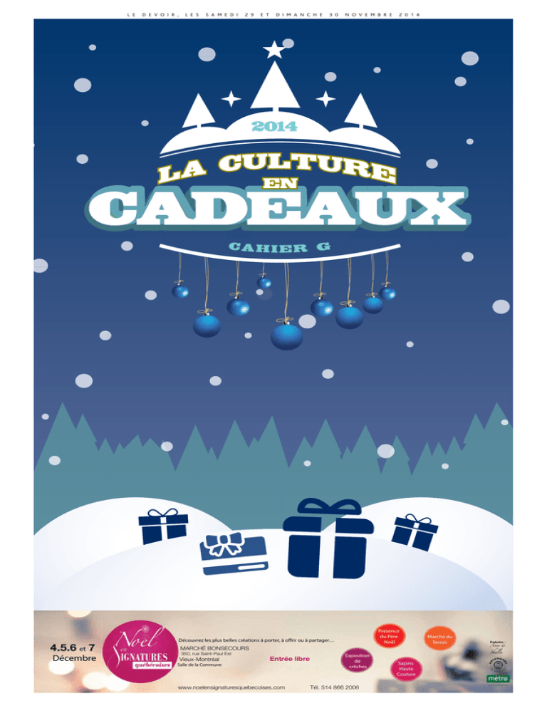 L E 4.5.6 et 7 Décembre D E V O I R , L E S S A M E D I 2 9 E T D I M A N C H E 3 0 N O V E M B R E Présence du Père Noël Découvrez les plus belles créations à porter, à offrir ou à partager… MARCHÉ BONSECOURS 350, rue Saint-Paul Est Vieux-Montréal Salle de la Commune Entrée libre www.noelensignaturesquebecoises.com 2 0 1 4 Exposition de crèches Tél. 514 866 2006 Sapins Haute Couture Marché du Terroir G2 L E D E V O I R , L E S S A M E D I 2 9 E T D I M A N C H E 3 0 N O V E M B R E MUSIQUE CLASSIQUE CRÉDIT JOHN HALL D élaissé depuis quelques années dans les programmes, Le Messie fait un retour dans le calendrier. Et plutôt trois fois qu’une… Comme d’habitude, le Festival Bach vient à point en cette période de l’année. La présence de Masaaki Suzuki à la tête de l’OSM, les 3, 4 et 7 décembre, coïncidera avec la présentation du Magnificat de Bach, créé à Leipzig le jour de Noël 1723. Le Festival Bach verra aussi la présentation de l’Oratorio de Noël, le 6 décembre à l’église Saint-Jean-Baptiste, par le Chœur Saint-Laurent sous la direction de Philippe Bourque. Les solistes seront Shannon Mercer, Claudine Ledoux, Nils Brown et Nathaniel Watson. Philippe Gagné incarnera l’Évangéliste. Les six cantates de l’Oratorio seront proposées en deux concerts : les trois premières à 15 h 30, les trois dernières à 19 h. Toujours dans le cadre du festival, Vincent Boucher sera à l’oratoire Saint-Joseph pour Noël à l’orgue, le dimanche 7 à 15h30. Grands rendez-vous C’est dans le cadre du Festival Bach que Les Violons du Roy et La Chapelle de Québec célébreront, le 5 décembre à 19 h 30, à la Maison symphonique de Montréal, Le Messie de Haendel. Miriam Allan, Allyson McHardy, Allan Clayton et Andrew Foster-Williams en seront les solistes, sous la direction d’un invité de marque, Trevor Pinnock. Les Violons afficheront leur Messie deux fois au Palais Montcalm à Québec: le 4 décembre à 20 h et le 7 décembre à 14 h. Le Messie de l’OSM sera présenté à la Maison symphonique de Montréal à deux reprises, les 9 et 10 décembre, sous la direction du chef de chœur Andrew Megill. La distribution entièrement canadienne regroupe Leslie Ann Bradley, Anita Krause, Pascal Charbonneau et Philippe Sly. Le samedi 13, Patrick Wedd organise un sing-along Messiah à la cathédrale Christ Church, et Boris Brott dirigera son interprétation au même endroit, le lundi 15 décembre, avec les solistes Aline Kutan, Julie Boulianne, Michael Colvin et Peter McGillivray. Au même moment, Kent Nagano arrivera pour son traditionnel concert de Noël de l’OSM. Fred Pellerin ne sera pas à l’affiche cette année. Il a dévoilé récemment à RadioCanada qu’il rempilera en 2015! On se réjouit déjà, et ce, d’autant plus que la vedette annoncée à Montréal en 2014, le ténor Vittorio Grigolo, a déclaré forfait. Grigolo sera remplacé, lors des concerts des 16 et 18 décembre, par la mezzo Susan Graham, associée au ténor Michael Fabiano. Notons que les concerts donnés par l’Orchestre métropolitain entre le 17 et le 20 décembre s’ouvrent par le concerto grosso La nuit de Noël de Corelli. C’est le seul lien avec les Fêtes, puisque le reste du programme est consacré à Tchaïkovski. Rafael Pichon et Les Violons du Roy, le 18 à Québec et le 19 à Montréal, feront suivre La nuit de Noël de Corelli par du Telemann et du Rameau. Quant aux Musici, ils se proposent carrément de «réinventer Noël», du 18 au 20 décembre, à la chapelle historique du Bon-Pasteur (et le 21 à Pointe-Claire). Abondance chorale Ce dimanche 30 novembre, à 14 h, dans le cadre de l’intégrale des cantates de Bach à la salle Bourgie, Luc Beauséjour dirigera le chœur et l’ensemble instrumental de Clavecin en concert dans des cantates autour de Noël : Nun komm, der Heiden Heiland, BWV 62; Was frag ich nach der Welt, BWV 94; Ich freue mich in dir, BWV 133. L’aventure se poursuivra les 13 et 14 décembre avec le Studio de musique ancienne, sous la direction de Christopher Jackson. Au programme: Christen, ätzet diesen Tag, BWV 63; Gloria in excelsis Deo, BWV 191; Preise, Jerusalem, den Herrn!, BWV 119. Pour revenir au dimanche 30 novembre, à l’église luthérienne St John, la cantate Nun komm, der Heiden Heiland, BWV 62 sera présentée aux côtés d’une cantate de Stölzel par John Oldengram et ses amis. On retrouve aussi à l’affiche des concerts de Noël de la Société chorale de Saint-Lambert, à SaintLambert, et de l’ensemble Quartom, à la chapelle historique du Bon-Pasteur. On retrouvera Quartom dans bien d’autres maisons de la culture à Montréal d’ici les Fêtes. À OFFRIR Et si vous désirez offrir des places de concert pour les Fêtes, voici notre traditionnelle sélection de cinq spectacles du premier semestre de 2015. - 24 janvier. Samson et Dalila avec Marie-Nicole Lemieux à l’Opéra de Montréal. - 8 mars. Récital Nareh Arghamanian pour Pro Musica à la Salle Bourgie. - 22 mars. Jean-Guihen Queyras au Ladies’ Morning Musical Club. - 29 mars. Yannick Nézet-Séguin dirige le Stabat Mater de Dvorak. - 19 mai. Zubin Mehta dirige la 3e Symphonie de Mahler à la Maison symphonique. Le retour du Messie ! C H R I S TO P H E H U S S 2 0 1 4 Le week-end prochain, le samedi 6 décembre, concert de l’ensemble Oasis musicale à 16h30, à Christ Church, et concert des Ste Anne Singers à 20 h, à l’Église Unie de Sainte-Anne-de-Bellevue. Ces derniers seront à Dorval le lendemain, à 15 h. Le jeudi 11 décembre à 11 h, à la salle Bourgie, Les idées heureuses présentent Noël en Nouvelle-France. Le même jour à 20 h, à PointeClaire, l’Ensemble Caprice propose Un Noël baroque autour du monde. Le Chœur de la montagne, dirigé par Julien Proulx, sera à Belœil les 12 et 14 décembre. Polymnie, dirigé par Louis Lavigueur, chante un Noël espagnol le 13 décembre à Boucherville. À la même date, Chante