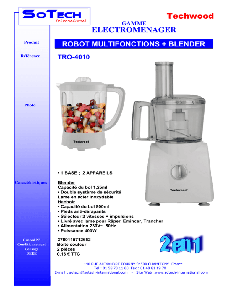GAMME Techwood ELECTROMENAGER Produit Référence ROBOT MULTIFONCTIONS + BLENDER TRO-4010 Photo • 1 BASE ; 2 APPAREILS Caractéristiques Gencod N° Conditionnement Colisage DEEE Blender Capacité du bol 1,25ml • Double système de sécurité Lame en acier Inoxydable Hachoir • Capacité du bol 800ml • Pieds anti-dérapants • Sélecteur 2 vitesses + impulsions • Livré avec lame pour Râper, Emincer, Trancher • Alimentation 230V~ 50Hz • Puissance 400W 3760115712652 Boite couleur 2 pièces 0,16 € TTC 140 RUE ALEXANDRE FOURNY 94500 CHAMPIGNY France Tel : 01 58 73 11 60 Fax : 01 48 81 19 70 E-mail : [email protected] - Site Web :www.sotech-international.com