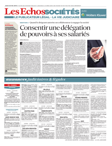 JEUDI 26 MAI 2016 // CAHIER DES ANNONCES LÉGALES ET JUDICIAIRES AU NUMÉRO 22199 | ISSN 01534831 NE PEUT PAS Ê TRE VENDU SÉPARÉMENT ANNLEGALWK 75 • PARIS SOCIETES 045195A – LES ECHOS ODEFI Société à Responsabilité limitée Au capital de 7.622,45 euros Siège social : 198 boulevard Pereire 75017 PARIS RCS PARIS 414 571 190 Aux termes du PV de l’Assemblée Générale extraordinaire du 6 mai 2016, il a été décidé de transférer le siège social du 198 boulevard Pereire 75017 PARIS au 62 avenue de la Grande Armée 75017 PARIS. Les statuts ont été modifiés en conséquence. Mention en sera faite au RCS de PARIS CONSTITUTIONS 045045B – LES ECHOS Aux termes d’un acte SSP en date du 17/05/2016 il a été constitué une SASU nommée : LUXURY DRIVER BY PARIS Objet social : Exploitation de véhicules de transport avec chauffeur (VTC) et location de véhicules avec et sans chauffeur Siège social : 93 rue Jeanne d’Arc , 75013 Paris Capital : 100 € Président : M. Hamza IDJOUBAR demeurant : 93 rue Jeanne d’Arc, 75013 Paris élu pour une durée indéterminée Durée : 99 ans à compter de son immatriculation au RCS de Paris. 045088B – LES ECHOS Aux termes d’un acte SSP en date du 24/05/2016 il a été constitué une SAS à capital variable nommée : F&CV Objet social : Le commerce de gros de produits alimentaires et de boissons en particuliers les alcools. Siège social : 21 bis rue Simplon, 75018 Paris Capital minimum : 1 €, en dessous duquel il ne peut être réduit Capital initial : 1000 € Président : M. Thomas Bousseau demeurant : 1 bis rue de Paradis, 75010 Paris élu pour une durée indéterminée DG Délégué : M. Martin Savaris demeurant : 4 rue du Château , 78600 Maison Laffitte DG Délégué : M. Thibault Turpin demeurant : 66 rue Pieplu, 78700 Conflans-Ste-honorine. Admission aux assemblées et exercice du droit de vote : Chaque actionnaire est convoqué aux Assemblées. Chaque action donne droit à une voix. Clause d’agrément : Les actions sont librement cessibles sous réserve du droit de préemption réservé aux associés. Si le droits préemption n’est pas utilisé la cession est soumise à l’agrément de l’AGE. Durée : 99 ans à compter de son immatriculation au RCS de Paris 045091B – LES ECHOS Aux termes d’un acte SSP en date du 20/05/2016 il a été constitué une SCI nommée : BELLEVILLE Objet social : ACQUISITION, LOCATION ET GESTION DES BIENS IMMOBILIERS. Siège social : 157 RUE DE BELLEVILLE, 75019 PARIS Capital : 100000 € Gérant : M. TAOUFIK BEN YAHIA, 12, RUE DES SORBIERS, 91240 SAINT MICHEL Cessions de parts sociales : les parts sociales sont librement cessibles au profit d’un Associé. Toute cession à un tiers de la société est soumise au préalable à agrément de la collectivité des Associés réunis en Assemblée Générale Durée : 99 ans à compter de son immatriculation au RCS de Paris. 045089B – LES ECHOS 045108B – LES ECHOS Aux termes d’un acte SSP en date du 19/05/2016 il a été constitué une SARL nommée : Aux termes d’un acte SSP en date du 02/05/2016 il a été constitué une SASU nommée : COCOTTES STUDIO Objet social : Architecte Siège social : 50 RUE GILBERT CESBRON, 75017 PARIS Capital : 4000 € Gérance : Mme Morgane CLAOUE, 19 rue Leroux, 75016 PARIS Cogérant : Mme Alexandra BOULLE-SEROR, 50 rue Gilbert Cesbron, 75017 PARIS Durée : 99 ans à compter de son immatriculation au RCS de Paris. 045090B – LES ECHOS Aux termes d’un acte SSP en date du 01/04/2016 il a été constitué une SAS nommée : CASA NUEVA RENOVATION Objet social : La rénovation, la vente et l’installation de cuisines, travaux Siège social : 17 rue Godefroy Cavaignac, 75011 PARIS Capital : 1000 € Président : M. Alexander GOMEZ PASICHANA demeurant : 31 rue de Bures, 78990 ELANCOURT élu pour une durée indéterminée Durée : 99 ans à compter de son immatriculation au RCS de Paris. Chaque action donne droit à une voix. Clauses d’agrément : Les actions sont librement cessibles entre actionnaires uniquement avec accord du Président de la société. Durée : 99 ans à compter de son immatriculation au RCS de Paris. 045140B – LES ECHOS Aux termes d’un acte authentique en date du 13/05/2016 il a été constitué une SASU nommée : ASSA CAR Objet social : Transport public routier de personnes directement ou indirectement, tant en France qu’à l’étranger au moyen de véhicules n’excédant pas 9 places, conducteur compris, transport de personnes à mobilité réduite, location de véhicule Siège social : 62 rue Bargue, 75015 PARIS Sigle : ASSA CAR Capital : 4500 € Président : M. Eugène ASSAA demeurant : 62 rue Bargue, 75015 PARIS élu pour une durée de 99 années Durée : 99 ans à compter de son immatriculation au RCS de Paris. CONNECTED SHIFTS Objet social : Vente d’analyse statistique de données issues d’objets connectés, d’algorithmes ou de prestations de conseils Siège social : 10 rue de Penthièvre, 75008 Paris Capital : 50.000 € Président : M. Nicolas, Jacques Moulin demeurant : 3 passage Charlot, 92320 Chatillon élu pour une durée indéterminée Durée : 99 ans à compter de son immatriculation au RCS de Paris. 045131B – LES ECHOS Aux termes d’un acte SSP en date du 09/05/2016 il a été constitué une SASU nommée : PARAUNY Objet social : Achat-vente de champagnes, vins et épicerie fine. Siège social : 33 rue Brezin, 75014 Paris Nom commercial : L’EXTRA BRUT Capital : 9000 € Président : M. Benoît MELENDEZ demeurant : 33 rue Brezin, 75014 Paris élu pour une durée indéterminée Admission aux assemblées et exercice du droit de vote : Chaque actionnaire est convoqué aux Assemblées. droit de vote, présents ou représentés. Clause de préemption : toute cession des actions de la société même entre associés est soumise au respect du droit de préemption conféré aux associés. Durée : 99 ans à compter de son immatriculation au RCS de Paris. 045192B 