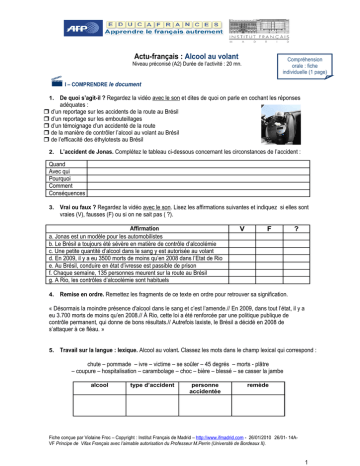 Actu-français : Alcool au volant Compréhension orale : fiche individuelle (1 page) Niveau préconisé (A2) Durée de l’activité : 20 mn. I – COMPRENDRE le document 1. De quoi s’agit-il ? Regardez la vidéo avec le son et dites de quoi on parle en cochant les réponses adéquates : d’un reportage sur les accidents de la route au Brésil d’un reportage sur les embouteillages d’un témoignage d’un accidenté de la route de la manière de contrôler l’alcool au volant au Brésil de l’efficacité des éthylotests au Brésil 2. L’accident de Jonas. Complétez le tableau ci-dessous concernant les circonstances de l’accident : Quand Avec qui Pourquoi Comment Conséquences 3. Vrai ou faux ? Regardez la vidéo avec le son. Lisez les affirmations suivantes et indiquez si elles sont vraies (V), fausses (F) ou si on ne sait pas ( ?). Affirmation a. Jonas est un modèle pour les automobilistes b. Le Brésil a toujours été sévère en matière de contrôle d’alcoolémie c. Une petite quantité d’alcool dans le sang y est autorisée au volant d. En 2009, il y a eu 3500 morts de moins qu’en 2008 dans l’Etat de Rio e. Au Brésil, conduire en état d’ivresse est passible de prison f. Chaque semaine, 135 personnes meurent sur la route au Brésil g. A Rio, les contrôles d’alcoolémie sont habituels V F ? 4. Remise en ordre. Remettez les fragments de ce texte en ordre pour retrouver sa signification. « Désormais la moindre présence d'alcool dans le sang et c’est l’amende.// En 2009, dans tout l’état, il y a eu 3.700 morts de moins qu’en 2008.// À Rio, cette loi a été renforcée par une politique publique de contrôle permanent, qui donne de bons résultats.// Autrefois laxiste, le Brésil a décidé en 2008 de s’attaquer à ce fléau. » 5. Travail sur la langue : lexique. Alcool au volant. Classez les mots dans le champ lexical qui correspond : chute – pommade – ivre – victime – se soûler – 45 degrés – morts - plâtre – coupure – hospitalisation – carambolage – choc – bière – blessé – se casser la jambe alcool type d’accident personne accidentée remède Fiche conçue par Violaine Froc – Copyright : Institut Français de Madrid – http://www.ifmadrid.com - 26/01/2010 26/01- 14AVF Principe de Vifax Français avec l’aimable autorisation du Professeur M.Perrin (Université de Bordeaux II). 1 Actu-français : Alcool au volant Niveau préconisé (A2) Durée de l’activité : 40 mn. Objectif : approfondir un point de langue. Prolongements pour la classe : langue II – UTILISER la langue 1. Utiliser les adjectifs possessifs Dans ces trois phrases, soulignez les adjectifs possessifs. « Le policier a perdu le contrôle de son véhicule.» “ Depuis, il est cloué dans sa chaise.” “ Quand je raconte mon histoire….” Les adjectifs possessifs : je tu il / elle / on nous vous ils / elles Singulier + nom + nom masculin féminin ou voyelle mon ma ton ta son sa notre votre leur Pluriel + nom pluriel mes tes ses nos vos leurs Source : http://www.polarfle.com/exercice/debadjposs.htm mon / ton / son amie ( mon / ton / son + mot féminin singulier commençant par voyelle) mon / ton / son histoire ( mon / ton / son + mot féminin singulier commençant par h) 2. A vous. Complétez ces phrases avec un adjectif possessif. a. b. c. d. Il m’a prêté ………voiture, ……….appartement,…………………arme. Chaque conducteur est responsable de………………….papiers. Tous les conducteurs sont responsables de…………….papiers. Je ne connais pas ………………adresse. e. Monsieur, donnez-moi …………………..veste. Fiche conçue par Violaine Froc – Copyright : Institut Français de Madrid – http://www.ifmadrid.com - 26/01/2010 26/01- 14AVF Principe de Vifax Français avec l’aimable autorisation du Professeur M.Perrin (Université de Bordeaux II). 2 Actu-français : Alcool au volant Niveau préconisé (A2) Durée de l’activité : 40 mn. Objectif : approfondir le thème traité Prolongements pour la classe : culture, civilisation III – ALLER PLUS LOIN sur le thème Mini-dossier sur l’alcool au volant 1. Infographie http://tinyurl.com/yejd486 2. L’éthylotest 3. article : « Nouvel An : boire ou conduire, les Français n’ont pas tout à fait choisi » http://tinyurl.com/y8p98ht 4. article : « Des éthylotests anti-démarrage imposés aux conducteurs en état d’ivresse » http://tinyurl.com/yatxmmd A partir des documents suivants, répondez aux questions : a. En quoi consiste le système de l’éthylotest ? b. Quelles sont les principales mesures du plan anti-alcool au volant prises par le Ministère de l’Intérieur ? c. Après la fête de la Saint Sylvestre, comment les Français gèrent-ils la question de l’alcool et de la conduite ? d. Quelle est la décision prise par les bénévoles de l’association Prévention Routière pour enrayer le problème ? e. A qui s’adresse la prochaine loi de sécurité intérieure présentée par Mme. Alliot Marie ? f. Pourquoi a-t-elle été mise en place ? Fiche conçue par Violaine Froc – Copyright : Institut Français de Madrid – http://www.ifmadrid.com - 26/01/2010 26/01- 14AVF Principe de Vifax Français avec l’aimable autorisation du Professeur M.Perrin (Université de Bordeaux II). 3 Actu-français : Alcool au volant Niveau préconisé (A2) Durée de l’activité : 40 mn. Objectifs : écrire, dire, communiquer, réaliser une tâche en français Prolongements pour la classe : production, projet IV – AGIR avec la langue Dialogue entre amis après une fête bien arrosée. Vous êtes invités à l’anniversaire d’un(e) ami (e). Vous savez qu’il va y a avoir de l’alcool et vous avez bien envie de boire. A la fin de la soirée, des solutions et des conseils vous sont donnés par vos amis pour vous éviter de prendre le volant. Inventez le dialogue. Utilisez les expressions propres au conseil et à l’interdiction : Tu devrai