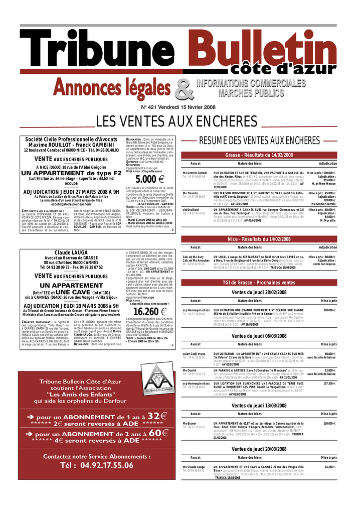 N° 421 Vendredi 15 février 2008 LES VENTES AUX ENCHERES Société Civile Professionnelle d’Avocats Maxime ROUILLOT - Franck GAMBINI 12 boulevard Carabacel 06000 NICE - Tél. 04.93.80.48.03 -------------------- VENTE AUX ENCHERES PUBLIQUES -------------------- A NICE (06000) 18 rue de l’Abbé Grégoire UN APPARTEMENT de type F2 DÉSIGNATION : Dans un immeuble sis à Nice (06), 18 rue de l’Abbé Grégoire, cadastré section LT n° 303 pour 2a 76ca: un appartement de deux pièces (lot 9) sis au 3ème étage de l’immeuble, comprenant : une entrée, une chambre, une cuisine, un WC, un séjour et balcon. SUPERFICIE : Loi Carrez 43,60 m2. OCCUPATION : L’appartement est occupé. MISE À PRIX : Cinq mille euros 5.000 a (Lot 9) situé au 3ème étage - superficie : 43,60 m2 occupé -------------------- ADJUDICATION JEUDI 27 MARS 2008 À 9H Au Palais de Justice de Nice, Place du Palais à Nice Le ministère d’un avocat au Barreau de Nice est obligatoire pour enchérir ------------------- CETTE VENTE A LIEU À LA REQUÊTE DE : La CAISSE D’ÉPARGNE ET DE PRÉVOYANCE COTE D’AZUR, Banque coopérative régie par la loi n° 99-532 du 25 juin 1999, au capital de 122.291.900 a, Société Anonyme à directoire et conseil d’orientation et de surveillance, dont le siège social est à NICE (06200), L’Arénas, 455 Promenade des Anglais, immatriculée au Registre du Commerce et des Sociétés de NICE sous le n° D 384.402.871 - Ayant pour Avocat la SCP ROUILLOT - GAMBINI, du Barreau de Nice. Les clauses et conditions de la vente sont stipulées dans le cahier des conditions de la vente déposé au Greffe du Juge de l’Exécution Immobilier du TGI de Nice le 17 septembre 2007. LA SCP ROUILLOT - GAMBINI VISITES sur place sous la conduite de : la SCP CELLIER-LEROY - LIBOUBANVALIERGUE, Huissiers de Justice à Nice : - Mardi 11 mars 2008 de 10h à 11h - Mardi 18 mars 2008 de 14h30 à 15h30 Il est inutile de prendre rendez-vous. -2 RESUME DES VENTES AUX ENCHERES Grasse - Résultats du 14/02/2008 Avocat Nature des biens Adjudication Me Granier Zarrabi Tél : 04.93.36.65.93 SUR LICITATION ET SUR REITERATION, UNE PROPRIETE A GRASSE 161 che des Hautes Ribes de 9.801 M2, comprenant une villa sur deux niveaux une piscine et pool house - poursuivant Mme Mer - cahier des charges déposé le 10/04/07 - visites 05/02/08 de 14h à 15h et 08/02/08 de 11h à 12h - AV 12/01/2008 Mise à prix : 500.000 € Adjudication : 855.000 € M. et Mme Morvan Me Traxelle Tél : 04.97.06.68.80 UNE MAISON INDIVIDUELLE A ST LAURENT DU VAR Lieudit Ste Pétronille et 677 che du Dégoutai 107,06 m2, occupé - pousuivant Me Arnaud - cahier des charges déposé le 09/11/04 - visites 04/02/08 de 11h à 12h et 08/02/08 de 14h à 15h - AV 12/01/2008 Mise à prix : 45.000 € Adjudication : 178.000 € Me Granier Zarrabi cbt Draillard Tél : 04.97.06.68.02 UN APPARTEMENT A CANNES 91/93 rue Georges Clemenceau et 1/5 rue du Riou "les Félibriges" au 2ème étage 1PP libre - poursuivant BNP Paribas - cahier des charges déposé le 08/06/07 - visites 04/02/08 de 14h à 15h et 11/02/08 de 11h à 12h - AV 05/01/2008 Mise à prix : 60.000 € Adjudication : 64.000 € M. Mocellin Nice - Résultats du 14/02/2008 Avocat Claude LAUGA Avocat au Barreau de GRASSE 80 rue d’Antibes 06400 CANNES Tél 04 93 38 09 72 - Fax 04 93 38 07 52 -------------------- VENTE AUX ENCHERES PUBLIQUES -------------------- UN APPARTEMENT (lot n°131) et UNE CAVE (lot n°101) sis à CANNES (06400) 26 rue des Vosges «Villa Bijou» -------------------- à CANNES(06400) 26 rue des Vosges, comprenant un bâtiment de trois étages sur rez de chaussée, petite construction et terrain attenant, cadastrée section AX N°278. - Le lot n° 101 : UNE CAVE et les 3/1.000è - Le lot n° 131 : UN APPARTEMENT et les 42/1.000è. L’appartement est situé au 3è étage, composé d’un Hall d’entrée avec placard, cuisine, séjour avec placard, dégagement donnant accès à une chambre avec placard et une salle de bains. Surface : 48,39 m². Appartement inoccupé. MISE À PRIX : Seize mille deux cent soixante a ADJUDICATION JEUDI 20 MARS 2008 à 9H 16.260 a Au Tribunal de Grande Instance de Grasse - 37 avenue Pierre Sémard Ministère d’un Avocat au Barreau de Grasse obligatoire pour enchérir -------------------- CRÉANCIER : le Syndicat des copropriétaires “Villa Bijou” sis à CANNES (06400) 26 rue des Vosges, représenté par son Syndic en exercice, FONCIA AZUR, société par actions simplifiée au capital de 50.000a, immatriculée au RCS CANNES B 696.120.187, dont le siège social est 7 rue des Belges à POURSUIVANT CANNES (06400), agissant elle-même en la personne de son Président Directeur Général en exercice domicilié audit siège, ayant pour Avocat Maître Claude LAUGA, du Barreau de Grasse, demeurant et domicilié à CANNES (06400) 80 rue d’Antibes. DÉSIGNATION : dans une propriété sise Consignation obligatoire pour enchérir. Consultation du cahier des conditions de vente au Greffe du Juge de l’Exécution du Tribunal de Grande Instance de GRASSE où il a été déposé le 26.09.2007 sous le N°07/00116. VISITE : - 14 mars 2008 de 14h à 15h - 17 mars 2008 de 11h à 12h -1 Tribune Bulletin Côte d'Azur soutient l'Association "Les Amis des Enfants" qui aide les orphelins du Darfour pour un ABONNEMENT de 1 an à UN LOCAL à usage de RESTAURANT de 88,47 m2 et deux CAVES en ss, à Nice, 5 rue de Belgique et 4 rue de La Belle Otéro biens libres - poursuivant: Georges Gérard Santin - cahier des charges déposé le 26/07/2006 - visites : 29/01/08 de 10h à 12h et 06/02/08 de 14h à 16h - TRIBUCA 18/01/2008 Adjudication Mise à prix : 80.000 € Adjudication : vente non requise TGI de Grasse - Prochaines ventes Ventes du jeudi 28/02/2008 Avocat scp Hannequin et ass Tél : 04.93.34.88.40 Nature des biens SUR LICITATION UNE GRANDE PROPRIETE A ST CEZAIRE SUR SIAGNE 953 rte de St Vallier lieudit le Pré de la Combe Villa de 8PP sur 2 niveaux, piscine avec p