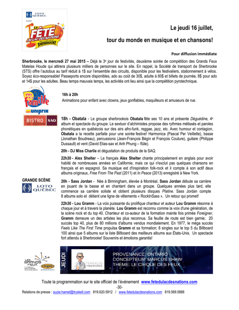 Le jeudi 16 juillet, tour du monde en musique et en chansons! Pour diffusion immédiate Sherbrooke, le mercredi 27 mai 2015 – Déjà le 3e jour de festivités, deuxième soirée de compétition des Grands Feux Matelas Houde qui attirera plusieurs milliers de personnes sur le site. En rappel, la Société de transport de Sherbrooke (STS) offre l’autobus au tarif réduit à 1$ sur l’ensemble des circuits, disponible pour les festivaliers, stationnement à vélos. Soyez éco-responsable! Passeports encore disponibles, ado au coût de 30$, adulte à 60$ et billets de journée, 8$ pour ado et 14$ pour les adultes. Beau temps mauvais temps, les activités ont lieu ainsi que la compétition pyrotechnique. 16h à 20h Animations pour enfant avec clowns, jeux gonflables, maquilleurs et amuseurs de rue. 18h - Obatala - Le groupe sherbrookois Obatala fête ses 10 ans et présente Déguédine, 4e album et spectacle du groupe. Le sextuor d’alchimistes propose des rythmes métissés et paroles phonétiques en québécois sur des airs afro-funk, reggae, jazz, etc. Avec humour et contagion, Obatala a la recette parfaite pour une soirée festive! Harmonica (Pascal Per Veillette), basse (Jonathan Boudreau), percussions (Jean-François Bégin et François Couture), guitare (Philippe Dussault) et vent (David Elias-sax et Anh Phung – flûte). 20h - DJ Miss Charlie et dégustation de produits de la SAQ. 22h30 - Alex Shelter – Le français Alex Shelter chante principalement en anglais pour avoir habité de nombreuses années en Californie, mais ce qui n'exclut pas quelques chansons en français et en espagnol. Sa musique est d'inspiration folk-rock et il compte à son actif deux albums originaux, Free From The Past (2011) et In Peace (2013) enregistré à New York. GRANDE SCÈNE 20h - Sass Jordan - Née à Birmingham, élevée à Montréal, Sass Jordan débute sa carrière en jouant de la basse et en chantant dans un groupe. Quelques années plus tard, elle commence sa carrière soliste et obtient plusieurs disques Platine. Sass Jordan compte 8 albums solo et détient une ligne de vêtements « RockInSass ». Un retour qui promet! 22h30 - Lou Gramm - La voix puissante du prolifique chanteur et auteur Lou Gramm résonne à chaque jour et à travers la planète. Lou Gramm est reconnu comme la voix d'une génération, de la scène rock et du top 40. Chanteur et co-auteur de la formation mainte fois primée Foreigner, Gramm demeure un des artistes les plus reconnus. Sa feuille de route est bien garnie; 20 succès top 40, plus de 80 millions d'albums vendus mondialement. En 1977, le méga succès Feels Like The First Time propulsa Gramm et sa formation; 8 singles sur le top 5 du Billboard 100 ainsi que 5 albums sur la liste Billboard des meilleurs albums aux États-Unis. Un spectacle fort attendu à Sherbrooke! Souvenirs et émotions garantis! Toute la programmation sur le site officiel de l’événement www.fetedulacdesnations.com ‐30‐ Relations de presse : [email protected] 819.620.5912 / www.fetedulacdesnations.com 819.569.5888