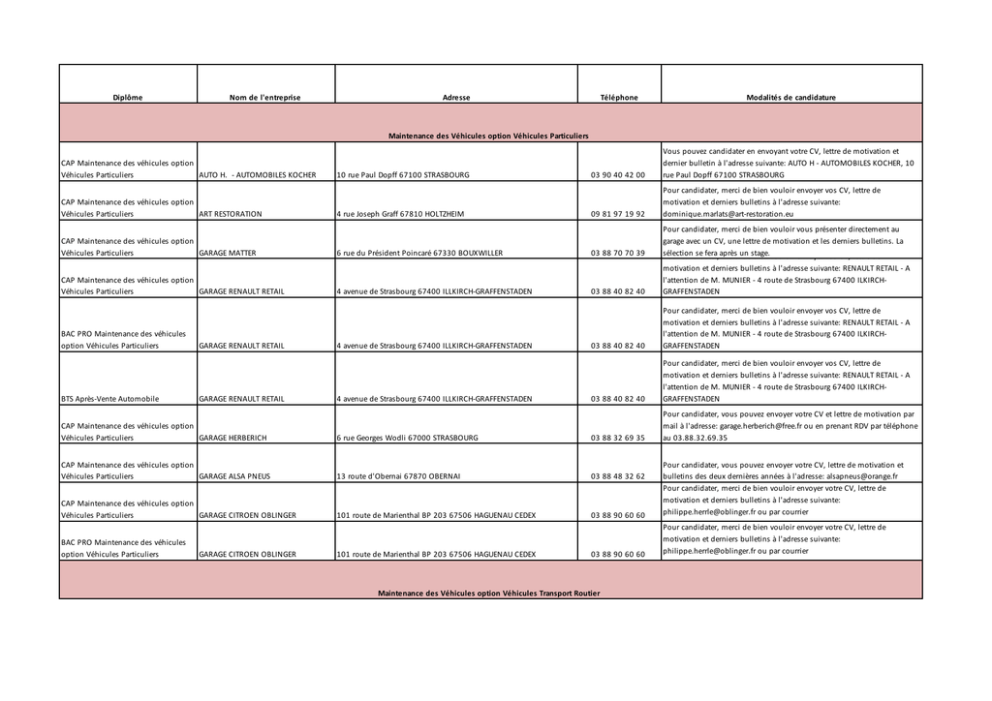 Diplôme Nom de l'entreprise Adresse Téléphone Modalités de candidature Maintenance des Véhicules option Véhicules Particuliers CAP Maintenance des véhicules option Véhicules Particuliers AUTO H. - AUTOMOBILES KOCHER CAP Maintenance des véhicules option Véhicules Particuliers ART RESTORATION CAP Maintenance des véhicules option Véhicules Particuliers GARAGE MATTER CAP Maintenance des véhicules option Véhicules Particuliers GARAGE RENAULT RETAIL BAC PRO Maintenance des véhicules option Véhicules Particuliers BTS Après-Vente Automobile GARAGE RENAULT RETAIL GARAGE RENAULT RETAIL 10 rue Paul Dopff 67100 STRASBOURG 4 rue Joseph Graff 67810 HOLTZHEIM 6 rue du Président Poincaré 67330 BOUXWILLER 4 avenue de Strasbourg 67400 ILLKIRCH-GRAFFENSTADEN 4 avenue de Strasbourg 67400 ILLKIRCH-GRAFFENSTADEN 4 avenue de Strasbourg 67400 ILLKIRCH-GRAFFENSTADEN 03 90 40 42 00 Vous pouvez candidater en envoyant votre CV, lettre de motivation et dernier bulletin à l'adresse suivante: AUTO H - AUTOMOBILES KOCHER, 10 rue Paul Dopff 67100 STRASBOURG 09 81 97 19 92 Pour candidater, merci de bien vouloir envoyer vos CV, lettre de motivation et derniers bulletins à l'adresse suivante: [email protected] 03 88 70 70 39 Pour candidater, merci de bien vouloir vous présenter directement au garage avec un CV, une lettre de motivation et les derniers bulletins. La sélection se fera après Pour candidater, merciun destage. bien vouloir envoyer vos CV, lettre de 03 88 40 82 40 motivation et derniers bulletins à l'adresse suivante: RENAULT RETAIL - A l'attention de M. MUNIER - 4 route de Strasbourg 67400 ILKIRCHGRAFFENSTADEN 03 88 40 82 40 Pour candidater, merci de bien vouloir envoyer vos CV, lettre de motivation et derniers bulletins à l'adresse suivante: RENAULT RETAIL - A l'attention de M. MUNIER - 4 route de Strasbourg 67400 ILKIRCHGRAFFENSTADEN 03 88 40 82 40 Pour candidater, merci de bien vouloir envoyer vos CV, lettre de motivation et derniers bulletins à l'adresse suivante: RENAULT RETAIL - A l'attention de M. MUNIER - 4 route de Strasbourg 67400 ILKIRCHGRAFFENSTADEN Pour candidater, vous pouvez envoyer votre CV et lettre de motivation par mail à l'adresse: [email protected] ou en prenant RDV par téléphone au 03.88.32.69.35 CAP Maintenance des véhicules option Véhicules Particuliers GARAGE HERBERICH 6 rue Georges Wodli 67000 STRASBOURG 03 88 32 69 35 CAP Maintenance des véhicules option Véhicules Particuliers GARAGE ALSA PNEUS 13 route d'Obernai 67870 OBERNAI 03 88 48 32 62 CAP Maintenance des véhicules option Véhicules Particuliers GARAGE CITROEN OBLINGER 101 route de Marienthal BP 203 67506 HAGUENAU CEDEX 03 88 90 60 60 BAC PRO Maintenance des véhicules option Véhicules Particuliers 101 route de Marienthal BP 203 67506 HAGUENAU CEDEX 03 88 90 60 60 GARAGE CITROEN OBLINGER Maintenance des Véhicules option Véhicules Transport Routier Pour candidater, vous pouvez envoyer votre CV, lettre de motivation et bulletins des deux dernières années à l'adresse: [email protected] Pour candidater, merci de bien vouloir envoyer votre CV, lettre de motivation et derniers bulletins à l'adresse suivante: [email protected] ou par courrier CITROEN OBLINGER Pour candidater, merci de bien vouloir envoyer votre CV, lettre de motivation et derniers bulletins à l'adresse suivante: [email protected] ou par courrier CITROEN OBLINGER CAP Maintenance des Véhicules option Véhicules Transport Routier RENAULT TRUCKS STRASBOURG RD 1083 ZI 67640 FEGERSHEIM 03 90 29 89 00 Pour candidater, merci de bien vouloir envoyer votre CV, lettre de motivation et derniers bulletins à : [email protected] Bac pro Maintenance des Véhicules option Véhicules Transport Routier RENAULT TRUCKS STRASBOURG RD 1083 ZI 67640 FEGERSHEIM 03 90 29 89 00 Pour candidater, merci de bien vouloir envoyer votre CV, lettre de motivation et derniers bulletins à : [email protected] CAP Maintenance des véhicules option Véhicules de Transport Routier LEFEVRE ALSACE 1 avenue de l'Europe 67720 HOERDT 03 90 29 03 33 Pour candidater, merci de bien vouloir envoyer votre CV, lettre de motivation et derniers bulletins à : [email protected] Bac pro Maintenance des Véhicules option Véhicules Transport Routier 1 avenue de l'Europe 67720 HOERDT 03 90 29 03 33 Pour candidater, merci de bien vouloir envoyer votre CV, lettre de motivation et derniers bulletins à : [email protected] CAP Maintenance des véhicules option Véhicules de Transport Routier GARAGE BILLIAR VI 36 route de Strasbourg 57402 SARREBOURG CEDEX 03 87 23 22 31 Se présenter directement auprès de M. HASSE Bac Pro Maintenance des véhicules option Véhicules de Transport Routier GARAGE BILLIAR VI 36 route de Strasbourg 57402 SARREBOURG CEDEX 03 87 23 22 31 Se présenter directement auprès de M. HASSE Bac Pro Maintenance des véhicules option Véhicules de Transport Routier IVECO EST 10 rue des tuileries 67460 SOUFFELWEYERSHEIM 03 88 20 96 20 Pour candidater, merci de bien vouloir envoyer vos CV, lettre de motivation et derniers bulletins à l'adresse suivante: [email protected] BTS AVA option VTR 10 rue des tuileries 67460 SOUFFELWEYERSHEIM 03 88 20 96 20 Pour candidater, merci de bien vouloir envoyer vos CV, lettre de motivation et derniers bulletins à l'adresse suivante: [email protected] 03 87 34 31 74 Pour candidater, merci de bien vouloir envoyer vos CV, lettre de motivation et derniers bulletins à l'adresse suivante avec la référence " BAC PRO VTR Sarrebourg": [email protected] 03.68.00.15.77 Pour candidater, merci de bien vouloir envoyer votre CV, lettre de motivation et derniers bulletins à Mme ROLLIN à l'adresse :[email protected] 03.68.00.15.77 Pour candidater, merci de bien vouloir envoyer votre CV, lettre de motivation et derniers bulletins à Mme ROLLIN à l'adresse :[email protected] 03 90 40 42 00 Vous pouvez candidater en envoyant votre CV, lettre de motivation et dernier bulletin à l'adresse suivante: AUTO H - AUTOMOBILES KOCHER, 10 rue Paul Dopff 67100