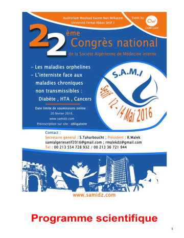 Programme scientifique 1 Mot du président Nous voici donc à notre 22ème congrès national. C’est bien évidemment, et comme à chaque fois, une joie de vous retrouver dans cette assemblée, mais cette année revêt un caractère particulier puisque conformément au nouveau statut de la SAMI, notre mandat arrive malheureusement à échéance. Les membres du bureau et moi-même espérons avoir accompli notre tâche. Nous sommes heureux et honorés d’avoir contribué à cette entreprise scientifique de médecine interne dont l’œuvre a débuté en 1993. Depuis 13 ans, nous avons mis en avant et débattu ensemble de sujets d’actualité auxquels les internistes sont confrontés au quotidien, et cette année encore les thèmes sélectionnés seront à la hauteur des défis auxquels la médecine interne doit faire face. 2 thèmes ont été plébiscité par l’ensemble de la communauté scientifique et non les des moindres. L’interniste face aux maladies chroniques non transmissibles (MCNT), un thème d’actualité, de santé publique et de recherche. L’interniste est au carrefour de ces pathologies émergentes. Il est à juste titre confronté régulièrement en amont et en aval de ces pathologies, souvent lourdes et dont la prise en charge reste complexe non seulement pour le patient et l’interniste mais aussi pour les familles. Nous allons essayer de nous situer par rapport à la pratique des uns et des autres, surtout qu’un plan national est lancé pour le traitement du cancer et bientôt, sans aucun doute, pour le diabète. Les maladies rares sont une seconde préoccupation des internistes et dans ce domaine je tiens à remercier chaleureusement le professeur Philippe Morlat, président de la SNFMI pour sa très grande implication dans ce thème et le choix des conférenciers Français. L’essentiel sera débattu avec un échange d’expériences au niveau nationales puisque plusieurs équipes sont impliquées. La soumission d’abstracts a été comme d’habitude plus que satisfaisante tant sur le nombre que sur la diversification des sujets. Les comités scientifique et de lecture ont œuvré pour que le programme soit riche et d’un haut niveau, en se basant sur les règles universelles. Le bureau a veillé également à rendre la tâche plus aisée aux différents intervenants à travers le site web de la SAMI. Le programme scientifique sera dispensé sous forme de conférences plénières, communications thématiques, ainsi que des communications, libres, affichées et commentées. Tous les posters pourront être visionnés sur place sur « e-poster ». Le bureau a adopté une approche interactive en prenant en compte les demandes de ces adhérents, qui, je dois l’avouer, est en constante évolution. Cette demande sans cesse renouvelée est non seulement le signe d’une déontologie sans faille mais également une projection dans l’avenir. C’est pourquoi, nous avons augmenté le nombre de workshop à 9 cette année. Des symposiums sont également prévus sur le diabète et la polyarthrite rhumatoïde. Je tiens à remercier vivement le comité de lecture pour tous les efforts consentis et les conférenciers nationaux et Français. Merci à tous les membres du bureau de la SAMI pour m’avoir accompagné dans cette aventure si riche, et je suis convaincu qu’un grand nombre d’entre eux restera dans le prochain bureau pour que l’esprit de cette aventure scientifique et humaine perdure. En dehors des 3 congrès nationaux organisés (Alger, Tlemcen et Sétif), des FMC ont été réalisées dans certaines villes et aussi en association avec les sociétés savantes dont la société algérienne de psychiatrie. Une autre collaboration avec la SNFMI qui a permis à nos résidents d’assister le 25 mars 2016 à Alger à la première session de DES médecine interne sous forme de vise conférence coordonnée par le Pr Luc Mouthon. 2 Merci à tous les adhérents de la SAMI pour la confiance qu’ils nous portent. Grace au travail du bureau le nombre a nettement augmenté ces 3 dernières années, ce qui témoigne de son caractère fédérateur et attractif. Nous aurons l’occasion d’en débattre au cours de l’assemblée générale prévu le vendredi 13 à 17H45 au cours de laquelle nous présenterons à nos adhérents le bilan moral et financier. Des élections prévues seront organisées pour le nouveau bureau et le futur président de la SAMI en 2018. Merci à l’industrie pharmaceutique pour son soutien indéfectible à la tenue du congrès et dans de très bonnes conditions. Si certains désagréments dus aux travaux du tramway sont inévitables, j’ose espérer que d’autres attractions vous les feront vite oublier. La ville de Sétif et toute sa communauté scientifique vous souhaitent la bienvenue à Sétif et un bon congrès. Le président. Comité d’organisation Président du comité d’organisation: R MALEK Membres : TAHARBOUCHT S, A TEBAIBIA, MAKHLOUF L, LAHCENE M, LARBI BOUAMRANE A, BOUALI F, YAHIA BERROUIGUET A, BOUDJLIDA A, TALEB A, TAHARBOUCHET B, SALAH MANSOUR A. Local : Dr F REZIG, CHERMAT R, KHETTABI S, MEKIDECHE FZ, NECHADI A, H KHELLAF, F TONTO, KARA MOHAMED D. Comité scientifique: Président: M BROURI Membres : ARRADA M, BENFENATKI N, BERRAH A, BIAD A, BOUALI F, BOUCELMA M, BROURI M, CHAHI M, CHAMI A, CHELGHOUM A, CHERRAK A, GUETTARI C, HANNACHE K, LAHCENE M, LOUNICI A, LOUNIS D, MALEK R, OUADAHI N, OUERDANE S, REMACHE A, ROUABHIA S, A TEBAIBIA, ROULA D, SADOUKI . Comité de lecture: ALI GUECHI S, AYAD F, BENFENATKI N, BERRAH A, BOUCELMA M, BROURI M, R CHERMAT R, CHIBANE A, GUERMAZ R, HAKEM DJ, HATRI A, KITOUNI Y, LAHCENE M, LOUNICI A, MAKHLOUF L, OTMANI F, OUADAHI N, OUMNIA N, ROUABHIA S, TAHARBOUCHET B, TAHARBOUCHT S, TEBAIBIA A, ZAAMOUCHE A, ZEKRI S. 3 Historique de la Société Algérienne de Médecine Interne (SAMI) 1994- 2016. Membres fondateurs : Antar Mostepha, Assam Djamila, Ayoub Soraya, Bacha Hayet, Belhadj Mouloud, B