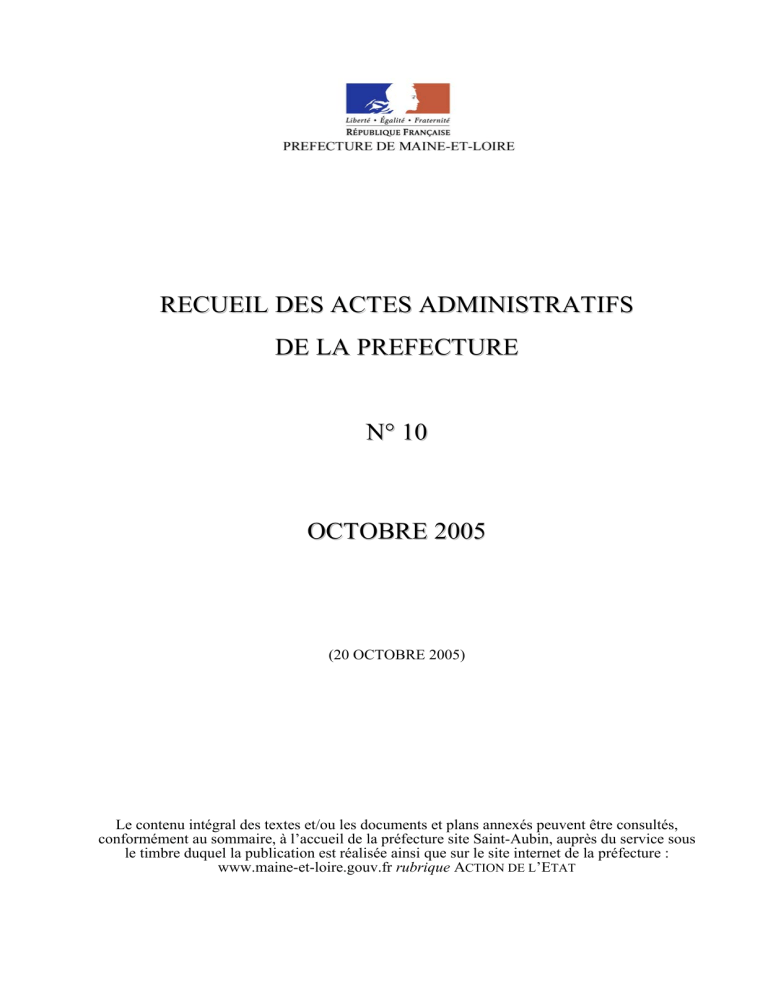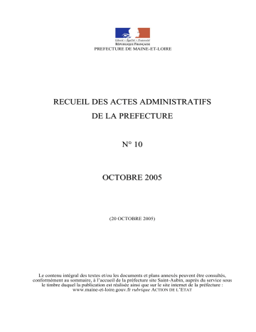RECUEIL DES ACTES ADMINISTRATIFS DE LA PREFECTURE N° 10 OCTOBRE 2005 (20 OCTOBRE 2005) Le contenu intégral des textes et/ou les documents et plans annexés peuvent être consultés, conformément au sommaire, à l’accueil de la préfecture site Saint-Aubin, auprès du service sous le timbre duquel la publication est réalisée ainsi que sur le site internet de la préfecture : www.maine-et-loire.gouv.fr rubrique ACTION DE L’ETAT SOMMAIRE 1 I - INFORMATIONS DEPARTEMENTALES PREFECTURE DE MAINE-ET-LOIRE - CABINET Distinctions honorifiques - Ordre du mérite agricole - Promotion du 14 juillet 2005........................................................... - Médaille du tourisme - Promotion du 14 juillet 2005................................................................ 8 10 II - ARRETES PREFECTURE DE MAINE-ET-LOIRE - CABINET Médaille d’Honneur régionale, départementale et communale - Promotion du 14 juillet 2005 ..................................................................................................... Médaille d’honneur du travail - Promotion du 14 juillet 2005 ..................................................................................................... 12 SECRETARIAT GENERAL - BUREAU DE LA COORDINATION ET DU COURRIER Délégation de signature - Modificatif n° 1 - Mme Anne LE QUERE, chef du bureau du cabinet.................................................................. - M. Jean-Louis PLE, directeur départemental de la jeunesse et des sports ................................ - M. Stéphane CASSEREAU, ingénieur des mines, directeur régional de l’industrie, de la recherche et de l’environnement des Pays de la Loire ................................................................. 147 148 DIRECTION DE LA REGLEMENTATION Bureau de la circulation - Agrément d’un établissement d’enseignement à la préparation du certificat de capacité professionnelle de conducteur de taxi .......................................................................................... - Certificat de capacité professionnelle de conducteur de taxi - session 2006 ............................. - Nomination des examinateurs aux épreuves « 2 roues » et « groupe lourd »............................ - Composition du jury appelé à se prononcer sur les épreuves des mentions "deux roues" et "groupe lourd" - Modificatif n° 1................................................................................................ Retrait d'une autorisation d'enseigner, à titre onéreux, la conduite des véhicules à moteur et la sécurité routière : - délivrée à M. COURJAULT ...................................................................................................... - délivrée à M. ARNOU ............................................................................................................... Bureau des élections, de la vie associative et de la réglementation générale - Abrogation d’autorisation de fonctionnement d’un service interne de sécurité ........................ DIRECTION DE L’ANIMATION DES POLITIQUES INTERMINISTERIELLES Bureau de l'économie et de l’emploi CDEC - Délégation à M. Jean-Jacques CARON - pour la commission du 28 septembre 2005................................................................................ - pour la commission du 20 octobre 2005 .................................................................................... 31 149 151 152 154 156 157 158 159 160 161 DIRECTION DES COLLECTIVITES LOCALES ET DE L’ENVIRONNEMENT Affaires foncières et de l’urbanisme - Commune de BOUZILLE - Réhabilitation du système d’assainissement et construction d’une nouvelle station d’épuration - Autorisation.................................................................................. 162 - Déclaration d’utilité publique emportant mise en compatibilité du plan d’occupation des sols de la commune de LOIRE............................................................................................................ 167 - Commune de La POSSONNIERE - construction d’une station d’épuration - autorisation ...... 169 - Commune de MONTREUIL-SUR-MAINE - construction d’une station d’épuration autorisation ................................................................................................................................... 179 - Commune de SAINT-AUBIN-DE-LUIGNE Station d'épuration pour les effluents viticoles Autorisation provisoire (prolongation) - Modificatif ................................................................... 183 - Syndicat intercommununal pour l’aménagement du COUASNON .......................................... 184 2 - Déclaration d’utilité publique de l’urbanisation du secteur Reux-Cordelles sur la commune de SAINT BARTHELEMY D’ANJOU....................................................................................... 186 Gaz de France réseau de transport LONGUE-JUMELLES/BEAUFORT EN VALLEE - Autorisation................................................................................................................................ 188 - Déclaration d’utilité publique .................................................................................................... 190 - Déclaration d’utilité publique de l’extension de la zone d’activités La Biode sur la commune de SAINT CRESPIN SUR MOINE ............................................................................................. 191 - Déclaration d’utilité publique de l’extension de la zone d’activités du Petit Lapin sur la commune de SAINT GERMAIN SUR MOINE .......................................................................... 193 Environnement et protection des espaces - Schéma d'aménagement et de gestion des eaux du bassin versant de l’Authion Commission locale de l’eau - Création ........................................................................................ 195 Associa