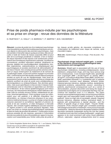 MISE AU POINT Prise de poids pharmaco-induite par les psychotropes et sa prise en charge : revue des données de la littérature O. RUETSCH (1), A. VIALA (1), H. BARDOU (1), P. MARTIN (1), M.N. VACHERON (1) Résumé. La prise de poids lors d’un traitement psychotrope chez les patients souffrant de troubles psychiatriques est connue depuis la découverte des premiers psychotropes, mais elle semble s’intensifier depuis quelques années. Elle est calculée à l’aide de l’indice de masse corporelle (IMC) et peut aller de la surcharge pondérale à l’obésité. C’est un facteur de risque important et elle expose à de nombreuses complications tant somatiques (hypertension artérielle, insuffisance coronarienne, accident vasculaire cérébral, intolérance au glucose, diabète non insulinodépendant, dyslipidémie, troubles respiratoires, ostéoarticulaires ou néoplasiques) que psychologiques et sociales (sentiment de démoralisation et de mise à l’écart). Ces conséquences parfois sévères entraînent un risque d’interruption du traitement et de rechute de la pathologie traitée, et peuvent parfois engager le pronostic vital. L’article fait le point des études menées depuis quelques années au point de vue de l’épidémiologie, mais aussi du mécanisme d’action et des possibilités de prise en charge des patients souffrant de prise de poids sous antidépresseurs, thymorégulateurs ou antipsychotiques. Des données générales, mais aussi spécifiques à chacune des 3 classes médicamenteuses sont ici résumées et rapportées aux données de la littérature. Si les notions épidémiologiques sont mieux connues, les mécanismes étiologiques restent délicats à élucider (rôle du contrôle nerveux central, métabolisme du glucose, pharmacogénétique). Il faut souligner aussi leur association pour ces patients à la difficulté d’équilibrer leur alimentation, au manque d’exercice physique et aux associations médicamenteuses. La prise en charge comporte des mesures associant la surveillance régulière et précoce du poids et de ses variations, un bilan biologique à intervalle régulier, des conseils hygiéno-diététiques pouvant associer un régime prudent à une activité physique régulière, mais aussi une prise en charge psychothérapeutique individuelle et dans le cadre de groupes de patients. L’instauration la plus précoce possible de ces mesures, associée à l’information donnée aux patients le plus tôt possible par rapport à la prescription sont essentielles pour limiter cette prise de poids et les risques qu’elle génère, de mauvaise compliance ou d’interruption du traitement avec risque de rechute, voire d’accident majeur. Mots clés : Épidémiologie ; Prise en charge ; Prise de poids ; Psychotropes. Psychotropic drugs induced weight gain : a review of the literature concerning epidemiological data, mechanisms and management Summary. Weight gain is associated with the use of many psychotropic medications, including antidepressants, mood stabilizers, antipsychotic drugs, and may have serious long term consequences : it can increase health risks, specifically from overweight (BMI = 25-29,9 kg/m m2) to obesity (BMI ≥ 2 30 kg/m ), according to Body Mass Index (BMI), and the morbidity associated therewith in a substantial part of patients (hypertension, coronary heart desease, ischemic stroke, impaired glucose tolerance, diabetes mellitus, dyslipidemia, respiratory problems, osteoarthritis, cancer) ; according to patients, psychosocial consequences such as a sense of demoralization, physical discomfort and being the target of substantial social stigma are so intolerable that they may discontinue the treatment even if it is effective. The paper reviews actual epidemiological data concerning drug induced weight gain and associated health problems in psychiatric patients : there is a high risk of overweight, obesity, impaired glucose tolerance, diabetes mellitus, premature death, in patients with schizophrenia or bipolar disorder ; and the effects of specific drugs on body weight : Tricyclic Antidepressants (TCA) induced weight gain correlated positively with dosage and duration of treatment, more pronounced with amitriptyline ; Selective Serotonin Reuptake Inhibitors (SSRI) decrease transiently bodyweight during the first few weeks of treatment and may then increase bodyweight ; weight gain appears to be most prominent with some mood stabilizers (lithium, valproate) ; atypical antipsychotics tend to cause (1) C Centre t Hospitalier H it li S Sainte-Anne, i t A Secteur S t 13, 13 1, 1 rue C Cabanis, b i 75014 Paris. P i Travail reçu le 24 juin 2004 et accepté le 24 septembre 2004. Tirés à part : M.N. Vacheron (à l’adresse ci-dessus). L’Encéphale, 2005 ; 31 : 507-16, cahier 1 507 O. Ruetsch et al. more weight gain than conventional ones and weight gain, diabetes, dyslipidemia, seem to be most severe with clozapine and olanzapine. Concerning the underlying mechanisms of drug induced weight gain, medications might interfere with central nervous functions regulating energy balance ; patients report about : increase of appetite for sweet and fatty t foods or « food craving » (antidepressants, mood stabilizers, antipsychotic drugs) and weight gain despite reduced appetite which can be explained by an altered resting metabolic rate (TCA, SSRI, Monoaminoxidase Inhibitors MAO I). According to current concepts, appetite and feeding are regulated by a complex of neurotransmitters, neuromodulators, cytokines and hormones interacting with the hypothalamus, including the leptin and the tumor necrosis factor system. The pharmacologic mechanisms underlying weight gain are presently poorly understood : maybe the different activities at some receptor systems may induce it, but also genetic predisposition. Understanding of the metabolic consequences of psychotropic drugs (weight gain, diabetes, dyslipidemia) is essential : the insulin-like ef