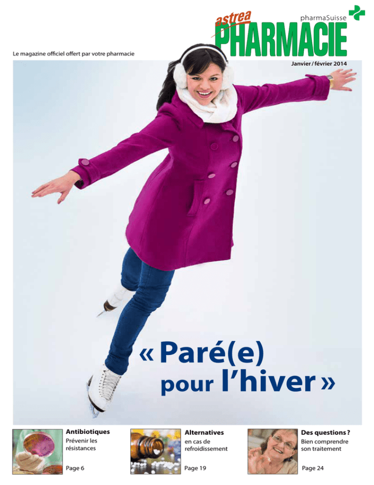 Le magazine officiel offert par votre pharmacie Janvier / février 2014 Dezember 2013 « Paré(e) pour l’hiver » Antibiotiques Alternatives Des questions ? Prévenir les résistances en cas de refroidissement Bien comprendre son traitement Page 6 Page 19 Page 24 Pour aider à la prévention de l’ostéoporose • Comprimé à mâcher – facile à prendre • Posologie: 1 à 2 × par jour • Goût agréable de citron Calcimagona™-D3/Calcimagona™-D3 Forte: C: Calcimagona™-D3: Calcii carbonas 1250 mg (corresp. à 500 mg de calcium élémentaire), Cholecalciferolum 10 μg (corresp. à 400 U.I. de cholécalciférol); Calcimagona™-D3 Forte: Calcii carbonas 2500 mg (corresp. à 1000 mg de calcium élémentaire), Cholecalciferolum 20 μg (corresp. à 800 U.I. de cholécalciférol). I: traitement et prophylaxie des carences en vitamine D et calcium des personnes âgées. Soutien dans la prévention et dans le traitement de l’ostéoporose. P: 1 à 2 comprimés à mâcher de Calcimagona™-D3 ou 1 comprimé à mâcher de Calcimagona™-D3 Forte par jour. CI: hypersensibilité à l’un ou plusieurs des composants, hypercalcémie, hypercalciurie, néphrolithiase ou urolithiase, hypervitaminose D, insuffisance rénale, hyperphosphatémie, hyperparathyroïdie primaire, thérapie par le calcitriol ou d’autres métabolites de la vitamine D, plasmocytome diffus, métastases osseuses, ostéoporose due à une immobilité prolongée, immobilité prolongée associée à une hypercalciurie et/ou une hypercalcémie, phénylcétonurie (Calcimagona™-D3). P: insuffisance hépatique, sarcoïdose. IA: phénytoïne, barbituriques, colestyramine, l’huile de paraffine, préparations digitaliques, tétracyclines, antibiotiques de la classe des quinolones, lévothyroxine, fluorure de sodium, bisphosphonates, préparations ferrugineuses, corticostéroïdes, diurétiques thiazidiques, diurétiques de l’anse. EI: hypercalcémie et hypercalciurie, troubles gastro-intestinaux. C: Calcimagona™-D3: 20**, 60* et 120**; Calcimagona™-D3 Forte: 14**, 30**, 60** et 90** comprimés à mâcher. Catégorie de délivrance: D. Distribution: Takeda Pharma AG, Freienbach. Pour de plus amples informations: cf. www.swissmedicinfo.ch. *disponible sur le marché suisse; ** pas disponible sur le marché suisse 287.13-CAL O Photo: www.merlinphotography.ch CALCIUM PLUS VITAMINE D3 3 1-2 / 2014 Le temps passe si vite, cher lecteur, cher lectrice, et plus je prends de l’âge, plus les choses s’accélèrent. Ma fille a une explication toute trouvée à ce phénomène : « Evidemment qu’une journée te semble si courte puisque cela fait déjà si longtemps que tu es sur terre ! », m’a-t-elle dit un jour. C’est vrai, tout est relatif. Pourtant, nous faisons parfois comme si nous étions maîtres du temps. Nous faisons des plans des années à l’avance, pour les prochains mois, les prochaines semaines ou tout simplement le lendemain. Les choses de la vie sont étonnamment fiables et immuables, je le concède. Inlassablement, l’air enfle nos poumons, le sang coule dans nos veines, nos nerfs et notre système immunitaire travaillent. Mais si ce bel ordonnancement se dérègle ? Si notre cœur défaille, si un vaisseau sanguin se rompt, si notre nuque se brise, qu’une plaie béante se forme et que notre respiration cesse purement et simplement ? Un faux pas et tout s’arrête. Nous pouvons faire autant de plans que nous le voulons, rien ne nous garantit que nous franchirons le soir le seuil de la maison que nous quittons le matin. Chaque jour est un cadeau (même si, avec le temps, les jours raccourcissent de plus en plus). Peut-être devons-nous simplement faire plus de pauses, porter plus d’attention à ce que nous avons déjà et réapprendre à profiter du temps présent. C’est dans cet état d’esprit que je me réjouis de passer une nouvelle année à vos côtés et des nombreuses aventures qu’elle nous réserve. Bien à vous Dr pharm. Chantal Schlatter, pharmacienne Rédactrice en chef astreaPHARMACIE Elle a posé pour nous Nom : Neuhaus Prénom : Itza Lieu de résidence : Berne Age : 27 Situation familiale : Célibataire Profession : Directrice du marketing Qu’aimez-vous le plus dans votre travail ? La diversité Comment définiriez-vous la santé ? Pour moi, la santé fait partie des choses les plus importantes de la vie et nous pouvons faire beaucoup pour la préserver en mangeant ® sainement, en faisant beaucoup de sport et en trouvant un juste équilibre entre travail et vie privée CONTRA-SCHMERZ 400 Utilisez-vous un remède maison en particulier ? 400 CONTRA-SCHMERZ helps Les tisanes helps 400 CONTRE-DOULEURS CONTRE-DOULEURS 400 aide en cas de maux de tête, douleurs dentaires et dorsales 400 aide CONTRA-SCHMERZ Veuillez lire la notice d’emballage. CONTRA-SCHMERZ 400 aiuta ® ® ® ® ® Dr. Wild & Co. AG, 4132 Muttenz www.wild-pharma.com ® Photo: www.merlinphotography.ch Que faites-vous pendant vos loisirs ? Du patin à glace, de la danse et du sport en général. J’aime aussi découvrir d’autres cultures. 4 1-2 / 2014 Annonce publicitaire Lorsque humidité et froid mettent votre santé à l’épreuve … Vent et froid s’engouffrent dans les moindres interstices. Même habillés chaudement nous sommes comme paralysés. Le système immunitaire du corps est tous les jours mis à forte contribution. Une fois affaibli, les virus et bactéries ont beau jeu. La petite entreprise suisse Spagyros propose différents remèdes pour renforcer le système immunitaire ou pour soigner les refroidissements. Pour cela, elle mise exclusivement sur le meilleur de la nature. Gouttes SPAGYMUN® Elles renforcent durablement le système immunitaire et favorisent ses défenses lorsqu’on est sujet aux refroidissements, légères infections d’ordre général ou que les maladies infectieuses traînent en longueur. Les variétés d’échinacées et Eupatorium perfoliatum utilisés de tout temps p