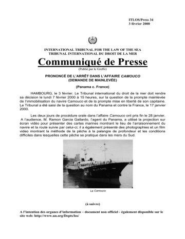 ITLOS/Press 34 3 février 2000 INTERNATIONAL TRIBUNAL FOR THE LAW OF THE SEA TRIBUNAL INTERNATIONAL DU DROIT DE LA MER Communiqué de Presse (Publié par le Greffe) PRONONCÉ DE L’ARRÊT DANS L’AFFAIRE CAMOUCO (DEMANDE DE MAINLEVÉE) (Panama c. France) HAMBOURG, le 3 février. Le Tribunal international du droit de la mer doit rendre sa décision le lundi 7 février 2000 à 15 heures, sur la question de la prompte mainlevée de l’immobilisation du navire Camouco et de la prompte mise en liberté de son capitaine. Le Tribunal a été saisi de la question au nom du Panama et contre la France, le 17 janvier 2000. Les deux jours de procédure orale dans l’affaire Camouco ont pris fin le 28 janvier. A l’audience, M. Ramon Garcia Gallardo, l’agent du Panama, a utilisé la projection sur écran vidéo pour présenter des cartes marines montrant le lieu de l’arraisonnement du navire et la route suivie par celui-ci; il a également présenté des photographies et un film video montrant la méthode de la pêche à la palangre de profondeur et les conditions difficiles dans lesquelles cette pêche se pratique dans les mers du Sud. Le Camouco (à suivre) A l’intention des organes d’information – document non officiel - également disponible sur le site web: http://www.un.org/Depts/los/ 2 Communiqué de Presse ITLOS/Press 34 3 février 2000 La thèse du Panama était que le Camouco qui se trouve actuellement immobilisé à l’île de la Réunion pour pratique de pêche illicite, était engagé dans une activité de pêche dans les mers du Sud, à l’extérieur de la zone économique exclusive des îles Crozet. Le navire aurait changé de cap pour transiter par cette zone en raison du mauvais temps, et poursuivre son activité de pêche une fois qu’il aurait quitté la zone. Le Tribunal a entendu le témoignage de deux experts, cités par le Panama. Un représentant des armateurs du Camouco a été interrogé par l’agent du Panama et contre-interrogé par M. Quéneudec, conseil de la France. Son témoignage a porté sur le propriétaire précédent du Camouco, sur l’immatriculation du navire et sur les spécifications de celui-ci. Il a estimé que le coût des dommages résultant de l’immobilisation se chiffrait déjà à 250 000 dollars des Etats-Unis. Un expert maritime, cité par le Panama, a donné l’avis d’expert selon lequel la valeur du Camouco s’éleverait, tel qu’il l’a indiqué dans le rapport préparé par lui, à 575 000 dollars. Selon l’estimation faite par cet expert, le montant de la caution de 20 millions de francs français (soit environ 3 115 751 dollars), exigée par les autorités françaises en échange de la mainlevée de l’immobilisation du navire correspondrait à la valeur d’un nouveau navire de pêche du même type. Dans sa plaidoirie devant le Tribunal, l’agent du Panama a sollicité du Tribunal pour que celui-ci ordonne la mainlevée de l’immobilisation du navire et la mise en liberté de son capitaine contre le paiement d’une caution raisonnable. Il a déclaré que le capitaine du navire, M. Hombre Sobrido, se trouvait privé de sa liberté à l’île de la Réunion, soit à 15 000 kilomètres de chez lui, cela depuis presque quatre mois. Il a réfuté l’accusation selon laquelle le navire était en train de pêcher dans la zone économique exclusive des îles Crozet au moment où il a été arraisonné, et a déclaré qu’aucune preuve n’a été produite qui étayerait l’affirmation selon laquelle une bouée et une ligne de pêche récupérées dans la mer appartiendraient au Camouco. M. Jean-Francois Dobelle, agent de la France, a ouvert les plaidoiries du défendeur au cours de l’après-midi du premier jour de l’audience. Il a donné la version française des circonstances qui ont entouré l’arraisonnement, le 28 septembre 1999: • • • A 13h28, l’hélicoptère de la frégate de surveillance frégate de surveillance française, le Floréal a aperçu le Camouco et a tenté en vain d’établir un contact radio avec le navire; A 13h30, des documents et 48 sacs auraient été vus en train d’être jetés à la mer à partir du Camouco (un des sacs aurait été récupéré et se serait avéré contenir 34 kilos de légine fraîche); A 14h31, le Camouco a stoppé; (à suivre) A l’intention des organes d’information – document non officiel - également disponible sur le site web: http://www.un.org/Depts/los/ 3 Communiqué de Presse ITLOS/Press 34 3 février 2000 • • • • A 14h33, trois lignes de pêche ont été filées; A 14h35, l’arrière du navire a été lavé à grande eau; A 14h50, d’autres documents ont été jetés à la mer; et A 15h29, des membres de l’équipage du Floréal ont abordé le navire. Les agents qui sont montés à bord du Camouco auraient trouvé 6 tonnes de légine fraîche dans les soutes du navire, des hameçons neufs, des morceaux de sardine utilisées comme appât, des déchets saignants et frais et des filets de légine. Le lendemain de l’arraisonnement, un procès-verbal a été dressé dans lequel il était dit que le Camouco était engagé dans une activité de pêche illicile. M. Dobelle a souligné les conséquences désastreuses qu’a dans les domaines économique et écologique, la pêche illégale, non réglementée et non déclarée dans laquelle, selon l’allégation faite à ce propos, se trouvait engagé le Camouco. La légine est une des espèces de poisson les plus chères dont la majeure partie des prises est vendue sur le marché japonais. M. Dobelle a expliqué que, pour la seule campagne 1996–1997, la pêche illicite a été responsable de la perte d’au moins 375 millions de francs français (soit environ 56 millions de dollars) pour la zone économique exclusive des îles Crozet. La pêche illicite fait peser également une menace sur la reproduction du stock. Il a également mentionné les conditions déplorables dans lesquelles o