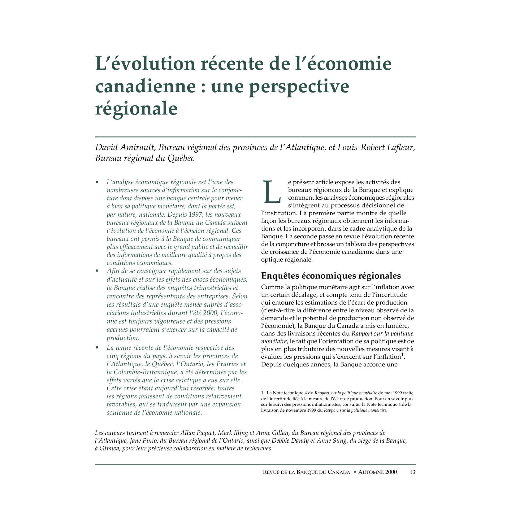 L’évolution récente de l’économie canadienne : une perspective régionale David Amirault, Bureau régional des provinces de l’Atlantique, et Louis-Robert Lafleur, Bureau régional du Québec • • • L’analyse économique régionale est l’une des nombreuses sources d’information sur la conjoncture dont dispose une banque centrale pour mener à bien sa politique monétaire, dont la portée est, par nature, nationale. Depuis 1997, les nouveaux bureaux régionaux de la Banque du Canada suivent l’évolution de l’économie à l’échelon régional. Ces bureaux ont permis à la Banque de communiquer plus efficacement avec le grand public et de recueillir des informations de meilleure qualité à propos des conditions économiques. Afin de se renseigner rapidement sur des sujets d’actualité et sur les effets des chocs économiques, la Banque réalise des enquêtes trimestrielles et rencontre des représentants des entreprises. Selon les résultats d’une enquête menée auprès d’associations industrielles durant l’été 2000, l’économie est toujours vigoureuse et des pressions accrues pourraient s’exercer sur la capacité de production. La tenue récente de l’économie respective des cinq régions du pays, à savoir les provinces de l’Atlantique, le Québec, l’Ontario, les Prairies et la Colombie-Britannique, a été déterminée par les effets variés que la crise asiatique a eus sur elle. Cette crise étant aujourd’hui résorbée, toutes les régions jouissent de conditions relativement favorables, qui se traduisent par une expansion soutenue de l’économie nationale. e présent article expose les activités des bureaux régionaux de la Banque et explique comment les analyses économiques régionales s’intègrent au processus décisionnel de l’institution. La première partie montre de quelle façon les bureaux régionaux obtiennent les informations et les incorporent dans le cadre analytique de la Banque. La seconde passe en revue l’évolution récente de la conjoncture et brosse un tableau des perspectives de croissance de l’économie canadienne dans une optique régionale. L Enquêtes économiques régionales Comme la politique monétaire agit sur l’inflation avec un certain décalage, et compte tenu de l’incertitude qui entoure les estimations de l’écart de production (c’est-à-dire la différence entre le niveau observé de la demande et le potentiel de production non observé de l’économie), la Banque du Canada a mis en lumière, dans des livraisons récentes du Rapport sur la politique monétaire, le fait que l’orientation de sa politique est de plus en plus tributaire des nouvelles mesures visant à évaluer les pressions qui s’exercent sur l’inflation1. Depuis quelques années, la Banque accorde une 1. La Note technique 4 du Rapport sur la politique monétaire de mai 1999 traite de l’incertitude liée à la mesure de l’écart de production. Pour en savoir plus sur le suivi des pressions inflationnistes, consulter la Note technique 4 de la livraison de novembre 1999 du Rapport sur la politique monétaire. Les auteurs tiennent à remercier Allan Paquet, Mark Illing et Anne Gillan, du Bureau régional des provinces de l’Atlantique, Jane Pinto, du Bureau régional de l’Ontario, ainsi que Debbie Dandy et Anne Sung, du siège de la Banque, à Ottawa, pour leur précieuse collaboration en matière de recherches. REVUE DE LA BANQUE DU CANADA • AUTOMNE 2000 13 attention accrue aux données issues des enquêtes ainsi qu’à d’autres informations non officielles2. Depuis quelques années, la Banque accorde une attention accrue aux données issues des enquêtes ainsi qu’à d’autres informations non officielles. Les autres banques centrales ont aussi largement recours à des enquêtes sur le climat économique dans le cadre de leur processus décisionnel. Aux ÉtatsUnis, les banques de la Réserve fédérale publient à tour de rôle le livre beige, un rapport qui renferme des informations sur la conjoncture économique de chacun des districts de la Réserve fédérale. Ces renseignements, qui proviennent de sources diverses, sont recueillis notamment au moyen d’études et d’entrevues réalisées auprès de représentants clés du milieu des affaires, d’économistes et d’experts du marché. La Banque d’Angleterre publie un document intitulé Agents’ Summary of Business Conditions, qui résume les rapports mensuels préparés par les agents régionaux de l’institution au terme de discussions avec les représentants d’environ 1 700 entreprises. La Banque du Japon diffuse pour sa part les résultats de l’enquête Tankan, une enquête trimestrielle sur les conditions économiques du pays réalisée auprès de quelque 10 000 entreprises du secteur privé. À la Banque du Canada, les enquêtes sur la situation de l’économie sont menées par les bureaux régionaux de l’institution. Les bureaux régionaux de la Banque du Canada La Banque du Canada a toujours été très présente dans les diverses régions du pays. Encore récemment, cette présence était assurée par neuf agences réparties dans les grandes villes. Les agences avaient principalement pour mandat de distribuer les billets de banque et de fournir des services relatifs aux obliga2. Parmi les autres sujets étudiés par les bureaux régionaux dans le cadre des enquêtes et des entrevues, mentionnons à titre d’exemple les effets de la restructuration sur l’économie canadienne, dont l’analyse est résumée dans l’article de Kwan (2000). 14 REVUE DE LA BANQUE DU CANADA • AUTOMNE 2000 tions ainsi que des services bancaires aux institutions financières et au gouvernement fédéral. La Banque a aussi tenu des bureaux à Montréal, à Toronto et à Vancouver, et, pendant un certain temps, à Calgary et à Edmonton. Leur fonction consistait à surveiller les marchés financiers et à effectuer des opérations d’open market