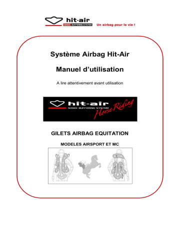 Système Airbag Hit-Air Manuel d’utilisation A lire attentivement avant utilisation GILETS AIRBAG EQUITATION MODELES AIRSPORT ET MC Merci d’avoir choisi un produit Hit-Air. Pour votre sécurité et votre tranquillité d’esprit, lisez bien cette notice avant une première utilisation. TABLE DES MATIERES 1. 2. 3. 4. 5. 6. Précautions d’usage Présentation des accessoires Informations générales Mise en place et utilisation Remise en état après activation Stockage et entretien 1. P REC AUTIONS D’US AG E Les symboles suivants utilisés dans ce manuel porteront votre attention sur les points essentiels au bon fonctionnement de votre produit : AVERTISSEMENT : le non-respect de ces avertissements pourrait entrainer des blessures voire même être mortel. PRECAUTION : le non-respect de ces précautions pourrait entrainer des blessures ou des dommages matériels. 1. Le gilet airbag ne doit être utilisé que pour assurer la sécurité de l’utilisateur sur un cheval. 2. L’utilisateur doit porter un gilet adapté à sa taille et l’utiliser comme vêtement de dessus qui protègera la moitié supérieure de son corps. 3. Lorsque la cartouche de gaz fournie sera vide, elle devra être remplacée par une cartouche de même taille et de même contenu. 4. Avant d’enfiler le gilet, retirer de ce dernier ou du vêtement porté en dessous tout objet coupant ou pointu (épingle, etc.) qui pourrait endommager l’airbag et entraver son bon fonctionnement. 5. Tenir à l’écart des flammes pour ne pas risquer de l’endommager. Pour éviter tout risque d’explosion de la cartouche de gaz, le gilet doit être utilisé et entreposé dans un environnement dont la température est inférieure à 45°C. 6. Déconnecter le gilet à la descente de cheval pour ne pas activer l’airbag. 7. Vérifier régulièrement que l’airbag est en bon état. Au moindre doute, contacter le fabricant. 8. Procéder à une vérification générale une fois par an pour s’assurer de son bon fonctionnement. 9. 10. 11. 12. 13. Non porté, le gilet airbag doit être suspendu. Ne pas le ranger ou le stocker à des températures élevées ou dans un environnement humide. Coudre un écusson sur la veste pourrait détériorer le coussin d’air et empêcher son bon fonctionnement. Vérifier régulièrement que la sangle d’attache est bien fixée à la sangle de selle. Le gilet ne doit en aucun cas être lavé à la main comme en machine ou au nettoyage à sec. Si des traces de rouille ou d’usure apparaissent sur la boucle en acier ou sur le connecteur de la bille-clé, remplacer immédiatement cet élément. 2. PRESENTATION DES ACCESSOIRES Votre gilet léger d’équitation airbag est livré avec une cartouche de CO2, une sangle d’attache d’équitation ainsi qu’un set de réarmement (vis et clé Allen). A la première utilisation, assurezvous que les 6 points de contrôle listés ci-dessous sont respectés. 3. INFORMATIONS GENERALES Le gilet d’équitation léger airbag (système de protection contre les chocs) doit être porté sur la partie supérieure du corps lorsque le cavalier est sur sa monture. Le système se déclenche dès que la distance entre le cavalier et la monture dépasse la distance d’activation, c'est-àdire quand le cavalier chute ou est déséquilibré. Le système s’active lorsque la bille-clé, qui joue le rôle d’élément déclencheur, sort de son boîtier. Ceci entraine la perforation de la cartouche et la libération du gaz contenu dans celle-ci vers les coussins d’air. Les coussins d’air se gonflent et viennent protéger le corps du cavalier des objets qu’il pourrait percuter. L’airbag absorbe les chocs et diminue les risques de blessures et de traumatismes pour le cavalier. Cela n’octroie toutefois pas une sécurité totale pour la cavalier. Il faut une force de 30 à 35 kg pour que la bille-clé soit expulsée de son boîtier. Le dispositif ne se déclenchera donc pas dans des conditions normales, y compris lors d’un taxi ou d’une georgette. Lorsque le cavalier chute avec son cheval, le système ne s’activera que si la distance d’activation est atteinte. Si le cavalier oublie de se déconnecter à la descente et que la distance d’activation est atteinte, il faut une force de 30 à 35 kg pour que le dispositif se déclenche. Une cartouche de gaz ne peut servir qu’une seule fois, après quoi elle devra être remplacée par une autre qui aura été achetée chez le fabricant. 4. MISE EN PLACE ET UTILISATION Comment ajuster la longueur de la sangle de connexion ? Il est préconisé de se tenir debout jambes tendues sur les étriers : dans cette position, la sangle doit être réglée à sa longueur maximale, c'est-àdire tendue. Au-delà de cette position, la bille-clé sera arrachée de son boîtier et le système sera activé. Si la sangle est trop lâche dans cette même position, vous retarderez le déclenchement du système. Si au contraire, la sangle est tendue alors que vous n’êtes qu’accroupi sur la selle, le déclenchement risque de se faire anormalement tôt dans un cas de figure qui ne présente pas nécessairement d’intérêt pour que le système s’active. Le réglage de la sangle de connexion (ou sangle d’attache équitation) doit aussi se faire en fonction de l’aisance naturelle que vous recherchez par rapport et par rapport à vos habitudes de pratiques équestres. Il s’agit dans tous les cas d’optimiser le déclenchement du système. Enfin, il est recommandé d’ajuster votre gilet à la taille à l’aide de la ceinture intérieure ajustable. La ceinture doit être passée dans les passants intérieurs. 5. REMISE EN ETAT APRES ACTIVATION Votre airbag peut être réutilisé, sous réserve d’être réassemblé selon la procédure qui suit si celle-ci est été réalisée correctement. Votre airbag ne peut être réassemblé si lors de la dernière activation, il a été endommagé. Voici quelques précautions à prend
