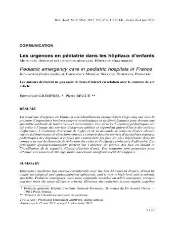 Bull. Acad. Natle Méd., 2013, 197, no 6, 1127-1141, séance du 4 juin 2013 COMMUNICATION Les urgences en pédiatrie dans les hôpitaux d’enfants Mots-clés : Services des urgences médicales. Hôpitaux pédiatriques Pediatric emergency care in pediatric hospitals in France Key-words (Index medicus): Emergency Medical Services. Hospitals, Pediatric Les auteurs déclarent ne pas avoir de liens d’intérêt en relation avec le contenu de cet article. Emmanuel GRIMPREL *, Pierre BÉGUÉ ** RÉSUMÉ La médecine d’urgence en France a considérablement évolué depuis vingt-cinq ans sous la pression d’importants bouleversements sociologiques et épidémiologiques pour devenir une spécialité médicale de haut niveau et universitaire. Les services d’urgences pédiatriques ont été créés à l’image des services d’urgences adultes et répondent aujourd’hui à des critères d’efficience. L’évolution divergente de l’offre et de la demande de soins en France aboutit encore à d’importants dysfonctionnements y compris dans les services d’accueil des urgences pédiatriques des hôpitaux d’enfants qui connaissent les flux les plus importants dans un contexte actuel de demande de réduction des coûts et d’exigence croissante d’efficacité. Les principaux dysfonctionnements portent sur l’absence de gestion des flux en amont et l’insuffisance de la capacité d’hospitalisation d’aval. Des solutions sont proposées pour atténuer ces sources de blocage mais sont encore insuffisamment développées. SUMMARY Emergency medicine has evolved considerably over the last 25 years in France, driven by major sociological and epidemiological upheavals, and is now a high-level and academic specialty. Pediatric emergency units were originally modeled on adult emergency services and now meet the same efficiency criteria. However, the reduction in care supply, together * Pédiatrie générale, Hôpital d’enfants Armand-Trousseau, 26 avenue du Dr Arnold Netter — 75012 Paris, France. ** Membre de l’Académie nationale de médecine Tirés à part : Professeur Emmanuel Grimprel, même adresse Article reçu le 17 mai 2013, accepté le 14 octobre 2013 1127 Bull. Acad. Natle Méd., 2013, 197, no 6, 1127-1141, séance du 4 juin 2013 with the simultaneous increase in demand, has created significant deficiencies. This is particularly true in pediatric teaching hospitals, which deal with the highest volume of patients but are subject to cost-cutting and efficiency measures. The main problems are the lack of flow management upstream and inadequate hospital capacity downstream. Solutions have been proposed to mitigate these issues but more efforts are needed. INTRODUCTION La prise en charge des urgences en France a été fondamentalement transformée pendant ces vingt dernières années sous la pression d’importants bouleversements sociologiques et épidémiologiques, aboutissant à une médecine d’urgence spécialisée de haut niveau et universitaire. La pédiatrie en tant que spécialité a accompagné ce mouvement. L’accueil des urgences pédiatriques est désormais organisé sur l’ensemble du territoire national au sein d’organisations variées selon les besoins et les structures hospitalières. Le mode ultime de cette organisation correspond aux services d’urgences pédiatriques au sein d’hôpitaux spécialisés en pédiatrie. L’objet de cette présentation est d’aborder successivement l’historique et l’évolution des urgences pédiatriques en France en parallèle aux évolutions sociologiques et démographiques, le mode d’organisation et de fonctionnement actuel de ces services d’urgences pédiatriques dans les hôpitaux d’enfants, les difficultés actuelles ou persistantes attenantes à ce mode d’organisation et des solutions ou des propositions éventuelles pour les améliorer. NAISSANCE DE LA MÉDECINE D’URGENCE : DES POSTES DE SECOURS AUX SAU La notion d’urgence est indissociable de celle de l’hôpital public. C’est avec le passage progressif du concept de charité puis d’assistance à celui de solidarité que la santé en France, en tant que préoccupation collective, donnera sa place véritable à l’hôpital et à l’état [1]. L’hôpital aura connu de fortes évolutions depuis sa création par Louis XIV (hôpital général), puis sa nationalisation sous la révolution et sa réorganisation par une ordonnance de Louis XVIII en 1821. Les premiers postes de secours créés au xviiie siècle peuvent apparaître comme les premiers lieux où s’exercera une forme de médecine publique d’urgence. La création de l’internat en médecine et en chirurgie en 1802 puis la première loi hospitalière de 1851 établissant le soin aux indigents en seront des éléments fondateurs essentiels. Les hôpitaux, lieux d’accueil exclusif des pauvres malades, s’ouvriront à partir de 1941 à l‘ensemble de la population, grâce à la création des assurances sociales, évoluant ainsi du statut d’institution sociale vers celui d’institution sanitaire [2]. Dans les années 30, ces lieux d’accueil hospitaliers ouverts sur la rue prendront l’appellation de « service porte », le premier service d’urgence étant créé à l’hôpital Boucicaut en 1948. 1128 Bull. Acad. Natle Méd., 2013, 197, no 6, 1127-1141, séance du 4 juin 2013 Ce n’est qu’à la suite du premier rapport Steg en 1989 [3], que seront créées les premières unités d’accueil d’urgences et que l’évolution de cette discipline s’accélèrera pour aboutir aux structures actuelles. Ce premier rapport portait sur la sécurité aux urgences et pointait d’emblée deux éléments clés qui guideront les évolutions ultérieures : la problématique des flux de patients aux urgences et la sécurité. Les décrets de 1995 et 1997 conduiront à la création des « services d’accueil et de traitement des urgences » ou SAU et les « unités de proximité d’ac