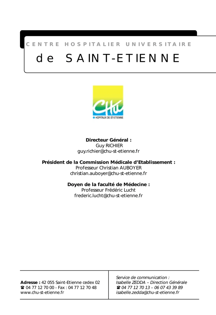 C E N T R E H O S P I TA L I E R U N I V E R S I TA I R E d e SAINT-ETIENNE Directeur Général : Guy RICHIER [email protected] Président de la Commission Médicale d’Etablissement : Professeur Christian AUBOYER [email protected] Doyen de la faculté de Médecine : Professeur Frédéric Lucht [email protected] Adresse : 42 055 Saint-Etienne cedex 02 04 77 12 70 00 - Fax : 04 77 12 70 48 www.chu-st-etienne.fr Service de communication : Isabelle ZEDDA – Direction Générale 04 77 12 70 13 – 06 07 43 39 89 [email protected] CENTRE HOSPITALIER UNIVERSITAIRE DE SAINT-ETIENNE La région Rhône-Alpes La région Rhône-Alpes est la 2e région française par sa population. C’est également un pôle important en matière de santé : - 2e région française dans l’industrie de l’équipement médical - 2e région dans l’industrie pharmaceutique - 60 % de l’industrie du textile médical Les caractéristiques économiques, sociales et démographiques Saint-Etienne bénéficie d’une situation géographique privilégiée, à la confluence des grands axes européens. 2e ville de la région Rhône-Alpes avec une agglomération de 360 000 habitants, Saint-Etienne est aussi la 6e communauté d’agglomération et la 14e ville de France. Les priorités sanitaires Le CHU de Saint-Etienne est un pôle de référence hospitalo-universitaire en région Rhône-Alpes. Il doit répondre parfaitement à l’important besoin de santé qui caractérise la Loire. Le département enregistre, en effet, une précarité et une surmortalité supérieures à la moyenne régionale. Le CHU de Saint-Etienne dans le système sanitaire régional Centre de référence dans de nombreuses disciplines, le CHU de Saint-Etienne assure une fonction de recours et favorise par son partenariat avec l’université et les grandes écoles stéphanoises (ex : Ecole des Mines), l’innovation, le progrès des méthodes diagnostiques et thérapeutiques ainsi que leur diffusion. Il assure également une mission de soins de proximité au bénéfice de l’agglomération stéphanoise en liaison avec divers acteurs. Le CHU de Saint-Etienne a développé de nombreux pôles d’excellence. C’est ainsi qu’il a été l’un des premiers centres français initiateurs du traitement de la dégénérescence maculaire. Il a particulièrement développé des thèmes comme la thrombose, la douleur corticale, l’IRM fonctionnelle , la prise en charge pluridisciplinaire des accidents vasculaires cérébraux, les troubles des conduites alimentaires, le traitement des mélanomes… Il est le premier site labellisé en Rhône-Alpes pour la maladie d’Alzheimer et la prise en charge de la Sclérose Latérale Amyotrophique. Sites hospitaliers en 2002 : Services hospitaliers en 2002 : Facultés de médecine : 4 60 1 Les missions Soins SMUR 2000 2001 2002 Variation 2002/00 Appels au Centre 15 Interventions SMUR terrestre Interventions SMUR héliportées 424 89 647 97 585 - 8,85 % 5 967 5 716 - - 4,21 % 984 979 - - 0,51 % Situation - Missions - Organisation - Projet d’établissement - Dynamique éco - Démocratie - Culture - International CENTRE HOSPITALIER UNIVERSITAIRE DE SAINT-ETIENNE Urgences 2000 Passages aux urgences enfants Passages aux urgences adultes Activités de court séjour Consultations soins externes Naissances Entrées directes en hospitalisation conventionnelle MCO Séjours en hospitalisation complète en MCO Taux d’occupation en hospitalisation complète en MCO Séjours de moins de 24 heures en MCO Venues et séances en hospitalisation à temps partiel MCO 2001 2002 19 232 18 897 20 262 7,22 % 37 734 37 534 38 390 2,28 % 2000 2001 2002 Variation 2002/00 Variation 2002/00 219 145 220 574 - - 2 689 2 697 2 776 3,23 % 38 864 38 616 38 346 1,34 % 51 904 51 782 51 028 1,70 % 86,05 86,08 86,1 0,05 % 3 462 4 959 4 938 43,66 % 32 883 28 910 30 009 15,88 % Les plus fortes progressions au cours de ces 5 dernières années Cardiologie : en hospitalisation : + 43,5 % en entrées (4 480 entrées en 2002) / en coronarographie : + 45,4% (2 775 coronarographies) / en angioplasties : + 65% (919 angioplasties) / en stimulation cardiaque : + 79 % (285 stimulateurs) / en défibrillation cardiaque : + 100% (39 défibrillateurs implantés en 2002) / en électrophysiologie : + 183 % Orthopédie : en poses de prothèses de genou : + 55,8 % ( 67 prothèses en 2002) / prothèses de hanche : +54,7 % (348 prothèses) / en prothèses d’épaule : + 286 % (27 prothèses) Chirurgie cardiaque : en interventions : + 14,7 % (547 interventions en 2002) Radiologie : IRM : + 49,2, % (6 100 IRM en 2002) Biologie : + 11,1 % ( 110 000 000 B) – les spécialités en forte progression : biochimie hématologie- bactériologie – parasitologie – virologie - génétique Durée Moyenne de Séjour en Médecine Chirurgie Obstétrique (MCO) 2000 2001 2002 Variation 2002/00 En nombre de jours 5,98 5,9 6,02 0,69 Part de l’activité ambulatoire // à l’ensemble de l’activité 2000 2001 2002 Variation 2002/00 0,25 % 0,26 % - 4,82 % En nombre de jours Situation - Missions - Organisation - Projet d’établissement - Dynamique éco - Démocratie - Culture - International 425 CENTRE HOSPITALIER UNIVERSITAIRE DE SAINT-ETIENNE Volume de points ISA en 2001 Valeur du point ISA en 2001 Activité EHPAD3 92 903 933 redressé 2,27 € 2000 2001 2002 Variation 2002/00 62 278 63 842 57 444 -7,51 % Fin de vie 2000 2001 2002 Variation 2002/00 Décès 1 477 1 446 1 511 2,40 % 294 244 - - Nombre de journées d'hébergement (maison de retraite et Unité de soins de Longue durée confondues) Personnes décédées ayant bénéficié de soins palliatifs, Recherche 2002 PHRC nationaux en cours : 18 PHRC régionaux en cours : 11 Etudes menées en collaboration avec les laboratoires : 79 Equipes labellisées (INSERM,CNRS…) : 3 équipes labellisées Inserm Participation à des recherches internationales : 21 Centre de Recherche Clinique : 0 Centre d’Investigation Clinique : 1 (créat