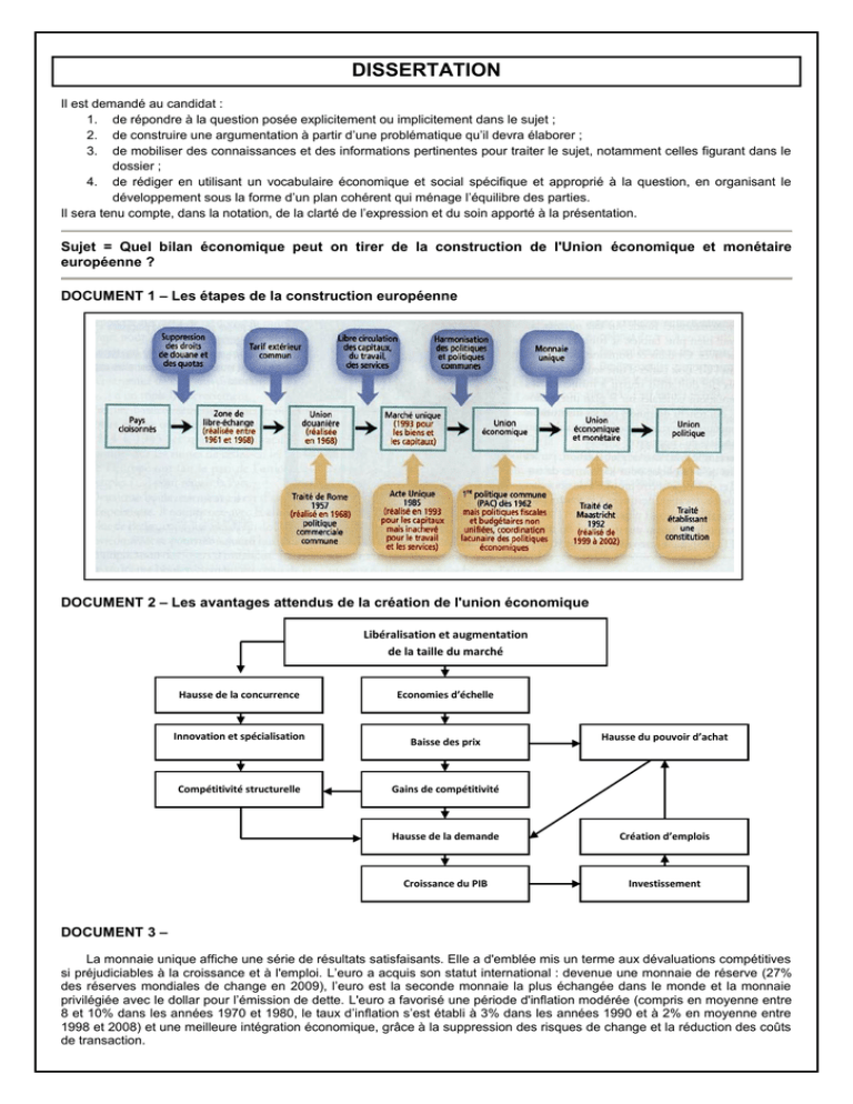DISSERTATION Il est demandé au candidat : 1. de répondre à la question posée explicitement ou implicitement dans le sujet ; 2. de construire une argumentation à partir d’une problématique qu’il devra élaborer ; 3. de mobiliser des connaissances et des informations pertinentes pour traiter le sujet, notamment celles figurant dans le dossier ; 4. de rédiger en utilisant un vocabulaire économique et social spécifique et approprié à la question, en organisant le développement sous la forme d’un plan cohérent qui ménage l’équilibre des parties. Il sera tenu compte, dans la notation, de la clarté de l’expression et du soin apporté à la présentation. Sujet = Quel bilan économique peut on tirer de la construction de l'Union économique et monétaire européenne ? DOCUMENT 1 – Les étapes de la construction européenne DOCUMENT 2 – Les avantages attendus de la création de l'union économique Libéralisation et augmentation de la taille du marché Hausse de la concurrence Innovation et spécialisation Compétitivité structurelle Economies d’échelle Baisse des prix Hausse du pouvoir d’achat Gains de compétitivité Hausse de la demande Création d’emplois Croissance du PIB Investissement DOCUMENT 3 – La monnaie unique affiche une série de résultats satisfaisants. Elle a d'emblée mis un terme aux dévaluations compétitives si préjudiciables à la croissance et à l'emploi. L’euro a acquis son statut international : devenue une monnaie de réserve (27% des réserves mondiales de change en 2009), l’euro est la seconde monnaie la plus échangée dans le monde et la monnaie privilégiée avec le dollar pour l’émission de dette. L'euro a favorisé une période d'inflation modérée (compris en moyenne entre 8 et 10% dans les années 1970 et 1980, le taux d’inflation s’est établi à 3% dans les années 1990 et à 2% en moyenne entre 1998 et 2008) et une meilleure intégration économique, grâce à la suppression des risques de change et la réduction des coûts de transaction. Si l'euro se porte bien, la zone euro traverse elle une crise profonde, marquée par l'atonie de l'activité économique et de profonds déséquilibres internes. La croissance de la productivité s’est ralentie dans la zone euro depuis l’introduction de la monnaie unique (de 1,5% dans les années 1990, la croissance de la productivité est passée à 1% entre 1998 et 2008). Les écarts significatifs qui demeurent au sein de la zone (coûts de main d'œuvre, taux de chômage, taux d'emploi) et les divergences de compétitivité entre pays de la zone euro limitent les capacités d'ajustement de l'Union économique et monétaire. Sur le front des échanges, certes, l'Union européenne reste le premier exportateur mondial et la balance courante agrégée de la zone euro est globalement proche de l'équilibre, mais cette situation masque des écarts très conséquents. La principale explication de la crise a été l'indistinction des risques souverains : la zone euro a été perçue, dans son ensemble, comme représentant un risque homogène. Avec la promesse de l'euro, la baisse des taux d'intérêt dans certains Etats a été ample. Cette période de taux d'intérêt bas a produit sur nos politiques économiques l'effet d'un puissant sédatif. Les Etats n'en ont pas profité pour assainir leurs finances publiques et préparer l'avenir. La crise financière puis la crise des dettes souveraines ont fait sortir les acteurs de marché d'un consensus aveugle : les écarts de taux d'intérêt (« spreads ») sont redevenus l'indicateur des écarts de compétitivité entre nos pays et les incertitudes sur les finances publiques sont revenues au cœur de l'attention des investisseurs. Cela s'est traduit par un assèchement de l'accès à la liquidité sur les marchés financiers entre l'automne 2009 et le printemps 2010, en Grèce, puis au Portugal et en Irlande. (Source : Jean Arthuis, Avenir de la zone euro : l’intégration politique ou le chaos, Rapport au 1er mars 2012) DOCUMENT 5 – Taux de chômage 1999 2011 Allemagne 8,2 5,6 France 11,0 10,0 Royaume-Uni 5,9 8,4 Espagne 12,5 24,1 Italie 11,0 9,8 Irlande 5,7 14,5 Zone Euro 9,3 10,6 UE 8,5 10,0 Etats-Unis 4,2 8,2 Japon 4,7 4,8 (Source : Eurostat 2012) DOCUMENT 5 – Taux d'inflation 1999 0,6 0,6 1,3 2,2 1,7 2,5 1,1 1,2 2,2 - 0,3 2011 2,5 2,3 4,5 3,1 2,9 1,2 2,7 3,1 2,9 - 0,2 PIB par tête 100 = EU 1999 2011 112,6 117,6 104,1 108,0 110,3 114,0 66,7 100,2 90,9 100,2 98,4 127,3 94,7 107,9 100 100 142,0 148,0 148,7 106,0 Balance courante En % du PIB 1999 2011 - 1,2 4,9 1,0 - 2,3 - 2,4 - 0,6 - 2,7 - 4,0 1,0 - 3,6 0,3 0,5 0,4 0,1 0,1 - 0,2 - 3,0 - 3,0 2,6 2,2 Dette publique En % du PIB 1999 2011 60,9 81,4 58,2 97,0 43,7 88,5 40,9 78,8 113,7 132,7 48,1 112,7 71,6 88,7 67,0 81,6 61,4 98,5 128,3 204,1 er DOCUMENT 6 – Le cours de l'euro en dollar du 1 janvier 1999 au mois d’avril 2012 LE BILAN DE L'UNION ECONOMIQUE ET MONETAIRE Introduction : Amorce = La méfiance des marchés financiers envers la capacité de l'Etat Grec à rembourser sa dette et dans la capacité des Etats à adopter des stratégies coopérative, s'est traduite, dès 2010, par une baisse sensible de la valeur de l'euro vis-à-vis du dollar. La construction de l’Union européenne qui repose sur la coexistence d’institutions supranationales (la Commission européenne, la monnaie unique, la BCE…) et de politiques nationales est-elle vouée à l’échec ? Problématique = Les objectifs du rapprochement économique et politique des Etats de l’Union ont-ils été atteints ? Quels étaient les objectifs de l'intégration économique et institutionnelle des économies européennes faisant partie de l'Union européenne ? Comment cette intégration a-t-elle été menée ? Cette intégration a-t-elle eu les effets positifs escomptés par sa construction ? Les effets positifs constatés l'ont-ils emporté sur les effets négatifs ? Doit-on continuer dans cette