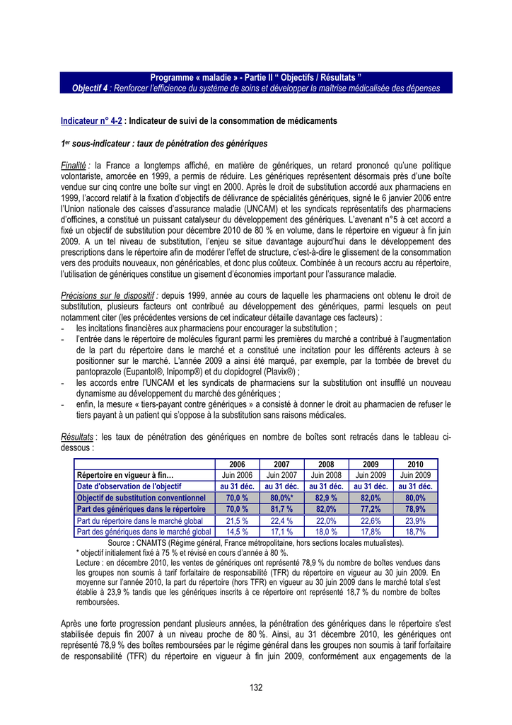 Programme « maladie » - Partie II “ Objectifs / Résultats ” Objectif 4 : Renforcer l’efficience du système de soins et développer la maîtrise médicalisée des dépenses Indicateur n° 4-2 : Indicateur de suivi de la consommation de médicaments 1er sous-indicateur : taux de pénétration des génériques Finalité : la France a longtemps affiché, en matière de génériques, un retard prononcé qu’une politique volontariste, amorcée en 1999, a permis de réduire. Les génériques représentent désormais près d’une boîte vendue sur cinq contre une boîte sur vingt en 2000. Après le droit de substitution accordé aux pharmaciens en 1999, l’accord relatif à la fixation d’objectifs de délivrance de spécialités génériques, signé le 6 janvier 2006 entre l’Union nationale des caisses d’assurance maladie (UNCAM) et les syndicats représentatifs des pharmaciens d’officines, a constitué un puissant catalyseur du développement des génériques. L’avenant n°5 à cet accord a fixé un objectif de substitution pour décembre 2010 de 80 % en volume, dans le répertoire en vigueur à fin juin 2009. A un tel niveau de substitution, l’enjeu se situe davantage aujourd’hui dans le développement des prescriptions dans le répertoire afin de modérer l’effet de structure, c’est-à-dire le glissement de la consommation vers des produits nouveaux, non généricables, et donc plus coûteux. Combinée à un recours accru au répertoire, l’utilisation de génériques constitue un gisement d’économies important pour l’assurance maladie. Précisions sur le dispositif : depuis 1999, année au cours de laquelle les pharmaciens ont obtenu le droit de substitution, plusieurs facteurs ont contribué au développement des génériques, parmi lesquels on peut notamment citer (les précédentes versions de cet indicateur détaille davantage ces facteurs) : - les incitations financières aux pharmaciens pour encourager la substitution ; - l’entrée dans le répertoire de molécules figurant parmi les premières du marché a contribué à l’augmentation de la part du répertoire dans le marché et a constitué une incitation pour les différents acteurs à se positionner sur le marché. L'année 2009 a ainsi été marqué, par exemple, par la tombée de brevet du pantoprazole (Eupantol®, Inipomp®) et du clopidogrel (Plavix®) ; - les accords entre l’UNCAM et les syndicats de pharmaciens sur la substitution ont insufflé un nouveau dynamisme au développement du marché des génériques ; - enfin, la mesure « tiers-payant contre génériques » a consisté à donner le droit au pharmacien de refuser le tiers payant à un patient qui s’oppose à la substitution sans raisons médicales. Résultats : les taux de pénétration des génériques en nombre de boîtes sont retracés dans le tableau cidessous : 2006 2007 2008 2009 2010 Répertoire en vigueur à fin… Juin 2006 Juin 2007 Juin 2008 Juin 2009 Juin 2009 Date d'observation de l'objectif au 31 déc. au 31 déc. au 31 déc. au 31 déc. au 31 déc. Objectif de substitution conventionnel 70,0 % 80,0%* 82,9 % 82,0% 80,0% Part des génériques dans le répertoire 70,0 % 81,7 % 82,0% 77,2% 78,9% Part du répertoire dans le marché global 21,5 % 22,4 % 22,0% 22,6% 23,9% Part des génériques dans le marché global 14,5 % 17,1 % 18,0 % 17,8% 18,7% Source : CNAMTS (Régime général, France métropolitaine, hors sections locales mutualistes). * objectif initialement fixé à 75 % et révisé en cours d’année à 80 %. Lecture : en décembre 2010, les ventes de génériques ont représenté 78,9 % du nombre de boîtes vendues dans les groupes non soumis à tarif forfaitaire de responsabilité (TFR) du répertoire en vigueur au 30 juin 2009. En moyenne sur l’année 2010, la part du répertoire (hors TFR) en vigueur au 30 juin 2009 dans le marché total s’est établie à 23,9 % tandis que les génériques inscrits à ce répertoire ont représenté 18,7 % du nombre de boîtes remboursées. Après une forte progression pendant plusieurs années, la pénétration des génériques dans le répertoire s'est stabilisée depuis fin 2007 à un niveau proche de 80 %. Ainsi, au 31 décembre 2010, les génériques ont représenté 78,9 % des boîtes remboursées par le régime général dans les groupes non soumis à tarif forfaitaire de responsabilité (TFR) du répertoire en vigueur à fin juin 2009, conformément aux engagements de la 132 convention. Toutefois, en cohérence avec les années précédentes, si on souhaitait observer le taux de pénétration des génériques dans le répertoire en vigueur en juin 2010, ce taux serait de 75,9 % à fin décembre 2010. Dans le marché total, la part des génériques non soumis à TFR a presque doublé entre 2005 et 2010, passant de 10,2 % à 18,7 %, sous le double effet de la pénétration des génériques au sein du répertoire et de la diffusion du répertoire dans le marché. Le ralentissement de la progression du taux de générique, voire sa baisse en 2009, peut s’expliquer par différents facteurs. La première raison est liée à certains médicaments « sensibles » que les pharmaciens ont des difficultés à substituer en raison du profil des patients (âge, ...) et de la lourdeur des pathologies concernées. La seconde tient au volume important de médicaments récemment intégrés au répertoire : ils tirent le taux de substitution moyen vers le bas car ils n'ont pas encore atteint leur taux de substitution de croisière. Entre juin 2008 et juin 2009, un nombre particulièrement important de principes actifs ont été génériqués et intégrés au répertoire conventionnel. En nombre de boîtes, les spécialités issues de cette extension du répertoire représentent fin 2009 17 % du répertoire conventionnel (contre 7 % fin 2008, pour l'extension entre juin 2007 et juin 2008). Ce phénomène particulièrement important de l'extension du répertoire est pro