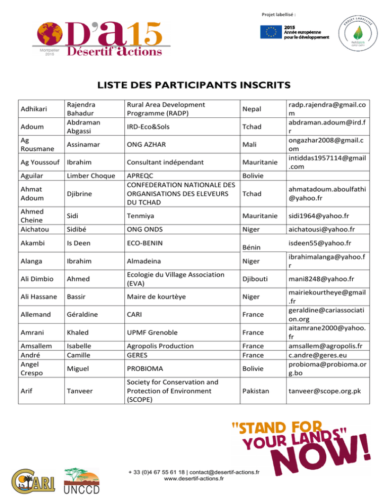 Projet labellisé : LISTE DES PARTICIPANTS INSCRITS Rajendra Bahadur Abdraman Abgassi Rural Area Development Programme (RADP) Nepal IRD--Eco&Sols Tchad Assinamar ONG AZHAR Mali Ag Youssouf Ibrahim Consultant indépendant Mauritanie Aguilar Limber Choque Ahmat Adoum Djibrine APREQC Bolivie CONFEDERATION NATIONALE DES ORGANISATIONS DES ELEVEURS Tchad DU TCHAD TC Adhikari Adoum Ag Rousmane [email protected] m [email protected] r [email protected] om intiddas1957114@gmail .com ahmatadoum.aboulfathi @yahoo.fr Ahmed Cheine Aichatou Sidi Tenmiya Mauritanie [email protected] Sidibé ONG ONDS Niger [email protected] Akambi Is Deen ECO--BENIN Alanga Ibrahim Almadeina Niger [email protected] r Ali Dimbio Ahmed Ecologie du Village Association (EVA) EVA) Djibouti [email protected] Ali Hassane Bassir Maire de kourtèye Niger Allemand Géraldine CARI France Amrani Khaled UPM Grenoble UPMF France Amsallem André Angel Crespo Isabelle Camille Agropolis Production GERES France France Miguel PROBIOMA Bolivie Tanveer Society for Conservation and Protection of Environment (SCOPE) Pakistan Arif Bénin + 33 (0)4 67 55 61 18 | [email protected] contact@desertif www.desertif-actions.fr [email protected] mairiekourtheye@gmail .fr geraldine@cariassociati on.org aitamrane2000@yahoo. fr [email protected] [email protected] [email protected] g.bo [email protected] benultopuzoglu@ozorm an-is.org.tr [email protected] Aslan Settar ÖZ ORMAN İŞ TRADE UNION Turquie Assadek Cham Cham Goli Amenan Delphine CNEDD Niger ONG ADDY Cote d'Ivoire [email protected] Attoumani Maissane CARI France Azoulay Gérard Université paris Sud France Assie maissane.attoumaniam [email protected] [email protected] Ba Abdoulaye Ba Souleymane Ba Ba Ousmane Said CENTER FOR SOCIOECONOMICPOLICY RESEARCH AND Gambie ENVIRONMENTAL DEVELOPMENTAL CENTER FOR SOCIO-ECONOMIC POLICY RESEARCH AND Gambie ENVIRONMENTAL DEVELOPMENTAL HOUBOUL WATANE MAURITANIE Mauritanie Sénégal Bah Umar International University of Africa Soudan Baker Louise Allemagne Bakiika Robert Uganda [email protected] Baldeh Samba D. UNCCD Environmental Management for Livelihood Improvement Bwaise Facility (EMLI) TASK FORCE- GAMBIA POLICE FORCE [email protected] m [email protected] Ball Emmanuel STM France Barbut Bataoui Begni Monique Ghizlane Gérard UNCCD Allemagne France France Gambie Belsaien Kamal Faculté des sciences Rabat/ Institut National de la Recherche Agronomique Rabat- Maroc Ben Aoun Elyes ASOC Tunisie Ben khatra Nabil Observatoire du Sahara et du Sahel Tunisie Benaddoun Ahmed APEB Algérie Benkerroum Abderrahmane FAF-MF France Bensaguem Noura ASOC - CARI Tunisie Benzid Amel GIZ Algérie Maroc [email protected] [email protected] om [email protected] om [email protected] [email protected] kamal.belhsaien@gmail. com [email protected] m [email protected] g.tn benaddoun_47@yahoo. fr [email protected] [email protected] m + 33 (0)4 67 55 61 18 | [email protected] www.desertif-actions.fr Bernoux Berrahmoun i Bessala Bessaoud Bessieres Bettin Billaz Bivol Martial IRD France Nora FAO Italie Jean Paul Omar marie Renaud René Elena MIEPNA CIHEAM-IAMM gret GERES AVSF NGO BIOS AIDE-21 Afrique Internationale pour le Developemment et l'Environnement au 21eme siècle Cameroun FRANCE France France France Moldavie [email protected] nora.berrahmouni@fao. org [email protected] [email protected] [email protected] [email protected] [email protected] [email protected] Boncana Hafizou Mali [email protected] [email protected] om Burkina Faso [email protected] Bonkoungou Sayouba APEDR Burkina Faso Botoni Edwige CILSS Boubacar Zalia Yacouba Ministère de l'environnement - Poi Niger Bouis Joel Mairie du Vigan France [email protected] Boulier Fabien France [email protected] Bounouara Zohra CARI UMR eco et sol Montpellier, Université 20 Aout 1955 Skikda Algérie France bounouarazohra@gmail .com Boutonnet Françoise CARI France Bouzaida Mohamed Amir INSTITUT DES REGIONS ARIDES Tunisie Bra Brac Anne Cécile Robert Ali France France Briki Mourad Bringer Jacques Broin Mélanie RFI BEDE Observatoire du Sahara et du Sahel Faculté de Médecine de Montpellier Agropolis International France Burger Patrice CARI France Buttet Canli Castro Salinas Georges Pinar Catherine Alain CARI France Ceinos Aurélie France Chaira Nizar Chataigner Jean Marc CARE France Institut des régions arides de Médenine IRD Tunisie francoiseboutonnet@or ange.fr [email protected] om [email protected] [email protected] n France CARI France Ministère des Forêts et de l'eau Turquie EarthAction Santiago/Accion por la Viviane Florencia Chilie Tierra Tunisie [email protected] patriceb@cariassociatio n.org [email protected] vcastro@accionporlatier ra.cl catherine.alain@dartyb ox.com [email protected] [email protected] .tn France + 33 (0)4 67 55 61 18 | [email protected] www.desertif-actions.fr Cheikh Mohamed Vadhel Association pour la Protection de Cheikhna Ahmed l'Environnement en Mauritanie & Aidara Association Transparence et Déveloopement Mauritanie [email protected] Cheneval Jean Baptiste CARI France [email protected] rg Cherif Fatoumata FEDEP Guinée Conakry [email protected] Chikomo John Tanzanie [email protected] Chotte Cifuentes Jean-Luc Ricardo France Chilie [email protected] [email protected] Claude Jacques Colin Thomas Réseau Compost Plus France Cornet Antoine CSFD France Correa Jorge Coulibaly Coulibaly Dandakoye Dangaix Dantec Dao Dardel Deburge Journalists' Environmental Association of Tanzania (JET) IRD OLCA DR de l'IRD en retraite, hydrologue spécialiste des régions sèches. France thomascolin@compostp lus.org [email protected] Espagne [email protected] Ibrahim Kouloutan Illiassou Denis Ronan Adama Philippe Nicolas Nazioarteko Elkartasuna Solidaridad Internacional ROPPA Point Focal Grande Muraille Verte FUGPN-MOORIBEN ARENE Île-de-France Sénateur ONG ADDY Banque Mondiale Indépendant Burkina Faso Mali Niger France France Cote d'Ivoire Etats Unis France Depeyer Yvette Le Vigan France Derkimba Adeline CARI France Destrai