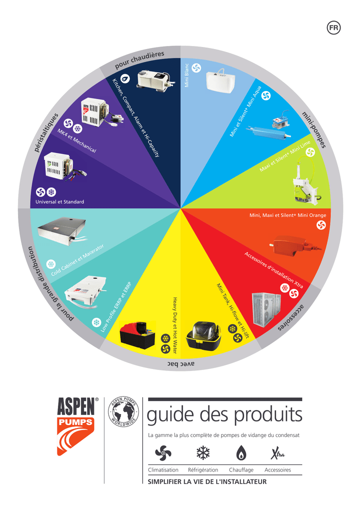 FR audiè res ist tS Mi ni e alt iq ue s nic ni Mi pa al cit pé r ha y xi Ma t+ en il tS e es mp po ec -Ca Hi tM et 4e iin arm Al MK m ct, ile nt + pa om ,C Mi ni A en ch qu a Kit Mini Blanc r ch pou e Lim Universal et Standard Mini, Maxi et Silent+ Mini Orange or RP et a sta lla tio nX tra RP ER file Pro et lift Hi- Lo w a w c c es s flo Hi- la 'in k, r ou sd n Ta Heavy Duty et Hot Water gr ire ni ER nd sso Mi ed ce A avec bac W O EN PUM PS SP E ib is tr Ac M ine b a dC ol C t te s re oi n utio rat e ac RLD WID guide des produits La gamme la plus complète de pompes de vidange du condensat Climatisation Réfrigération Chauffage Accessoires SIMPLIFIER LA VIE DE L'INSTALLATEUR p 7 RAISONS POUR LESQUELLES CHOISIR ASPEN PUMPS 100 % ENGAGÉE À VOUS FOURNIR LA MEILLEURE QUALITÉ ; ASPEN EST LE LEADER DU MARCHÉ DE LA VIDANGE DU CONDENSAT 2 INSTALLATION FACILE Les ingénieurs d'Aspen recherchent constamment de nouvelles idées pour améliorer et créer des produits faciles à installer, qui permettent aux installateurs de gagner du temps. De son dispositif antisiphonnement révolutionnaire à ses accessoires Plug & play, Aspen a pour objectif de simplifier la vie des installateurs. GRAND CHOIXII Vous pouvez choisir parmi plus de 50 modèles et des centaines d'accessoires. Aspen Pumps met à votre disposition tout ce dont vous avez besoin en matière de pompes spécifiquement conçues pour les systèmes de conditionnement de l'air, de réfrigération et de chauffage. 5 4 DANS LE MONDE ENTIER EXPERTSII Aspen Pumps conçoit et fabrique les meilleures pompes de condensat sur le marché depuis 1992. Sa réputation est basée sur sa connaissance du marché et sur sa capacité à créer des produits professionnels, innovants et faciles à installer. 2 1 6 ASSISTANCEII 3 HAUTE QUALITÉII Aspen est fière de fournir des produits fiables et de haute qualité, conçus au RoyaumeUni avec des matériaux de qualité supérieure Tous les produits Aspen bénéficient d'une garantie constructeur. 7 DURABILITÉII De l'Europe à l'Amérique, en Aspen Pumps offre une gamme Des pompes aux emballages, passant par l'Afrique et le complète d'assistance par les produits Aspen sont fabriqués Moyen-Orient, Aspen Pumps téléphone et par e-mail, des à partir de matériaux recyclés, dans approvisionne plus de 100 pays et didacticiels en ligne, des la mesure du possible. La société a développé un réseau de formations sur ou hors site, des éduque également les utilisateurs 100 partenaires Channel Partners. fiches techniques à télécharger et finaux, pour leur donner les des manuels en plusieurs langues. moyens de recycler l'eau de leur Visitez le site interactif de la système de conditionnement de aspenpumps.com société pour trouver votre l'air en eaux grises. Économiser de +44 (0)1323 848842 distributeur le plus proche. l'eau et de l'argent ! [email protected] aspenpumps.com aspenpumps.com +44 (0)1323 848842 [email protected] Simplifier la vie de l'installateur créée par des installateurs pour des installateurs Établie par trois ingénieurs expérimentés et spécialisés dans le conditionnement de l'air, la société Aspen Pumps fournit des solutions pour l’évacuation des condensats depuis plus de 20 ans. Depuis le début de ses activités, la société n'a cessé d'étayer sa gamme de plus de 50 pompes d’évacuation des condensats pour les systèmes de réfrigération et de chauffage. Elle approvisionne désormais plus de 100 pays dans le monde. L'objectif principal d'Aspen est de continuer à simplifier la vie des installateurs, en leur offrant les pompes les plus fiables au monde. Aspen conçoit des produits dont le principe de fonctionnement est simple et intelligent, car ses ingénieurs savent que votre temps est précieux. POMPES PÉRISTALTIQUES MINI-POMPES Introduction aux mini-pompes Mini & Maxi Orange Maxi Lime Mini Aqua Mini Blanc 8–9 10–11 12 15 14 Introduction aux pompes péristaltiques 32-33 Universal34 Standard35 MK436 Mechanical37 POMPES POUR SUPERMARCHÉ POMPES SILENT+ Introduction à la gamme de pompes Silent+16-17 Silent+ Mini Orange 18 Silent+ Mini Lime 19 Silent+ Mini Aqua 20 Introduction aux pompes pour supermarché 38-39 Low Profile ERRP 40 ERRP41 Cold Cabinet 42 Macerator 4 L & 10 L 43 POMPES AVEC BACS Introduction aux pompes avec bacs Mini Tank Hi-flow 0.5 L Hi-flow 1 L & 2 L Hi-lift 1 L & 2 L Heavy Duty 6 & 10 Hot Water Economy Hot Water Heavy Duty 22-23 24 25 26 27 28 29 30 Introduction aux pompes pour chaudières 44-45 Kitchen46 Compact47 Alarm48 Hi-Capacity49 ACCESSOIRES XTRA Reportez-vous à l'arrière de ce catalogue pour consulter la plus grande gamme d'accessoires pour installateurs ! Informations correctes au moment de la publication. aspenpumps.com POMPES POUR CHAUDIÈRES +44 (0)1323 848842 [email protected] Simplifier la vie de l'installateur 3 une approche professionnelle Entrée des condensats Pourquoi choisir une pompe d’évacuation des condensats? Les méthodes traditionnelles de vidange des condensats destinées aux centrales de conditionnement de l'air sont souvent contraignantes et problématiques. Support mural Une installation ultra flexible Aspen sait que la flexibilité est un aspect important de votre projet d'installation. Les systèmes de vidange par gravité s'avèrent souvent contraignants en matière de positionnement de la centrale (à l'intérieur ou à l'extérieur). Les pompes de vidange du condensat permettent d'obtenir un positionnement et un aspect esthétique optimaux pour toutes les installations, sans perdre en efficacité et en performance. Les pompes Aspen vous offrent une flexibilité inégalée, quelle que soit l'application. Une installation professionnelle Les pompes de relevage des condensats garantissent une installation professionnelle et esthétique à chaque fois. Faciles d'accès, les pompes vous permettent de placer les centrales de conditionnement de l'air à l'endroit requis, sans tuyaux apparents. Le condensant 