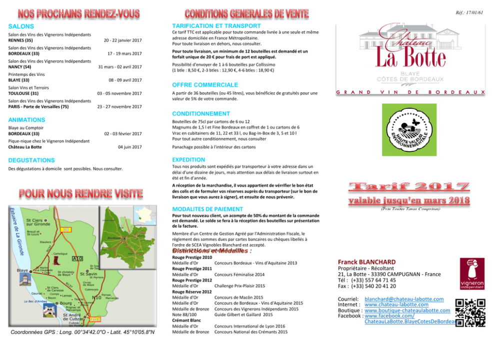 Réf.: 17/01/61 TARIFICATION ET TRANSPORT SALONS Salon des Vins des Vignerons Indépendants RENNES (35) 20 - 22 janvier 2017 Salon des Vins des Vignerons Indépendants BORDEAUX (33) 17 - 19 mars 2017 Salon des Vins des Vignerons Indépendants NANCY (54) 31 mars - 02 avril 2017 Printemps des Vins BLAYE (33) 08 - 09 avril 2017 Salon Vins et Terroirs TOULOUSE (31) 03 - 05 novembre 2017 Salon des Vins des Vignerons Indépendants PARIS - Porte de Versailles (75) 23 - 27 novembre 2017 Ce tarif TTC est applicable pour toute commande livrée à une seule et même adresse domiciliée en France Métropolitaine. Pour toute livraison en dehors, nous consulter. Pour toute livraison, un minimum de 12 bouteilles est demandé et un forfait unique de 20 € pour frais de port est appliqué. Possibilité d'envoyer de 1 à 6 bouteilles par Collissimo (1 btle : 8,50 €, 2-3 btles : 12,90 €, 4-6 btles : 18,90 €) OFFRE COMMERCIALE A partir de 36 bouteilles (ou 45 litres), vous bénéficiez de gratuités pour une valeur de 5% de votre commande. CONDITIONNEMENT ANIMATIONS Blaye au Comptoir BORDEAUX (33) Pique-nique chez le Vigneron Indépendant Château La Botte 02 - 03 février 2017 04 juin 2017 DEGUSTATIONS Des dégustations à domicile sont possibles. Nous consulter. Bouteilles de 75cl par cartons de 6 ou 12 Magnums de 1,5 l et Fine Bordeaux en coffret de 1 ou cartons de 6 Vrac en cubitainers de 11, 22 et 33 l, ou Bag-In-Box de 3, 5 et 10 l Pour tout autre conditionnement, nous consulter Panachage possible à l'intérieur des cartons EXPEDITION Tous nos produits sont expédiés par transporteur à votre adresse dans un délai d'une dizaine de jours, mais attention aux délais de livraison surtout en été et fin d'année. A réception de la marchandise, il vous appartient de vérrifier le bon état des colis et de formuler vos réserves auprès du transporteur (sur le bon de livraison que vous aurez à signer), et ensuite de nous prévenir. MODALITES DE PAIEMENT (Prix Toutes Taxes Comprises) Pour tout nouveau client, un acompte de 50% du montant de la commande est demandé. Le solde se fera à la réception des bouteilles sur présentation de la facture. Coordonnées GPS : Long. 00°34'42.0"O - Latit. 45°10'05.8"N Membre d'un Centre de Gestion Agréé par l'Administration Fiscale, le règlement des sommes dues par cartes bancaires ou chèques libellés à l'ordre de SCEA Vignobles Blanchard est accepté. (articles 371-LC de l'annexe II au CGI) : Distinctions et Médailles Rouge Prestige 2010 Médaille d'Or Concours Bordeaux - Vins d'Aquitaine 2013 Rouge Prestige 2011 Médaille d'Or Concours Féminalise 2014 Rouge Prestige 2012 Médaille d'Or Challenge Prix-Plaisir 2015 Rouge Réserve 2012 Médaille d'Or Concours de Macôn 2015 Médaille d'Or Concours de Bordeaux - Vins d'Aquitaine 2015 Médaille de Bronze Concours des Vignerons Indépendants 2015 Note 88/100 Guide Gilbert et Gaillard 2015 Crémant Blanc Médaille d'Or Concours International de Lyon 2016 Médaille de Bronze Concours National des Crémants 2015 Franck BLANCHARD Propriétaire - Récoltant 21, La Botte - 33390 CAMPUGNAN - France Tél : (+33) 557 64 71 45 Fax : (+33) 540 20 41 20 Courriel: [email protected] Internet : www.chateau-labotte.com Boutique : www.boutique-chateaulabotte.com Facebook : www.facebook.com/ ChateauLaBotte.BlayeCotesDeBordeaux NOS VINS BLANCS (Blaye Côtes de Bordeaux) TARIF TTC Particuliers 2017 Vin/Millésime/Centilisation Blanc sec Ce vin à majorité Sauvignon possède un bouquet fleuri aux notes d'agrumes ou de pêche. Son amplitude en bouche grâce à un élevage sur lies accompagnera aussi bien les fruits de mer que les poissons grillés. A boire maintenant. Egalement disponible en BIB et Cubis. Blanc sec Etonnez-vous avec cette Cuvée Prestige vinifiée et élevée pendant 4 mois en barriques de chêne neuves. Appréciez sa rondeur en bouche, ses arômes de fruits exotiques agrémentés d'une légère sucrosité. Il accompagnera agréablement vos poissons en sauce, le foie gras; ou dégustez-le en apéritif. A boire dans les 5 ans. Rosé 75 cl 4,90 2015 75 cl 7,20 * 2015 / 2016 75 cl 4,90 Rouge Traditionnel 2014 75 cl 4,90 Rouge Prestige 2015 75 cl 7,00 2014 75 cl 7,20 37 cl 3,80 NOTRE VIN ROSE (Bordeaux Rosé) Rosé Rouge Traditionnel Vous recherchez un vin de tous les jours, alors cette Cuvée Tradition vous comblera. Ce vin est assemblé à partir de tous les cépages rouges présents sur la propriété (merlot, cabernet sauvignon, cabernet franc). Vin souple aux arômes de fruits rouges avec suivant les années une pointe de réglisse. A boire dans les 3 ans. Egalement disponible en BIB et Cubis. Rouge Prestige - Cuvée Thomas Laissez-vous tenter par cette Cuvée Prestige, à majoritée de Merlot et élevée pendant 12 mois sur un parc de barriques de chêne renouvelé partiellement tous les ans afin de donner un boisé léger tout en finesse. Son élégance et son fruité vous permettra de l'associer dès à présent aux grillades et aux fromages. Conservez-le pendant 5-8 ans. Rouge Réserve - Cuvée Alexandre Découvrez notre Cuvée Réserve, à dominante de Cabernet Sauvignon et élevée pendant 12 mois en barriques de chêne neuves. Ce vin a une ampleur arômatique importante, orientée vers les fruits confits, le pruneau, légèrement toasté. Dégustez-le avec une cuisine goûteuse (plats en sauce, gibiers, sucré/salé, fromages affinés, …). Conservez-le pendant 8-10 ans. Rouge - Cuvée "1873" Cette nouvelle cuvée est un clin d'oeil à l'histoire de la propriété et des vins de Bordeaux. Son élevage entièrement en cuve et sur lies, ainsi que son assemblage (50% Merlot, 50% Cabernet Franc) vous amèneront sur des saveurs inédites. A boire dans les 5 ans. NOTRE DUO DIABLOTIN (Vin de France) Vice... et Vers... ça ! Vins rouge et blanc acidulés et dynamiques. Ces vins sont résoliment tournés vers la jeunesse et particulièrement adaptés pour se familiariser avec les vins. De l'apéritif à la