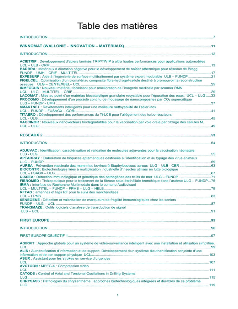 Table des matières INTRODUCTION ....................................................................................................................................................................7 WINNOMAT (WALLONIE - INNOVATION – MATÉRIAUX)......................................................................................11 INTRODUCTION ..................................................................................................................................................................12 ACIETRIP : Développement d’aciers laminés TRIP/TWIP à ultra hautes performances pour applications automobiles UCL – ULB - CRM................................................................................................................................................................13 BARBRA : Matériaux à dilatation négative pour le développement de boîtier athermique pour réseaux de Bragg. FUNDP – UMH – CRIF – MULTITEL ...................................................................................................................................17 EXPESURF : Aide à l’ingénierie de surface multitraitement par système expert modulable ULB – FUNDP.......................21 FIGELCEL : Optimisation d’un biomatériau composite fibre-hydrogel-cellule destiné à promouvoir la reconstruction osseuse ULG – CENTEXBEL– UCL .................................................................................................................................25 IRMFOCUS : Nouveau matériau focalisant pour amélioration de l’imagerie médicale par scanner RMN UCL – ULG – MULTITEL – CRIF .........................................................................................................................................29 LACOMAT : Mise au point d’un matériau biocatalytique granulaire recyclable pour l’épuration des eaux. UCL – ULG .....33 PROCOMO : Développement d’un procédé continu de moussage de nanocomposites par CO2 supercritique ULG – FUNDP - UMH ..........................................................................................................................................................37 SMARTNET : Revêtements intelligents pour une meilleure nettoyabilité de l’acier inox UCL – FUNDP – FUSAGX – CORI ......................................................................................................................................41 TITAERO : Développement des performances du Ti-LCB pour l’allégement des turbo-réacteurs UCL - ULG............................................................................................................................................................................45 VACCINOR : Nouveaux nanovecteurs biodégradables pour la vaccination par voie orale par ciblage des cellules M. UCL – ULG...........................................................................................................................................................................49 RESEAUX 2 .......................................................................................................................................................................53 INTRODUCTION ..................................................................................................................................................................54 ADJUVAC : Identification, caractérisation et validation de molécules adjuvantes pour la vaccination néonatale. ULB - ULG............................................................................................................................................................................55 APTARRAY : Elaboration de biopuces aptamériques destinées à l’identification et au typage des virus animaux ULG – FUNDP......................................................................................................................................................................59 AUREA : Prévention vaccinale des mammites bovines à Staphylococcus aureus ULG – ULB - CER ...............................63 BIOCONTR : Biotechnologies liées à multiplication industrielle d’insectes utilisés en lutte biologique UCL – FSAGX – ULG...........................................................................................................................................................67 DIASEA : Détection immunologique et génétique des pathogènes des fruits de mer ULG – FUNDP ................................71 FIBROMED : Thérapeutique pour le traitement de la fibrose sous-épithéliale bronchique dans l’asthme ULG – FUNDP...75 IRMA : Interface de Recherche Multimodale dans le contenu Audiovisuel UCL – MULTITEL – FUNDP – FPMS – ULG – HELB ..........................................................................................................79 RFTAG : antennes et tags RF pour le suivi des marchandises UCL – FPMS ........................................................................................................................................................................83 SENEGENE : Détection et valorisation de marqueurs de fragilité immunologiques chez les seniors FUNDP – ULG – UCL ..........................................................................................................................................................87 TRANSMAZE : Outils logiciels d’analyse de transduction de signal ULB – UCL ..........................................................................................................................................................................91 FIRST EUROPE ................................................................................................................................................................95 INTRODUCTION ..................................................................................................................................................................9
