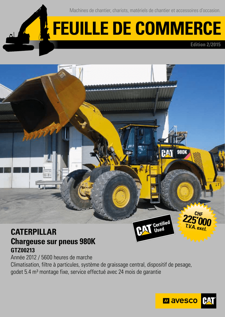 Machines de chantier, chariots, matériels de chantier et accessoires d’occasion. FEUILLE DE COMMERCE Edition 2/2015 CHF CATERPILLAR Chargeuse sur pneus 980K 225’000 T.V.A. ex cl. GTZ00213 Année 2012 / 5600 heures de marche Climatisation, filtre à particules, système de graissage central, dispositif de pesage, godet 5.4 m³ montage fixe, service effectué avec 24 mois de garantie Editorial L’achat d’une machine d’occasion est une affaire de confiance L’acquisition de machines de chantier neuves n’est pas toujours la solution la plus économique. Les machines d’occasion certifiées d’Avesco sont une option dans bien des cas, grâce à leurs prix intéressants à l’achat. Vous obtenez une machine qui a été remise à jour techniquement et optiquement selon les règles de l’art. Par notre offre, nous vous garantissons la sécurité nécessaire afin que votre acquisition reste rentable pendant toute la durée de fonctionnement. Cat Certified Used est le label de qualité pour les machines âgées de 5 ans et 7500 heures de marche maximum (machines compactes 3500 h). Ces machines sont désormais proposées avec une garantie de 24 mois sur la chaîne cinématique et les composants hydrauliques. Avec le certificat Avesco Approved, nous couvrons les machines Cat plus anciennes âgées jusqu’à 10 ans et 10000 heures de marche (machines compactes 6000 h) ainsi que toutes les autres marques d’Avesco, comme les chariots à fourche Yale, les compresseurs Kaeser et les tombereaux sur pneus Thwaites. Mais ce n’est pas tout! Avec l’achat d’une machines d’occasion, vous profitez automatiquement de tous les avantages d’Avesco: Notamment d’un service après-vente de tout premier choix effectué par nos techniciens, d’une excellente disponibilité des pièces de rechange et de nombreuses autres prestations de service à la clientèle. C’est avec plaisir que nous vous conseillons dans la recherche de la machine appropriée pour vous et votre domaine d’utilisation. Notre réseau s’étend bien au-delà des frontières. Contactez-nous pour une solution personnalisée. Votre équipe des machines d’occasion Avesco Cem Yalamanoglu, Chef de vente des machines d’occasion Sommaire Offres spéciales 3 Pelles sur chenilles et pelles mobiles 4–5 Pelles mobiles, chargeuses sur pneus, chargeuses sur chenille et tombereaux 6–7 Mini-pelles, machines compactes et rouleaux vibrants 8–9 Machines compactes et Worktools 10 – 11 Matériels de chantier 12 – 13 Chariots élévateurs 14 Vos contacts de vente Machines de chantier <10t Florian Baumgartner, 062 915 80 22 Machines de chantier <10t Cem Yalamanoglu, 062 915 80 26 Manutention, systèmes d‘énergie, tombereaux sur pneus, compresseurs Silvio Kamber, 062 915 80 27 Impressum Feuille de commerce Avesco – paraît en allemand, en français et en Italie semestriellement avec un tirage de 2092 exemplaires. Illustration et texte: Avesco AG. Imprimerie: Grico-Druck AG, Welschenrohr Offres spéciales 3 CATERPILLAR Mini-pelle 305.5D CR FLZ00601 Année 2011 / 2176 heures de marche Poids en ordre de marche 5360 kg, filtre à particules, attache rapide mécanique, godet de talutage neuf 1200 mm, godet rétro 400 + 600 mm, hydraulique complète, peinture neuve, jeu d'équipements supprimé, chenilles neuves, service effectué avec 12 mois de garantie CHF 49’900 T.V.A. ex c l. THWAITES Tombereau sur pneus MACH664 SLCM664Z1210C3675 Année 2012 / 370 heures de marche Moteur Perkins, 70 kW, filtre à particules, charge utile 6000 kg, volume de la benne 3.15 m3, CTA, service effectué avec 6 mois de garantie CHF A OV PPR ED 45’900 T.V.A. ex c l. 4 Pelles sur chenilles et pelles mobiles CHF CHF CATERPILLAR Pelle hydraulique 314D-LCR 85’000 T.V.A. ex c l. TXN00219 Année 2010 / 3129 heures de marche Climatisation, hydraulique complète, filtre à particules, lame de stabilisation, patins des chenilles 700 mm, attache rapide CW20s, godet de talutage 1200 mm, godet rétro 650 mm, service effectué avec 24 mois de garantie CATERPILLAR Pelle hydraulique 329E-LN RLD00116 Année 2011 / 2500 heures de marche Climatisation, hydraulique complète, filtre à particules, huile hydraulique biodégradable, attache rapide CW45s, godet de talutage 1600 mm, godet rétro 1500 mm, service effectué avec 24 mois de garantie CHF CHF CATERPILLAR Pelle hydraulique 321D-LCR 103’000 T.V.A. ex cl. TXA00188 Année 2010 / 3320 heures de marche Climatisation, hydraulique complète, filtre à particules, attache rapide CW40s, godet de talutage 1600 mm, godet rétro 1200 mm, service effectué avec 24 mois de garantie 185’000 T.V.A. ex cl. CATERPILLAR Pelle hydraulique 336D-L 199’000 T.V.A. ex cl. PPN00646 Année 2011 / 2200 heures de marche Climatisation, hydraulique complète, filtre à particules, attache rapide CW45s, godet de talutage 1800 mm, godet rétro 1400 mm, service effectué avec 24 mois de garantie Pelles sur chenilles et pelles mobiles 5 CHF CHF KOBELCO Pelle hydraulique SK235 54’500 T.V.A. ex c l. YF01-00979 Année 2002 / 8624 heures de marche Climatisation, hydraulique complète, Oilquick, godet rétro 1200 mm, godet de talutage 1600 mm, service effectué, sans garantie CATERPILLAR Pelle de manutention 315D-L MH W2T00350 Année 2008 / 9315 heures de marche Climatisation, filtre à particules, hydraulique complète, cabine relevable, lame de stabilisation, chenilles en acier avec coussins caoutchouc, grappin CAT G310B à coquilles fermées, service effectué avec 24 mois de garantie l. LIEBHERR Pelle de manutention A924B K024588 Année 2005 / 12739 heures de marche Climatisation, cabine relevable, graissage central, balancier court avec attache Liquifix et plaque de montage supplémentaire, rallonge du balancier, grappin Poly, vendue sur place, sans garantie CHF 115’000 T.V.A. ex cl. 39’000 T.V.A. ex c A OV PPR ED CATERPILLAR Pelle de manutention M322D-MH CHF 89’000 T.V.A. ex c l. W2T00350 Année 2008 / 9315 heures de march