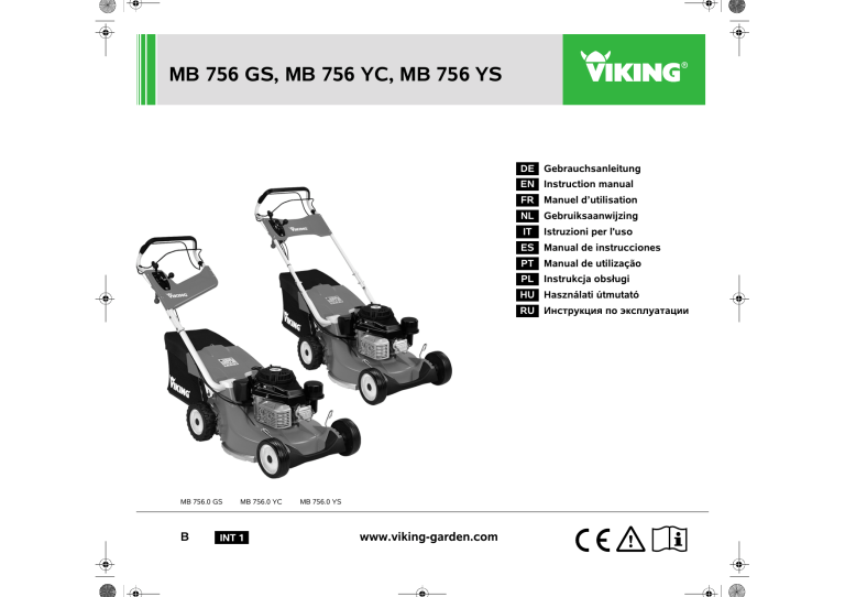 MB 756 GS, MB 756 YC, MB 756 YS DE Gebrauchsanleitung EN Instruction manual FR Manuel d’utilisation NL Gebruiksaanwijzing IT Istruzioni per l'uso ES Manual de instrucciones PT Manual de utilização PL Instrukcja obsługi HU Használati útmutató RU Инструкция по эксплуатации MB 756.0 GS B MB 756.0 YC MB 756.0 YS www.viking-garden.com 0478 111 9925 B. M2. A15. Eco. © 2015 VIKING GmbH, A-6336 Langkampfen / Kufstein 1 0478 111 9925 B 1 2 2 0478 111 9925 B 3 4 5 0478 111 9925 B 3 6 7 8 4 0478 111 9925 B 9 10 11 0478 111 9925 B 5 12 13 14 15 16 6 17 18 0478 111 9925 B 19 20 21 0478 111 9925 B 7 22 23 24 25 26 8 0478 111 9925 B 27 0478 111 9925 B 9 10 0478 111 9925 B Geschäftsführung 0478 111 9925 B - DE 18 19 19 20 20 20 20 20 21 21 21 21 22 22 22 22 23 23 27 27 28 28 28 28 29 29 29 30 31 31 32 23 Gedruckt auf chlorfrei gebleichtem Papier. Papier ist recycelbar. Schutzumschlag ist halogenfrei. 11 DE EN FR NL IT 12 12 13 13 14 14 15 15 15 17 24 24 24 25 25 25 25 25 26 26 26 ES Viel Freude mit Ihrem VIKING Gerät wünscht Ihnen 12 12 PT Wenn Sie Fragen zu Ihrem Gerät haben, wenden Sie sich bitte an Ihren Händler oder direkt an unsere Vertriebsgesellschaft. Zu dieser Gebrauchsanleitung Allgemein Anleitung zum Lesen der Gebrauchsanleitung Gerätebeschreibung Zu Ihrer Sicherheit Allgemein Tanken – Umgang mit Benzin Bekleidung und Ausrüstung Transport des Geräts Vor der Arbeit Während der Arbeit Wartung und Reparaturen Lagerung bei längeren Betriebspausen Entsorgung Symbolbeschreibung Lieferumfang Gerät betriebsbereit machen Lenker montieren Schutzschlauch montieren Einzelrad-Schnitthöhenverstellung Höhenverstellung Lenker Kraftstoff und Motoröl Grasfangkorb zusammenbauen Grasfangkorb ein- und aushängen Messer-Brems-Kupplung (BBC) Hinweise zum Arbeiten Gerät in Betrieb nehmen Verbrennungsmotor starten Mähmesser einkuppeln Mähmesser auskuppeln Messer-Brems-Kupplung (BBC) kontrollieren 23 24 24 PL Dieses Produkt wurde nach modernsten Fertigungsverfahren und umfangreichen Qualitätssicherungsmaßnahmen hergestellt, denn erst dann, wenn Sie mit Ihrem Gerät zufrieden sind, ist unser Ziel erreicht. 1. Inhaltsverzeichnis Fahrantrieb einschalten Fahrantrieb ausschalten Verbrennungsmotor abstellen Grasfangkorb (textil) mit Staubschutzgewebe Wartung Gerät reinigen Räder Verbrennungsmotor Getriebe Messer-Brems-Kupplung warten Messerverschleiß prüfen Mähmesser aus- und einbauen Mähmesser schärfen Seilzüge warten Aufbewahrung und Stilllegung (Winterpause) Transport Gerät verzurren Gerät anheben oder tragen Umweltschutz Verschleiß minimieren und Schäden vermeiden Übliche Ersatzteile CE-Konformitätserklärung des Herstellers Technische Daten Fehlersuche Serviceplan Übergabebestätigung Servicebestätigung HU vielen Dank, dass Sie sich für ein Qualitätserzeugnis der Firma VIKING entschieden haben. RU Verehrte Kundin, lieber Kunde, Kennzeichnung von Textabschnitten: Texte mit Bildbezug: Die beschriebenen Anweisungen können wie in den folgenden Beispielen gekennzeichnet sein. Abbildungen, die den Gebrauch des Geräts erklären, finden Sie ganz am Anfang der Gebrauchsanleitung. 2.1 Allgemein Handhabungsschritte, die das Eingreifen des Benutzers erfordern: Diese Gebrauchsanleitung ist eine Originalbetriebsanleitung des Herstellers im Sinne der EG-Richtlinie 2006/42/EC. ● Schraube (1) mit einem Schraubenzieher lösen, Hebel (2) betätigen ... Das Kamerasymbol dient zur Verknüpfung der Bilder auf den Bildseiten mit dem entsprechenden Textteil in der Gebrauchsanleitung. 2. Zu dieser Gebrauchsanleitung VIKING arbeitet ständig an der Weiterentwicklung seiner Produktpalette; Änderungen des Lieferumfanges in Form, Technik und Ausstattung müssen wir uns deshalb vorbehalten. Aus den Angaben und Abbildungen dieses Heftes können aus diesem Grund keine Ansprüche abgeleitet werden. 2.2 Anleitung zum Lesen der Gebrauchsanleitung Bilder und Texte beschreiben bestimmte Handhabungsschritte. Sämtliche Bildsymbole, die auf dem Gerät angebracht sind, werden in dieser Gebrauchsanleitung erklärt. Blickrichtung: Blickrichtung bei Verwendung „links“ und „rechts“ in der Gebrauchsanleitung: Der Benutzer steht hinter dem Gerät und blickt in Fahrtrichtung vorwärts. Kapitelverweis: Auf entsprechende Kapitel und Unterkapitel für weitere Erklärungen wird mit einem Pfeil verwiesen. Das folgende Beispiel zeigt einen Verweis auf ein Kapitel: (Ö 2.1) 12 Generelle Aufzählungen: – Einsatz des Produkts bei Sport- oder Wettbewerbsveranstaltungen 3. Gerätebeschreibung 1 Texte mit zusätzlicher Bedeutung: Textabschnitte mit zusätzlicher Bedeutung werden mit einem der nachfolgend beschriebenen Symbole gekennzeichnet, um diese in der Gebrauchsanleitung zusätzlich hervorzuheben. Gefahr! Unfall- und schwere Verletzungsgefahr für Personen. Ein bestimmtes Verhalten ist notwendig oder zu unterlassen. Warnung! Verletzungsgefahr für Personen. Ein bestimmtes Verhalten verhindert mögliche oder wahrscheinliche Verletzungen. Vorsicht! Leichte Verletzungen bzw. Sachschäden können durch ein bestimmtes Verhalten verhindert werden. 1 1 2 3 4 4 5 6 7 8 9 10 11 12 13 Bügel Messerstopp Bügel Fahrantrieb Hebel Gasverstellung MB 756.0 GS: Hebel Gangschaltung MB 756.0 YS, MB 756.0 YC: Hebel Fahrgeschwindigkeit Hebel Messerkupplung Lenker Schraube Lenkerhöhenverstellung Einzelrad-Schnitthöhenverstellung Stoßstange Zündkerzenstecker Auswurfklappe Grasfangkorb (textil) mit Staubschutzgewebe Typenschild Hinweis Information für eine bessere Nutzung des Gerätes und um mögliche Fehlbedienungen zu vermeiden. 0478 111 9925 B - DE Diese Vorsichtsmaßnahmen sind für Ihre Sicherheit unerlässlich, die Auflistung ist jedoch nicht abschließend. Benutzen Sie das Gerät stets mit Vernunft und Verantwortungsbewusstsein und denken Sie daran, dass der Benutzer für Unfälle mit anderen Personen oder deren Eigentum verantwortlich ist. Machen Sie sich mit den Bedienteilen und dem Gebrauch de