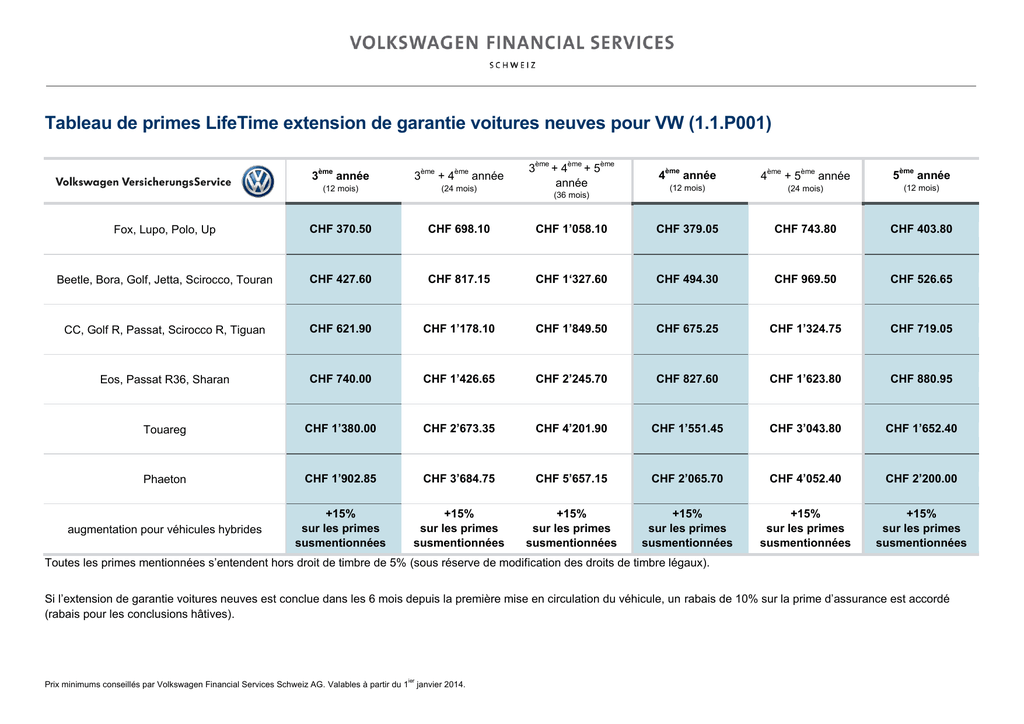 Tableau de primes LifeTime extension de garantie voitures neuves pour VW (1.1.P001) 3ème année 3ème + 4ème année (12 mois) (24 mois) 3ème + 4ème + 5ème année Fox, Lupo, Polo, Up CHF 370.50 CHF 698.10 Beetle, Bora, Golf, Jetta, Scirocco, Touran CHF 427.60 CC, Golf R, Passat, Scirocco R, Tiguan 4ème année 4ème + 5ème année 5ème année (12 mois) (24 mois) (12 mois) CHF 1’058.10 CHF 379.05 CHF 743.80 CHF 403.80 CHF 817.15 CHF 1‘327.60 CHF 494.30 CHF 969.50 CHF 526.65 CHF 621.90 CHF 1’178.10 CHF 1’849.50 CHF 675.25 CHF 1’324.75 CHF 719.05 Eos, Passat R36, Sharan CHF 740.00 CHF 1’426.65 CHF 2’245.70 CHF 827.60 CHF 1’623.80 CHF 880.95 Touareg CHF 1’380.00 CHF 2’673.35 CHF 4’201.90 CHF 1’551.45 CHF 3’043.80 CHF 1’652.40 Phaeton CHF 1’902.85 CHF 3’684.75 CHF 5’657.15 CHF 2’065.70 CHF 4’052.40 CHF 2’200.00 augmentation pour véhicules hybrides +15% sur les primes susmentionnées +15% sur les primes susmentionnées +15% sur les primes susmentionnées +15% sur les primes susmentionnées +15% sur les primes susmentionnées +15% sur les primes susmentionnées (36 mois) Toutes les primes mentionnées s’entendent hors droit de timbre de 5% (sous réserve de modification des droits de timbre légaux). Si l’extension de garantie voitures neuves est conclue dans les 6 mois depuis la première mise en circulation du véhicule, un rabais de 10% sur la prime d’assurance est accordé (rabais pour les conclusions hâtives). Prix minimums conseillés par Volkswagen Financial Services Schweiz AG. Valables à partir du 1ier janvier 2014. Tableau de primes LifeTime garantie fonctionnelle et garantie groupe de pièces pour VW (2.1.P006/3.1.P012) Garantie groupe de pièces Garantie fonctionnelle assurable jusqu‘à assurable jusqu‘à 4 ans/100‘000 km 12 mois 3 ans/100‘000 km 24 mois 6 ans/140‘000 km 12 mois 5 ans/140‘000 km 24 mois 10 ans/160‘000 km* 12 mois Fox, Lupo, Polo, Up CHF 501.45 CHF 978.00 CHF 601.70 CHF 1’173.60 CHF 492.40 Beetle, Bora, Golf, Jetta, Scirocco, Touran CHF 599.15 CHF 1‘168.30 CHF 718.95 CHF 1‘401.95 CHF 551.45 CC, Golf R, Passat, Scirocco R, Tiguan CHF 734.55 CHF 1’432.30 CHF 881.50 CHF 1’718.75 CHF 627.60 Eos, Passat R36, Sharan CHF 768.00 CHF 1’497.40 CHF 921.60 CHF 1’796.90 CHF 740.95 Touareg CHF 1’516.30 CHF 2’957.15 CHF 1’819.55 CHF 3’548.55 CHF 1’226.65 Phaeton CHF 2’220.00 CHF 4’329.40 CHF 2’664.00 CHF 5’195.30 CHF 1’410.45 augmentation pour véhicules hybrides +15% sur les primes susmentionnées +15% sur les primes susmentionnées +15% sur les primes susmentionnées +15% sur les primes susmentionnées +15% sur les primes susmentionnées Toutes les primes mentionnées s’entendent hors droit de timbre de 5% (sous réserve de modification des droits de timbre légaux). *Si le véhicule a bénéficié sans interruption depuis sa première mise en circulation d’une garantie du groupe VW, la garantie groupe de pièces peut être prolongée à chaque fois de 12 mois durant la vie du véhicule. Prix minimums conseillés par Volkswagen Financial Services Schweiz AG. Valables à partir du 1ier janvier 2014.