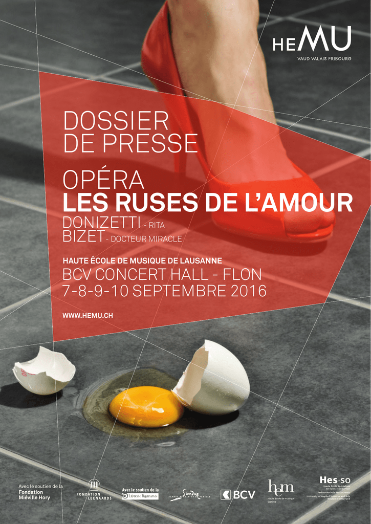 DOSSIER DE PRESSE OPÉRA LES RUSES DE L’AMOUR DONIZETTI - RITA BIZET- DOCTEUR MIRACLE HAUTE ÉCOLE DE MUSIQUE DE LAUSANNE BCV CONCERT HALL - FLON 7-8-9-10 SEPTEMBRE 2016 WWW.HEMU.CH Avec le soutien de la Fondation Miéville Hory DOSSIER DE PRESSE « LES RUSES DE L’AMOUR » - OPÉRA LES RUSES DE L’AMOUR SOMMAIRE 02 | INFORMATIONS PRATIQUES 03 | PROJET LYRIQUE 2016 03 | RITA – ŒUVRE, PERSONNAGES, DISTRIBUTION 04 | DOCTEUR MIRACLE – ŒUVRE, PERSONNAGES, DISTRIBUTION 05 | ORCHESTRE DE L’HEMU 06 | NOTE D’INTENTION DU METTEUR EN SCÈNE, ARMAND DELADOËY 07 | NOTE D’INTENTION DU SCÉNOGRAPHE, DAVID DEPPIERRAZ 08 | BIOGRAPHIES : > AURÉLIEN AZAN ZIELINSKI, DIRECTION MUSICALE | 08 > ARMAND DELADOËY, MISE EN SCÈNE | 09 > TODD CAMBURN, DIRECTION ARTISTIQUE | 10 > DAVID DEPPIERRAZ, SCÉNOGRAPHIE | 11 > NICOLAS MAYORAZ, CRÉATION LUMIÈRES | 11 12 | ARCHIVES PHOTOGRAPHIQUES DES PRODUCTIONS LYRIQUES DE L’HEMU 1 DOSSIER DE PRESSE « LES RUSES DE L’AMOUR » - OPÉRA LES RUSES DE L’AMOUR Une production de la Haute Ecole de Musique de Lausanne (HEMU) En collaboration avec la Haute Ecole de Musique de Genève (HEM – Genève) RITA | GAETANO DONIZETTI Opéra comique en un acte sur un livret de Gustave Vaëz. Création : 1860, France Langue originale : Français Maison d'opéra de la production originale : L'Opéra-Comique DOCTEUR MIRACLE | GEORGES BIZET Opéra comique en un acte sur un livret de Léon Battu et Ludovic Halévy Année de création : 1857, France Langue originale : Français Maison d'opéra de la production originale : Théâtre des Bouffes Parisiens Direction artistique, Todd Camburn Direction musicale, Aurélien Azan Zielinski Mise en scène, Armand Deladoëy Solistes, douze chanteurs de l’HEMU et la HEM – Genève Orchestre, quinze musiciens instrumentistes de l’HEMU Chefs assistants, Lucie Leguay, Théo Schmitt Chef de chant, Florent Lattuga-Duyck Assistanat à la mise en scène, Renaud Berger Scénographie, David Deppierraz Lumières, Nicolas Mayoraz Costumes, Anna van Bree Maquillages et coiffures, Julie Monot Accessoires et régie générale, Renaud Berger Production et administration, Claudia Santucci Durée, env. 2h05 (succession des deux opéras, entracte compris) Dates représentations Me 7 septembre 2016 Je 8 septembre 2016 Ve 9 septembre 2016 Sa 10 septembre 2016 première (privée) 20:00 – – – scolaires – 14:00 & 15:30 14:00 & 15:30 – publiques – 20:00 20:00 20:00 Lieu, BCV Concert hall, Voie du Chariot 23, Lausanne-Flon Tarifs, CHF 15.- tarif normal / CHF 10.- AVS, étudiants, enfants jusqu’à 16 ans Billetterie, Starticket : www.starticket.ch ou Starticket callcenter 0900 325 325 (CHF1.19/min depuis poste fixe) ou points de vente Starticket (la Poste, Manor, Coop City) 2 DOSSIER DE PRESSE « LES RUSES DE L’AMOUR » - OPÉRA PROJET LYRIQUE 2016 Chaque année, l’HEMU et la HEM – Genève s’associent pour monter une production lyrique et permettre à leurs étudiants – instrumentistes et chanteurs – de vivre l’expérience de la scène et de la fosse dans des conditions professionnelles. L’encadrement des futurs musiciens se fait par une équipe réunie pour l’occasion et composée de membres reconnus, tous issus du milieu artistique et théâtral. Après avoir produit, avec succès, A Midsummer Night’s Dream de Britten (2008) et Don Giovanni de Mozart (2010) au Théâtre du Jorat à Mézières, La petite renarde rusée de Leoš Janáček au Théâtre Crochetan à Monthey (2012) et The Turn of the Screw de Benjamin Britten au BCV Concert Hall (2014), l’HEMU présente cette année deux opéras comiques. RITA | GAETANO DONIZETTI L’ARGUMENT Rita, tenancière d’une auberge a épousé en secondes noces Pépé. A la maison, elle porte la culotte et Pépé n’a qu’à bien se tenir s’il ne veut pas être battu. Un jour, Gasparo s’arrête à l’auberge. Il reconnaît en Rita son ex-femme qu’il croyait morte. Il met alors sur pied une ruse pour récupérer son contrat de mariage. Arrivera-t-il à ses fins ? LES PERSONNAGES Rita, veuve remariée, tenancière d’une auberge, soprano Pépé, mari en deuxième noce de Rita, ténor Gasparo, client de l’auberge, premier mari de Rita, baryton DISTRIBUTION 7 sept. | 20:00 8 sept. | 14:00 & 15:30 9 sept. | 20:00 8 sept. | 20:00 9 sept. | 14:00 & 15:30 10 sept. | 20:00 Rita Olivia Doutney Iga Caban Pépé Yi An Chen Hoël Troadec Gasparo Anthony Rivera Anthony Rivera 3 DOSSIER DE PRESSE « LES RUSES DE L’AMOUR » - OPÉRA DOCTEUR MIRACLE | GEORGES BIZET L’ARGUMENT Silvio, un jeune capitaine, s’est épris de Laurette, la fille d’un Podestat qui déteste les militaires. Pour obtenir sa main, Silvio met en place une ruse. Il se déguise en charlatan le « Docteur Miracle », puis se fait engager comme domestique chez le Podestat et lui sert une omelette empoisonnée. Il redevient ensuite le « Docteur Miracle », sauve le Podestat. Ce dernier lui donne alors sa fille sans se douter, bien sûr, que le Docteur Miracle n’est autre que Silvio. LES PERSONNAGES Silvio, officier, Pasquin, domestique et Docteur Miracle, ténor Laurette, soprano Podestat, père de Laurette, baryton Véronique, mère de Laurette, soprano DISTRIBUTION 7 sept. | 20:00 8 sept. | 14:00 & 15:30 9 sept. | 20:00 8 sept. | 20:00 9 sept. | 14:00 & 15:30 10 sept. | 20:00 Laurette Anne-Sophie Petit Sarah Anne Worms Véronique Zoéline Troilliet Marie Bochelen Silvio, Pasquin, Docteur Miracle Hoël Troadec Christian Joël Podestat Alban Legos Mohammed Haidar 4 DOSSIER DE PRESSE « LES RUSES DE L’AMOUR » - OPÉRA ORCHESTRE DE L’HEMU Violons I Akiko Shimizu Anna Egholm Violons II Sandra Parra Munoz Anne-Sophie Simons Alto Romain Roussel Violoncelle Cyprien Lengagne Contrebasse Bérénice Lallemant Flûte Elia Guglielmo Hautbois Barbara Stegemann Clarinette Ema Freitas Gonçalves Basson Lucas Guignard Cors Yascha Israelievitch Yasmine Siffointe Trompette Laura Crausaz Percussion Mathis Pellaux 5 DOS