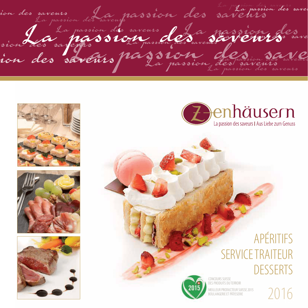 APÉRITIFS SERVICE TRAITEUR DESSERTS CONCOURS SUISSE DES PRODUITS DU TERROIR MEILLEUR PRODUCTEUR SUISSE 2015 BOULANGERIE ET PÂTISSERIE 2016 2015 2 Chère cliente, cher client, Quand la passion rencontre l’innovation et le dynamisme, une belle recette prend forme. Fondée il y a plus de 30 ans, l’entreprise Zenhäusern Frères est à l’image de la famille qu’elle représente. Ensemble avec nos 340 employés, nous vivons nos valeurs et nous nous engageons pour vous, avec passion. Dynamique Chaque mois, nous commercialisons cinq nouveaux produits et nos cartes des mets s’enrichissent de nouvelles créations. Notre service traiteur est au front chaque semaine pour différents événements. Lancé en 2011 avec la commune de Sion, nos ‘’Croustilles de Sion’’ sont une véritable success story. Voilà, un échantillon de ce qui fait la diversité et la richesse de notre assortiment. Premium Remporter des prix n’est que la face immergée de notre volonté de viser l’excellence. Le jury du Concours suisse des produits du terroir nous a décerné le prix spécial de ‘’Meilleur producteur suisse’’ dans la catégorie des produits boulangers et pâtissiers pour 2015. Depuis sa création en 2006, nous avons remporté des distinctions dans différentes catégories lors du Swiss Bakery Trophy (Champion Cantonal 2012). En 2009, nous avons reçu le «Prix Sommet UBS» comme «ambassadeur» économique du Valais. En 2013, nous avons décroché la «couronne boulangère», attribuée au niveau national par nos pairs. Nos apprentis et employés se distinguent, régulièrement, en obtenant de brillants résultats aux examens professionnels. Fiers de notre métier d’artisan, nous valorisons l’authenticité et la tradition. En ce sens, nous avons entrepris de redonner ses lettres de noblesse au seigle. De là est né la gamme 1815, qui fait vivre le terroir local. Finalement être «premium» c’est assurer un service à la clientèle tous les jours de l’année. Amabilité et sens de l’accueil font partie de nos standards de qualité. Fiable Nous organisons régulièrement des contrôles de nos produits et de nos magasins et notre personnel est formé pour renseigner la clientèle de façon professionnelle. Nous portons également un accent particuler aux aspects liés à la sécurité alimentaire. Mais, une entreprise c’est avant tout des femmes et des hommes, ils sont les acteurs de notre succès. Chacun est un maillon essentiel de cette grande chaîne. Actuellement 12 apprentis sont en formation et plus de 20 métiers sont représentés dans la grande famille Zenhäusern. Service traiteur Laissez-vous guider par notre conseiller pour imaginer et construire ensemble l’évènement gastronomique qui vous convient. Du buffet apéritif jusqu’au banquet de mariage, nos prestations se veulent à l’écoute de vos souhaits. Avec rigueur et créativité, nous offrons un service personnalisé et global. Pour 2016, nous nous engageons encore plus, pour être au cœur de la vie des Valaisans car nous aimons et sommes fiers de notre canton… de nos racines. Gerhard Zenhäusern Directeur général 3 SOMMAIRE APÉRITIFS APÉRITIFS FROIDS VERRINES & SALADINES APÉRITIFS CHAUDS NOS SUGGESTIONS TOURTES ITIFS DESSERTS OISSONS MATÉRIEL MATÉRIEL 5 6 19 21 24 26 TOURTES DE MARIAGE 31 TARTES & GÂTEAUX BUFFET & DESSERTS 34 37 DOUCEURS 40 ENVIES PARTICULIÈRES 44 SERVICE TRAITEUR 46 ENTRÉES 47 PLATS PRINCIPAUX 50 DESSERTS SUR ASSIETTE 54 MENUS 56 BUFFETS 59 VINS BOISSONS PERSONNEL / MATÉRIEL CONDITIONS & CONTACT ACTIVITÉS 62 66 68 70 71 APÉRITIFS APÉRITIFS FROIDS Mini-canapés classiques - 5400 Pain toast beurré garni : salami, jambon, rôti, asperges, oeufs, tomates-mozzarella Fr. 1.70 / pce Mini-canapés valaisans - 5401 Pain de seigle beurré garni : jambon cru, viande séchée, fromage, lard Fr. 1.80 / pce 6 APÉRITIFS FROIDS Mini-canapés poisson - 5405 Pain toast beurré garni : truite fumée, thon, saumon, crevettes Fr. 1.80 / pce Mignardises salées - 5650 Trio figue au gorgonzola et lard Croustillant au fromage frais Seigle et son dôme de saumon Chou au jambon-curry Sablé au thon tomaté Mini chou aux crevettes Croquant aux œufs Bis pavot au chorizo Fr. 1.70 / pce 7 APÉRITIFS FROIDS Mignardises salées du terroir - 5645 Dôme de tartare de viande séchée Roulé au fromage du Valais Saucisse à l’ail et gelée de coing Fromage du Valais, croquant et confiture aux abricots du Valais Jambon cru du Valais et asperges Sérac et miel du Valais, poivré Chiffonnade de lard et confiture de pruneaux du Valais Fr. 2.50 / pce Feuilletés salés du terroir - 2823 Viande séchée et moutarde Jambon cru et asperges Herbes du Grand St-Bernard Abricot et lard Fromage du Valais Environ 8 à 10 pces pour 100 g Fr. 75.00 / kg 8 APÉRITIFS FROIDS Feuilletés salés - 2820 Mini-croissants au jambon - 2835 Environ 10 pces pour 100 g Fr. 68.00 / kg Roulades de seigle - 5612 Fines tranches de pain de seigle fourrées : viande séchée saumon fromage frais Fr. 1.00 / pce ille de Bron éda ze M Jambon-asperges Poulet-curry Croissant au jambon Fromage frais-pesto Rissole à la viande Saumon Environ 8 à 10 pces pour 100 g Fr. 68.00 / kg 9 NE W APÉRITIFS FROIDS Croustilles de Sion au fromage à raclette du Vallais - 5622 Croustilles de Sion (50g /pers.) avec Chutney maison (pommes ou tomate-abricot et herbes du grand St. Bernard) Fr. 4.70 / pers. Croustilles de Sion - 5607 Croustilles de Sion (50g /pers.) avec Chutney maison (pommes ou tomate-abricot et herbes du grand St. Bernard) Fr. 4.70 / pers. Tour sticks de seigle - 5605 Sticks de seigle (15 pces) fourrés : de jambon cru viande séchée fromage lard saucisse pour 4 à 5 personnes Fr. 30.50 10 APÉRITIFS FROIDS Pain party nordique - 5745 Fines tranches de pain nordique fourrées : tartare de saumon masse thon-tomaté céleri-rôti de porc pour 6 personnes Fr. 6.00 / pers. Pain party seigle - 5746 Fines tranches de pain de seigle fou