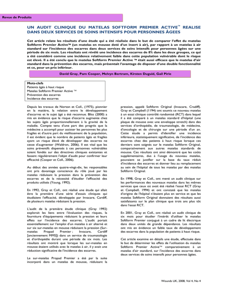 Revue de Produits UN AUDIT CLINIQUE DU MATELAS SOFTFORM PREMIER ACTIVE REALISE DANS DEUX SERVICES DE SOINS INTENSIFS POUR PERSONNES ÂGEES Cet article relate les résultats d’une étude qui a été réalisée dans le but de comparer l’effet du matelas Softform Premier Active (un matelas en mousse doté d’un insert à air), par rapport à un matelas à air standard sur l’incidence des escarres dans deux services de soins intensifs pour personnes âgées sur une période de six mois. Les résultats ont révélé une incidence des escarres de 8% dans les deux groupes, ce qui a été considéré comme une incidence relativement faible dans cette population vulnérable dont le risque est élevé. Il a été conclu que le matelas Softform Premier Active était aussi efficace que le matelas d’air standard dans la prévention des escarres, mais présentait l’avantage de disposer d’une double fonctionnalité et ce, pour un prix inférieur. David Gray, Pam Cooper, Melvyn Bertram, Kirsten Duguid, Gail Pirie Mots-clefs Patients âgés à haut risque Matelas Softform Premier Active Prévention des escarres Incidence des escarres Depuis les travaux de Norton et Coll., (1975), pionnier en la matière, la relation entre le développement d’escarres et le sujet âgé a été reconnue. Bliss (2000) a mis en évidence que le risque d’escarre augmente chez les sujets âgés proportionnellement à la gravité de la maladie. Compte tenu d’une part des progrès que la médecine a accompli pour assister les personnes les plus fragiles et d’autre part du vieillissement de la population, il est évident que le nombre de patients âgés et fragiles ayant un risque élevé de développer des escarres ne cesse d’augmenter (Waldron, 2006). Il est vital que les soins préventifs dispensés à ces personnes vulnérables soient fondés sur des directives cliniques existantes et fassent régulièrement l’objet d’audit pour confirmer leur efficacité (Cooper et Coll., 2006). Au début des années quatre-vingt-dix, les responsables ont pris davantage conscience du rôle joué par les matelas réduisant la pression dans la prévention des escarres et de la nécessité d’étudier l’efficacité des produits utilisés (Young, 1992). En 1992, Gray et Coll., ont réalisé une étude qui allait être la première d’une série d’essais cliniques qui étudiaient l’efficacité, développée par Invacare, Cardiff, de plusieurs matelas réduisant la pression. L’audit de la première étude clinique (Gray 1992) explorait les liens entre l’évaluation des risques, la fourniture d’équipements réduisant la pression et leurs effets sur l’incidence des escarres. L’audit portait essentiellement sur l’emploi d’un matelas à air alterné et sur six sur-matelas en mousse réduisant la pression (Surmatelas Propad Premier ; Invacare, Cardiff [anciennement MMS]) dans un service de traumatologie et d’orthopédie durant une période de six mois. Les résultats ont montré que lorsque les sur-matelas en mousse étaient utilisés avec le matelas à air, il y avait une réduction significative de l’incidence des escarres. Le sur-matelas Propad Premier a été par la suite incorporé dans un matelas de mousse, réduisant la pression, appelé Softform Original (Invacare, Cradiff). Gray et Campbell (1194) ont soumis ce nouveau matelas à un essai clinique contrôlé randomisé (RCT) dans lequel il a été comparé à un matelas standard d’hôpital (une plaque de mousse avec une enveloppe stretch) dans des services d’orthopédie, de traumatologie, de médecine, d’oncologie et de chirurgie sur une période d’un an. Cette étude a permis d’identifier une incidence inférieure, statistiquement significative, de l’incidence des escarres chez des patients à haut risque lorsque ces derniers sont soignés sur le matelas Softform Original, comparativement aux autres matelas standards de mousse. Ces résultats ont ainsi démontré que les coûts supplémentaires, dus à l’usage du nouveau matelas, pouvaient se justifier sur la base du taux réduit d’incidence des escarres et donner lieu au remplacement au sein de l’hôpital de tous les matelas par des matelas Softform Original. En 1998, Gray et Coll., ont mené un audit clinique sur les performances des nouveaux matelas dans les mêmes services que ceux où avait été réalisé l’essai RCT (Gray et Campbell, 1994) et ont constaté que les matelas d’origine de l’hôpital n’étaient plus en service et que les matelas Softform Original donnaient des résultats aussi satisfaisants sur le plan clinique que trois ans plus tôt dans l’essai RCT. En 2001, Gray et Coll., ont réalisé un audit clinique de six mois pour étudier l’intérêt d’utiliser le matelas Softform Premier conjugué à un cadre de lit électrique dans deux unités de grande dépendance. Les résultats ont mis en évidence un faible taux de développement des escarres dans la population de patients à haut risque. Cet article examine en détails une étude, effectuée dans le but de déterminer les effets de l’utilisation du matelas Softform Premier Active comparativement à un matelas d’air standard, sur l’incidence des escarres dans deux services de soins intensifs pour personnes âgées. Wounds UK, 2008, Vol 4, No 4 Revue de Produits Le matelas Softform Premier Active, constitué d’un matelas en mousse Softform Premier et d’un insert à air (Figure 2), est conçu pour un usage à la fois dans des établissements de soins intensifs et dans des collectivités. L’insert à air, qui alterne selon des cycles de 10 minutes, peut être activé par le branchement à un compresseur portatif, qui est mis en marche à l’aide d’un simple interrupteur (figure 3). Le compresseur comporte un logiciel capable d’évaluer le poids du patient, et ensuite de délivrer le volume d’air approprié pour créer une surface alternante destinée à des patients prés